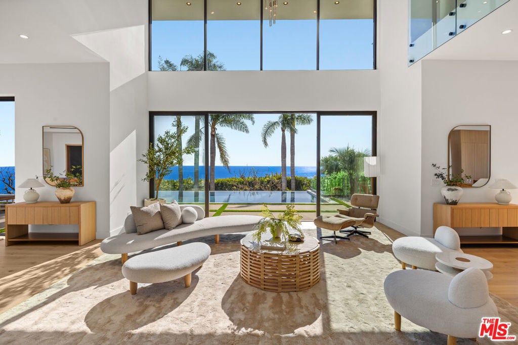 This newly built Malibu retreat offers resort style living with complete privacy and effortless indoor outdoor flow. A dramatic 24 foot glass gallery entry and open air atrium introduce the home's modern coastal design. The main level features an open dining and kitchen pavilion with a sculptural marble island, custom rift oak cabinetry, panel ready Thermador appliances, and pocketing walls of glass framing peaceful treetop and hillside views. The great room and adjoining bar lounge open to the infinity edge pool, with wraparound sliders capturing unobstructed ocean vistas. Just behind the bar sits a spacious bonus room ideal for a theater, game room, or entertainment space. A sleek fitness studio with its own en suite bath is located off the kitchen, creating a second large bonus space. The home offers four en suite bedroom suites and five baths, thoughtfully designed for comfort and privacy. Upstairs, the primary suite showcases floor to ceiling glass, pocket doors, and panoramic coastline views, along with a boutique style walk in closet and a spa inspired bath with soaking tub and dual vanities. All four suites include walk-in closets, and three enjoy private ocean view balconies. The grounds are tailored for relaxation and entertaining, featuring multiple terraces, flat grassy areas, lush landscaping for total seclusion, natural pathways, and an infinity pool that blends seamlessly into the horizon. Additional features include a detached garage and an oversized gated driveway with abundant parking. A rare combination of privacy, architecture, and coastal living perched above one of Malibu's most dramatic stretches of shoreline.