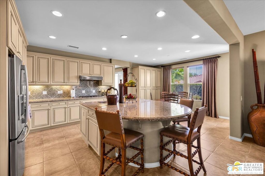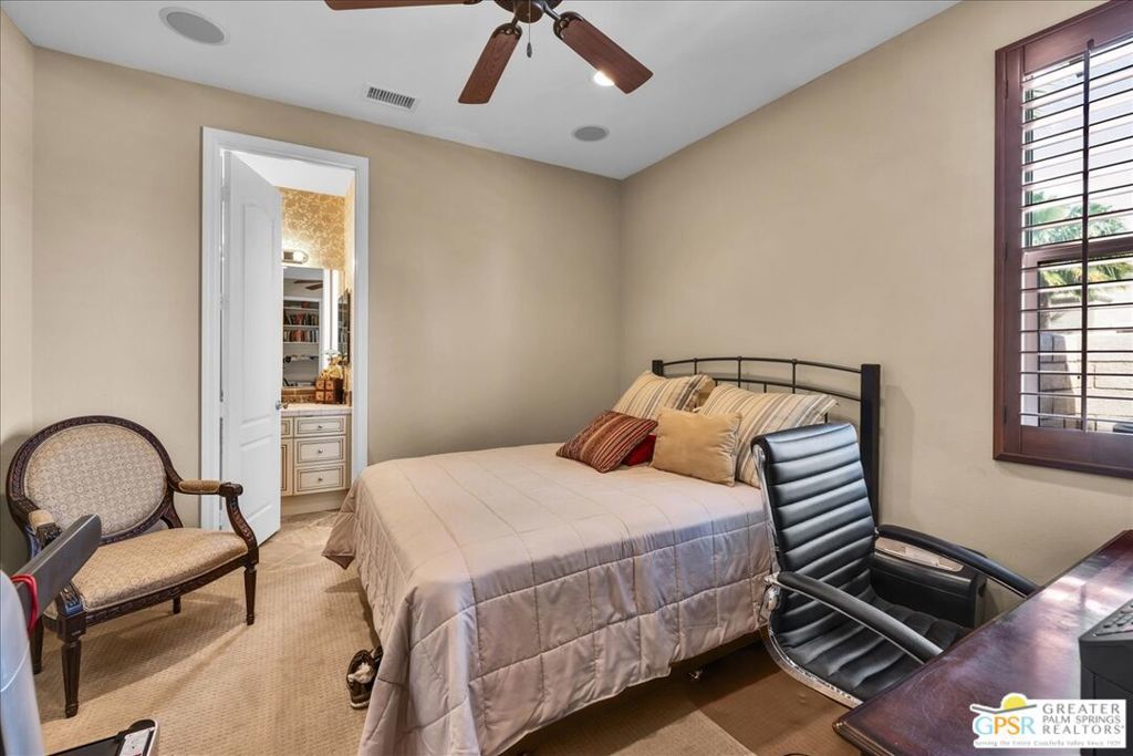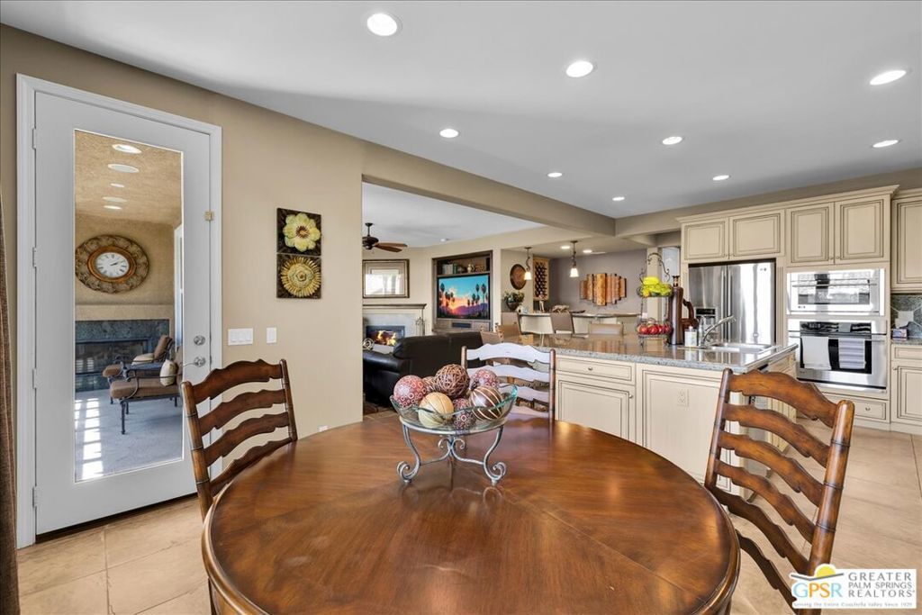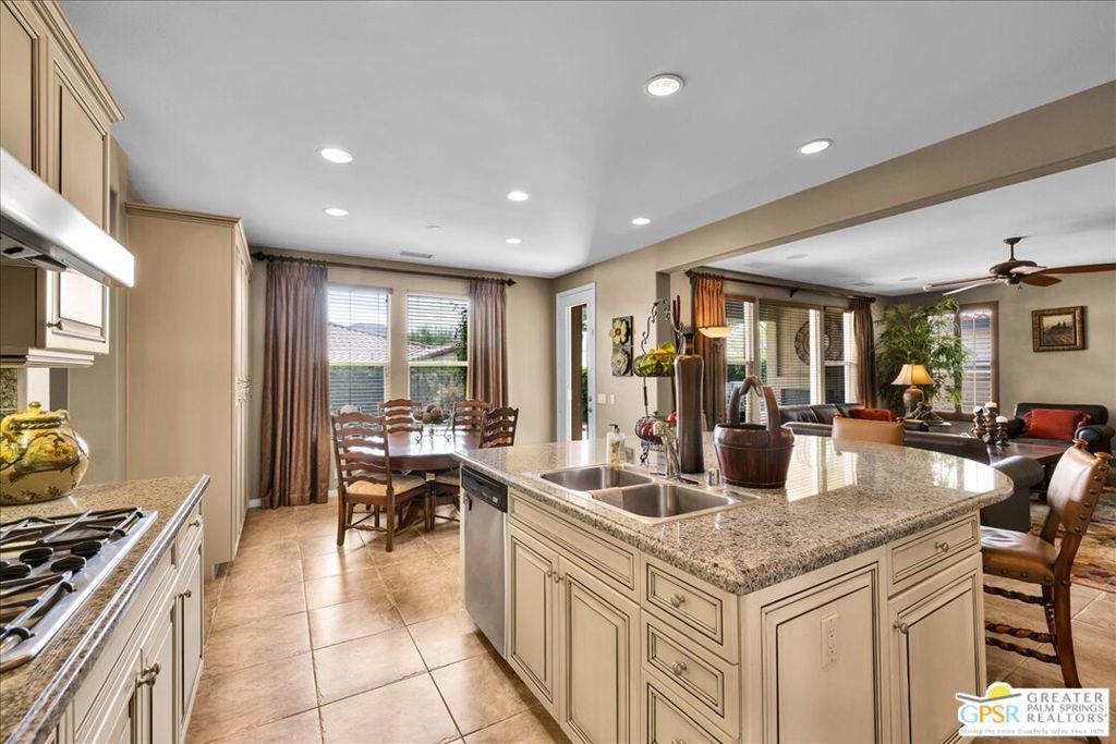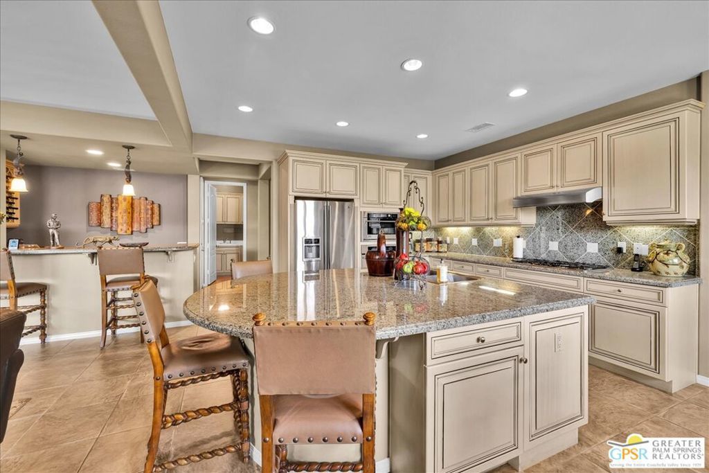 Bring your toothbrush and move right in to this fully turnkey furnished home in Aviara at Mission Shores. As a former model home for the community, this 4 bedroom, 3 1/2 bath corner home is highly upgraded with custom flooring and cabinetry, designer decor, high-end furnishings, even crown molding - a rarity in the desert - and too many options to mention. After admiring the commanding street presence, you can open the custom iron gate and choose to enter the home through either the front door or the attached casita bedroom with full bath. There is a combined great room, kitchen, wet bar area and a separate large formal dining room in addition to the very large primary bedroom with en-suite bath. The two guest bedrooms that share a Jack and Jill bath round out the inside. Outside is a sunny, south facing backyard with both southern and western mountain views, a pool and spa, and a built-in outdoor kitchen with grill, wine cooler and fireplace. Mission Shores LOW $390 HOA fees include front yard maintenance, an upgraded Spectrum TV/Streaming package, 1 gig of Internet speed and well funded reserves.