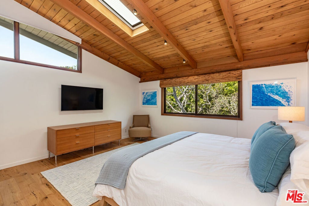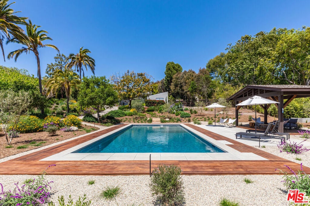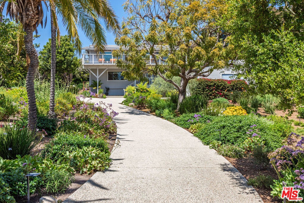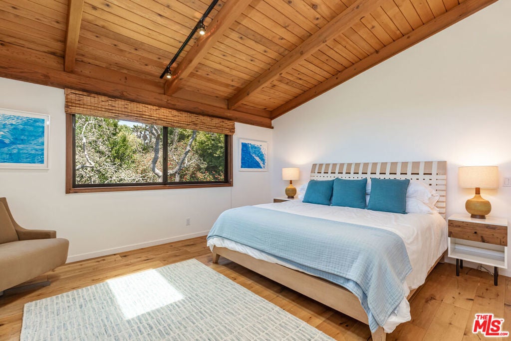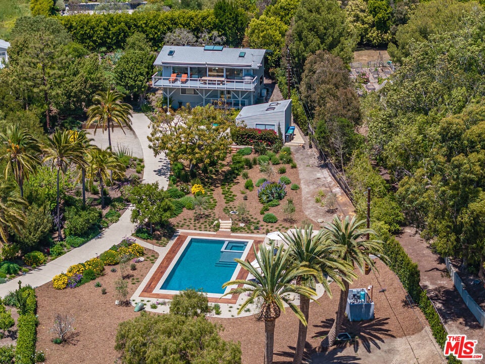 Leased July & August, available now till June 30th. Exquisite Point Dume Architectural Retreat with Riviera 2 Beach Access. Nestled in a serene garden oasis, this stunning Point Dume home blends seamless indoor-outdoor living with sophisticated entertaining spaces. A private, landscaped driveway leads to a tranquil setting featuring a new 20x45 lap pool, heated spa, and baja shelf perfect for families or social gatherings. Relax on the sun-soaked deck or unwind in the shaded gazebo.The open-concept upper level boasts a spacious living, dining, and kitchen area at treetop height, with soaring wood ceilings, skylights, hardwood floors, and a wall of windows opening to a full-width deck. Enjoy al fresco dining, lounging, or grilling with ocean breezes. The sleek chef's kitchen shines with a 7-seat island, built-in wine storage, leather banquette, premium stainless appliances, ample cabinetry, and a flatscreen TV.The upper-level owner's suite is a haven of luxury, featuring high wood ceilings, skylights, large windows, a flatscreen, and a spa-inspired bath with dual sinks and an expansive tiled shower. Downstairs, a grand foyer with a striking wood staircase connects three garden-view bedrooms, two baths, and a laundry room.Outside, stone paths weave through exquisitely landscaped grounds, linking front and back yards with inviting spaces for strolling or gathering. A detached two-car garage, outdoor shower, and ample guest parking add convenience. This Malibu sanctuary offers every comfort of coastal living, steps from Riviera 2 beach access to Little Dume Beach.