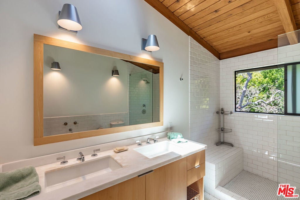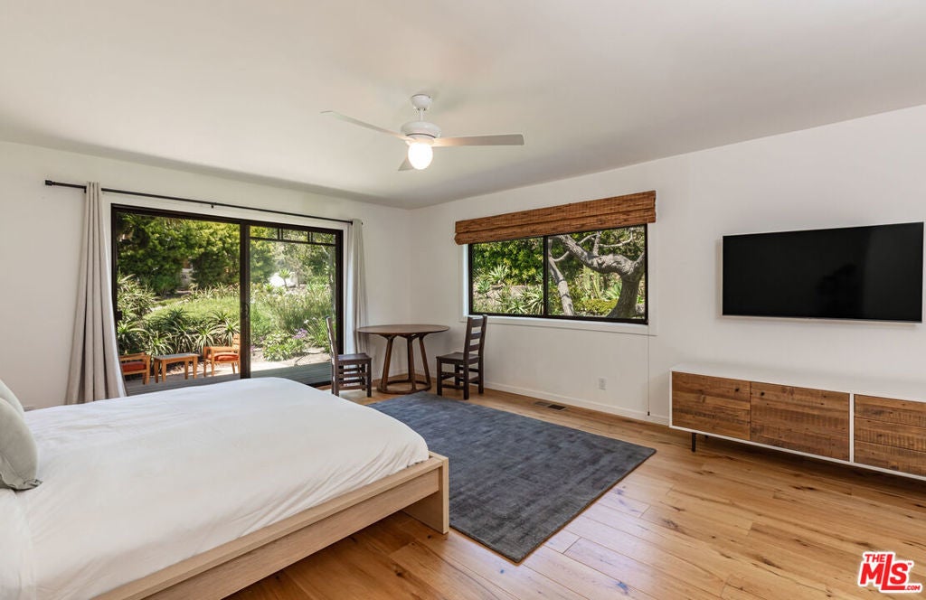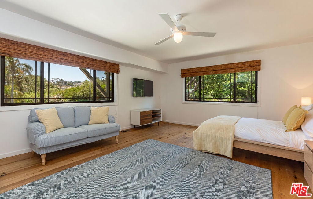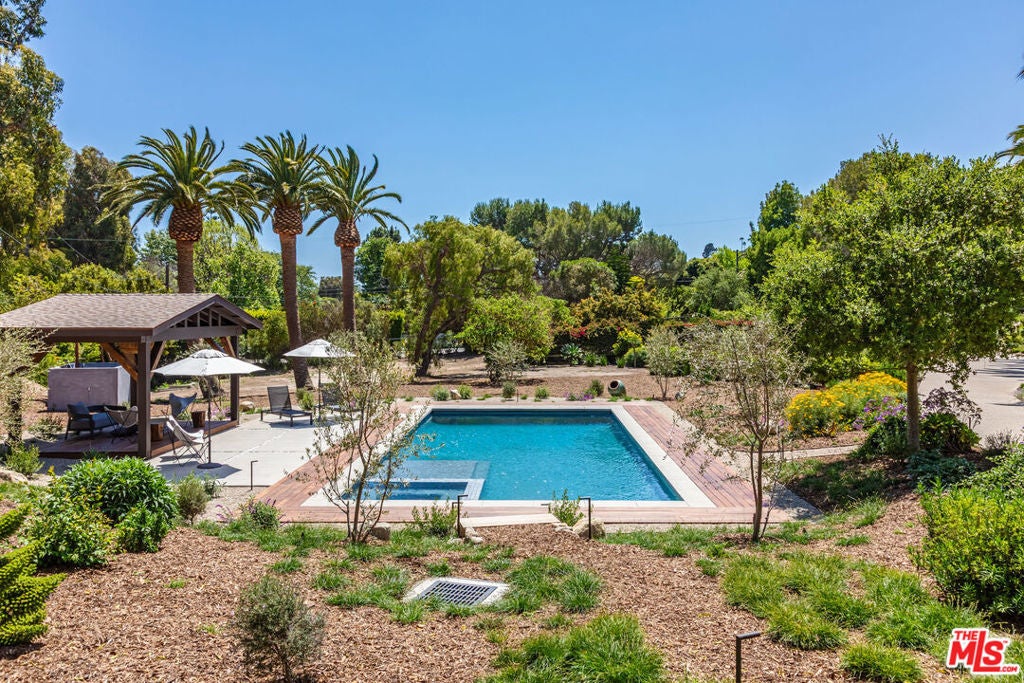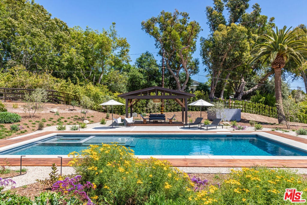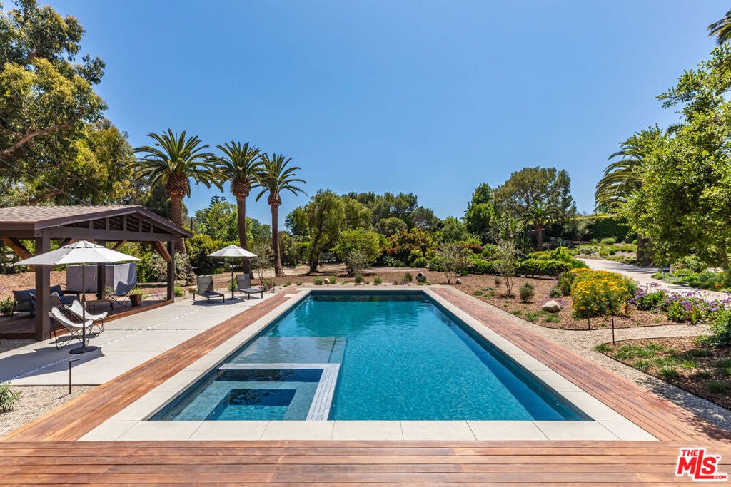 Leased July & August, available now till June 30th. Exquisite Point Dume Architectural Retreat with Riviera 2 Beach Access. Nestled in a serene garden oasis, this stunning Point Dume home blends seamless indoor-outdoor living with sophisticated entertaining spaces. A private, landscaped driveway leads to a tranquil setting featuring a new 20x45 lap pool, heated spa, and baja shelf perfect for families or social gatherings. Relax on the sun-soaked deck or unwind in the shaded gazebo.The open-concept upper level boasts a spacious living, dining, and kitchen area at treetop height, with soaring wood ceilings, skylights, hardwood floors, and a wall of windows opening to a full-width deck. Enjoy al fresco dining, lounging, or grilling with ocean breezes. The sleek chef's kitchen shines with a 7-seat island, built-in wine storage, leather banquette, premium stainless appliances, ample cabinetry, and a flatscreen TV.The upper-level owner's suite is a haven of luxury, featuring high wood ceilings, skylights, large windows, a flatscreen, and a spa-inspired bath with dual sinks and an expansive tiled shower. Downstairs, a grand foyer with a striking wood staircase connects three garden-view bedrooms, two baths, and a laundry room.Outside, stone paths weave through exquisitely landscaped grounds, linking front and back yards with inviting spaces for strolling or gathering. A detached two-car garage, outdoor shower, and ample guest parking add convenience. This Malibu sanctuary offers every comfort of coastal living, steps from Riviera 2 beach access to Little Dume Beach.