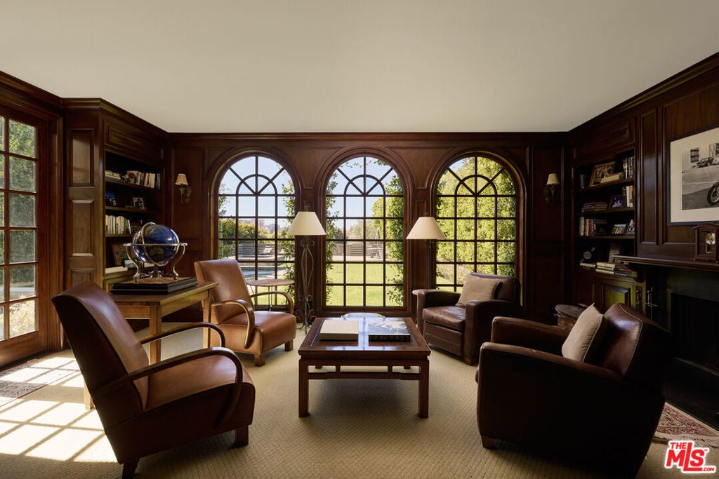 Moments walking distance to Holmby Park in the heart of Little Holmby stands a Spanish Colonial residence reconstructed by Sam Schatz. Empathetically reimagined, this elegant home blends timeless architecture with contemporary interiors, creating a residence that is both refined, private, and livable. Inside, the home opens to expansive living spaces designed for both relaxation and entertaining. A light-filled great room features a grand fireplace, custom built-ins, and seamless flow to a formal dining room that comfortably seats 10-12 guests and connects to the outdoor areas. A separate, light-filled family room sits just off the kitchen, offering an additional relaxed living space. Neutral tones add warmth throughout the home. A richly appointed library with floor-to-ceiling African mahogany bookshelves and its own fireplace offers a quiet retreat, while a warm-white kitchen is appointed with Brazilian quartzite countertops, bespoke cabinetry, wine storage, and an additional wet bar, ideal for entertaining. The grand staircase, accented by intricate ironwork and a statement chandelier, anchors the home with a sense of architectural character. There are three fireplaces throughout the home, including an outdoor fireplace adjacent to the outdoor dining area, enhancing the seamless indoor-outdoor lifestyle. A generous primary suite with cathedral ceilings features oversized doors leading to an ample stone-decked balcony and includes an adjoining spacious office, along with a well-appointed bathroom and closets. Four additional bedrooms round out the home's total of five bedrooms, with six bathrooms across approximately 5,844 square feet. Framed by tall palms and lush landscaping, the exterior makes a striking first impression with its classic lines, a spacious driveway, and manicured grounds that enhance the sense of privacy. The backyard is a true oasis, complete with a pool, sun deck, and multiple lounge areas for hosting large gatherings. The outdoor stone decks and pool decking are finished in Pennsylvania bluestone, adding both durability and timeless appeal. Unique two-tiered grounds host expansive guest quarters that include both a yoga studio and a gym, beautifully complemented by a sun terrace.Altogether, this property delivers a harmonious balance of classic elegance and modern comfort in a serene, resort-like setting, moments from Holmby Park and Beverly Hills, with additional space on the lower grounds to accommodate a future pickleball/sport court.