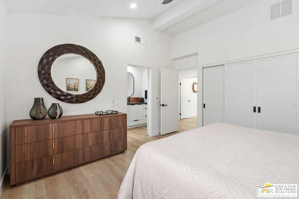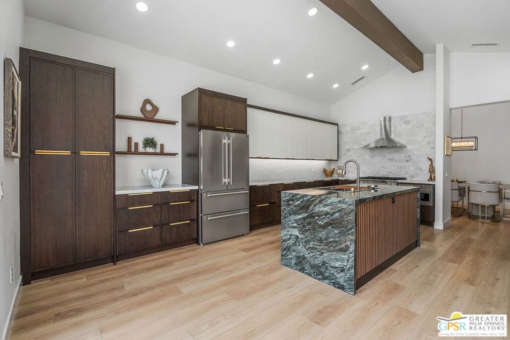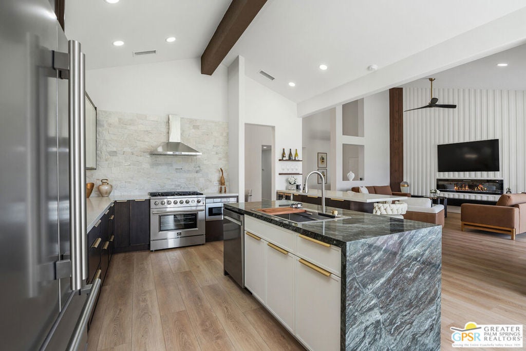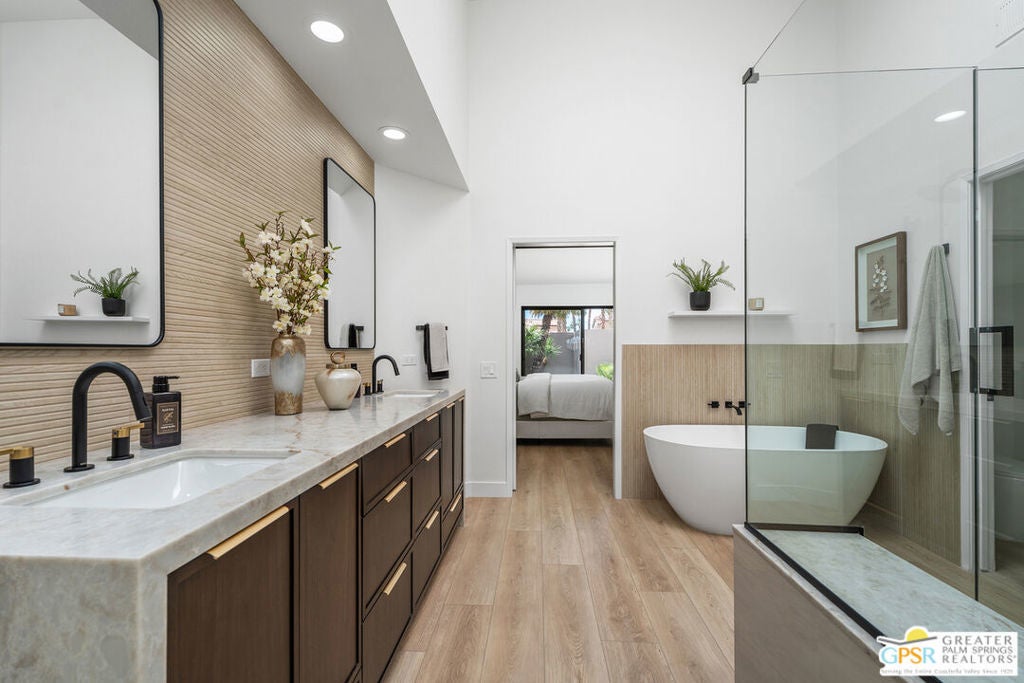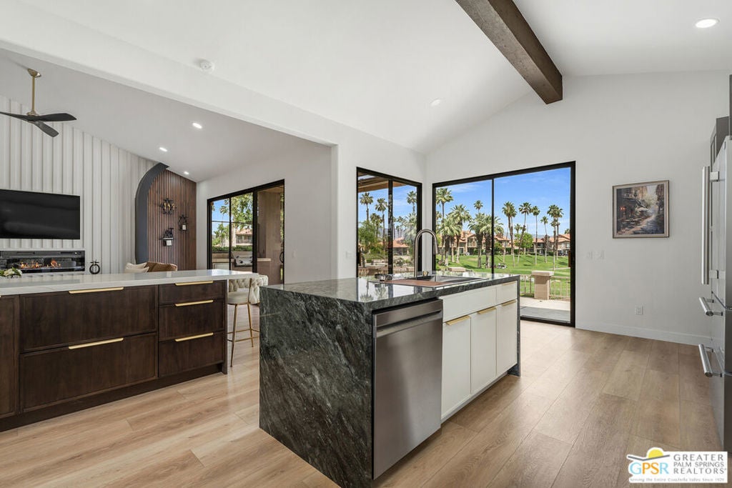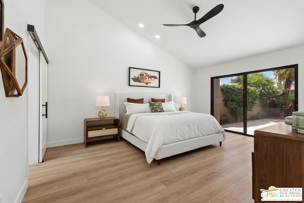 GOLF MEMBERSHIPS AVAILABLE - NO WAITLIST. DESIGNER REMODELED. SINGLE-LEVEL. This highly desirable Willow floor plan in Palm Valley Country Club offers 2,489 sq ft, 3 bedrooms, 3.5 bathrooms, and an attached garage with direct access. Transitional design throughout with brand new appliances, new countertops, cabinetry, lighting and plumbing fixtures, luxury vinyl plank flooring, and remodeled bathrooms with tiled showers. Spacious patio with stunning lake and golf course views surrounded by lush greenery and palm trees, ideal for indoor outdoor desert living. Enjoy two Ted Robinson-designed golf courses, clubhouse, spa, tennis, pickleball, and 46 community pools. SHORT-TERM RENTAL FRIENDLY with strong income potential. FURNISHED per inventory list.