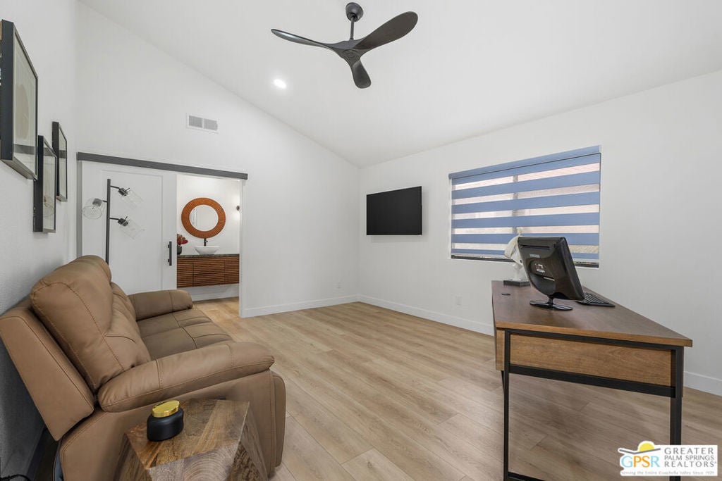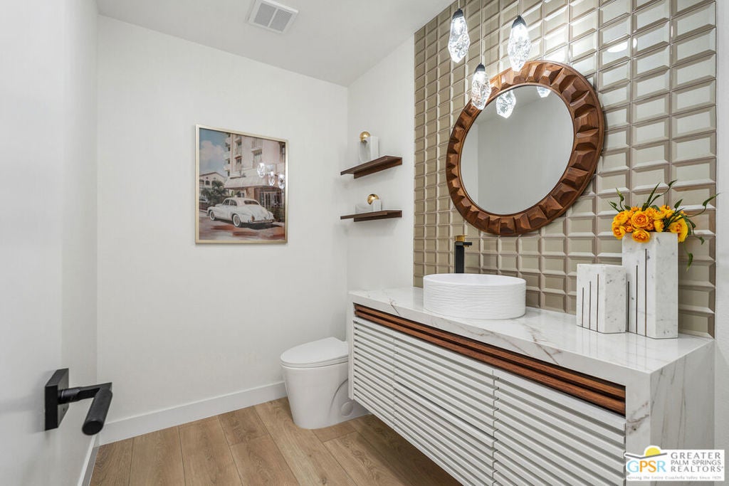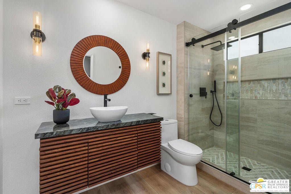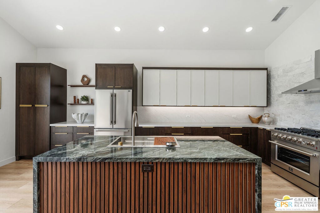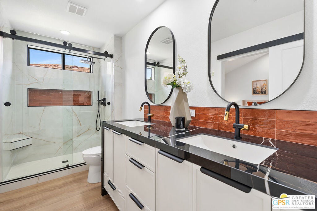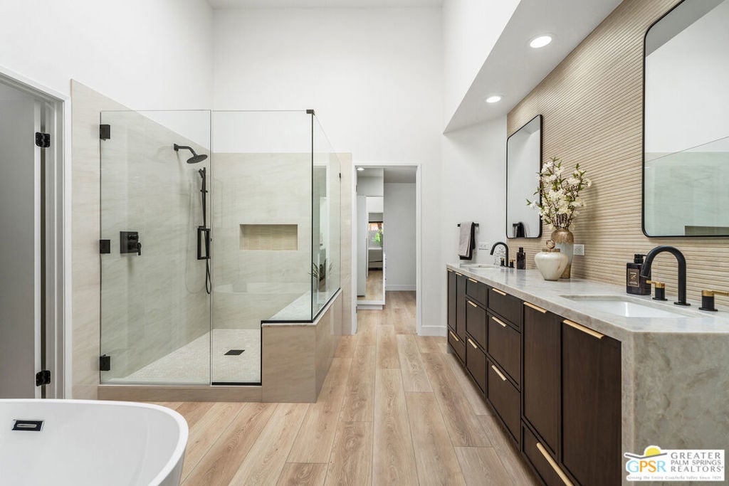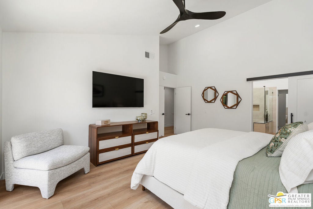 GOLF MEMBERSHIPS AVAILABLE - NO WAITLIST. DESIGNER REMODELED. SINGLE-LEVEL. This highly desirable Willow floor plan in Palm Valley Country Club offers 2,489 sq ft, 3 bedrooms, 3.5 bathrooms, and an attached garage with direct access. Transitional design throughout with brand new appliances, new countertops, cabinetry, lighting and plumbing fixtures, luxury vinyl plank flooring, and remodeled bathrooms with tiled showers. Spacious patio with stunning lake and golf course views surrounded by lush greenery and palm trees, ideal for indoor outdoor desert living. Enjoy two Ted Robinson-designed golf courses, clubhouse, spa, tennis, pickleball, and 46 community pools. SHORT-TERM RENTAL FRIENDLY with strong income potential. FURNISHED per inventory list.