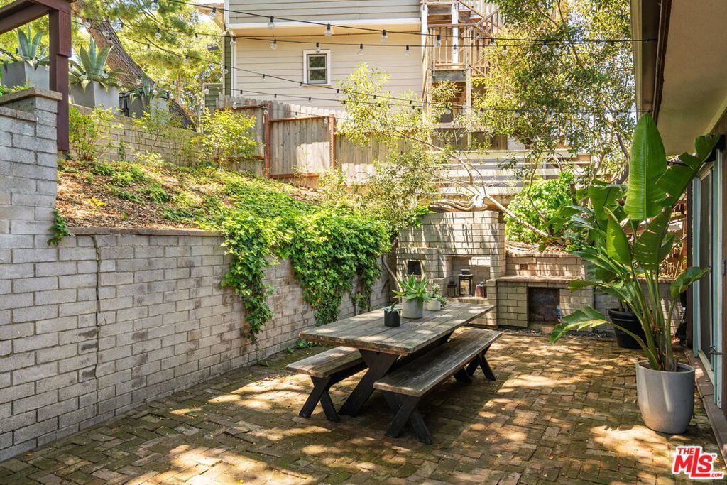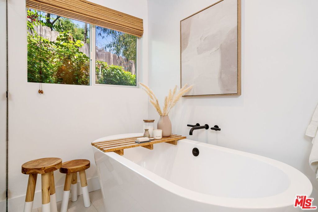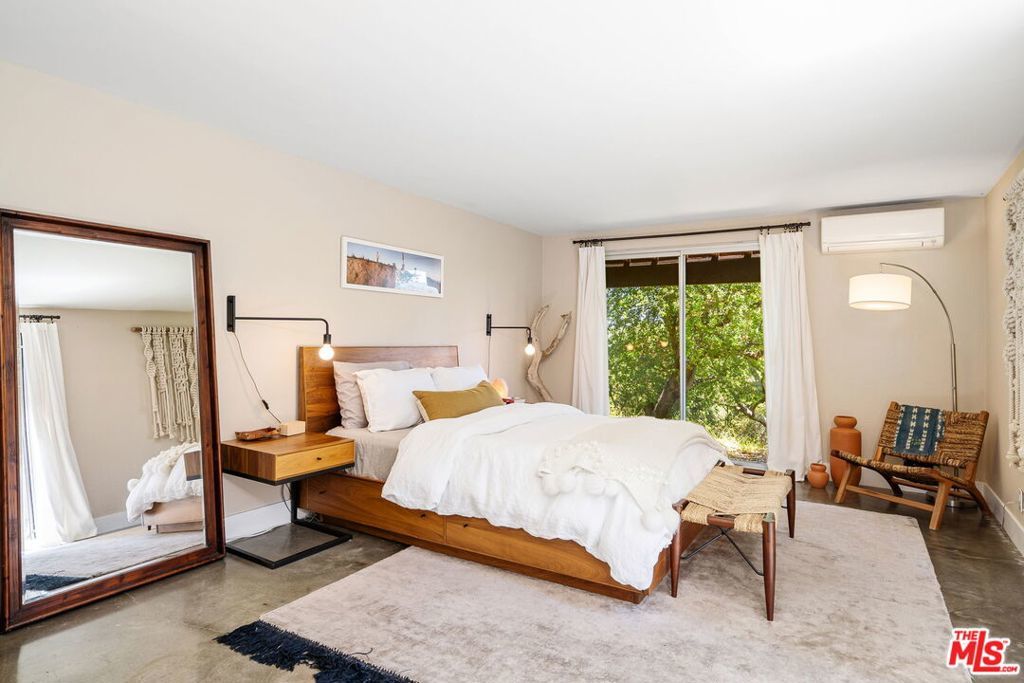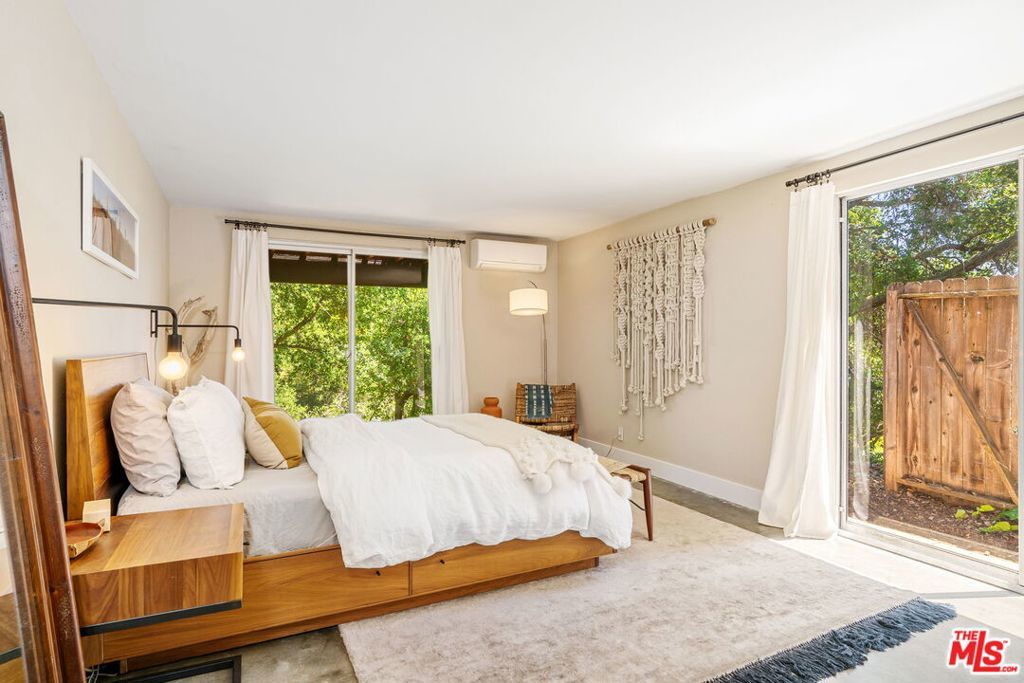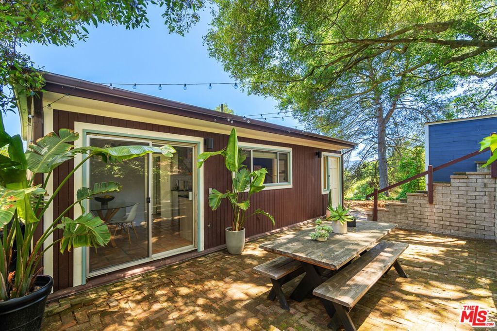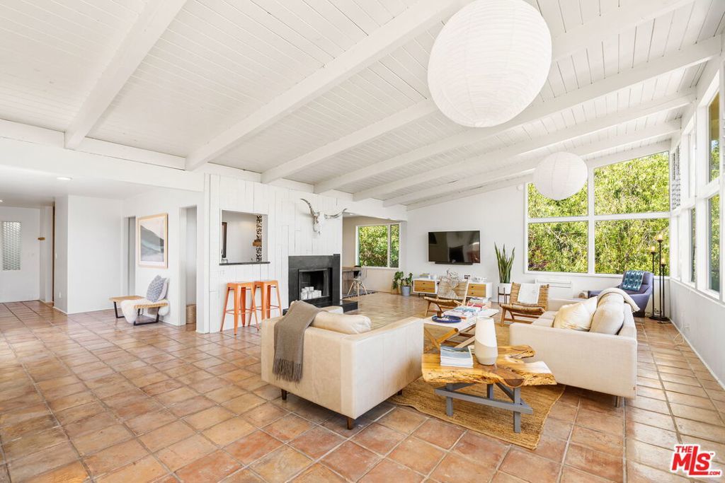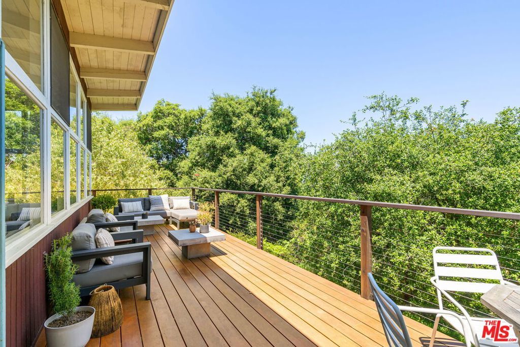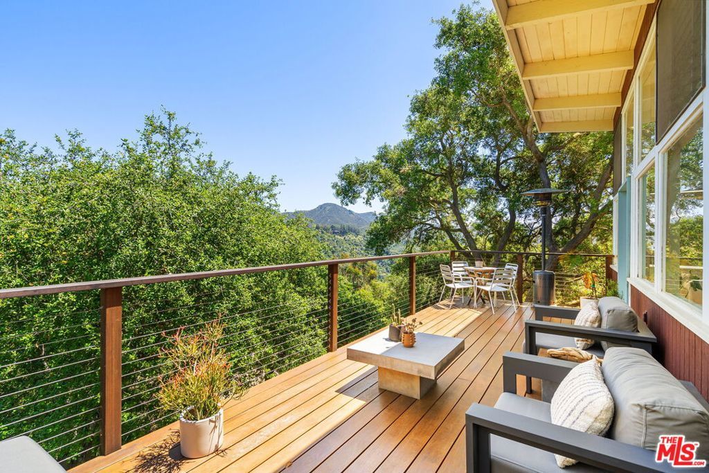 Tucked away in the serene Topanga Mountains, this 2-bedroom, 2-bathroom home offers a peaceful retreat with stunning views. The interior boasts an oversized living room with pitched wood-beam ceilings, a cozy fireplace, a bar area, and an impressive wall of glass windows and doors that open to an expansive deck overlooking verdant treetops, canyons, and hills beyond. The dining room flows into a modern chef's kitchen equipped with stainless steel appliances, a subway tile backsplash, exposed shelving, ample cabinet space, and a breakfast area. The primary bedroom is a haven of relaxation with a walk-in closet and glass doors showcasing serene views of mature trees. The modern primary bathroom features a soaking tub, separate glass shower, and dual-sink vanity. Additional highlights include a spacious guest bedroom, polished concrete and Saltillo tile flooring, an abundance of windows and natural light, and a tiered backyard with two different outdoor spaces. A peaceful escape from the hustle and bustle of city life, yet close to everything Los Angeles has to offer, don't miss the opportunity to call this Topanga Canyon sanctuary your own.