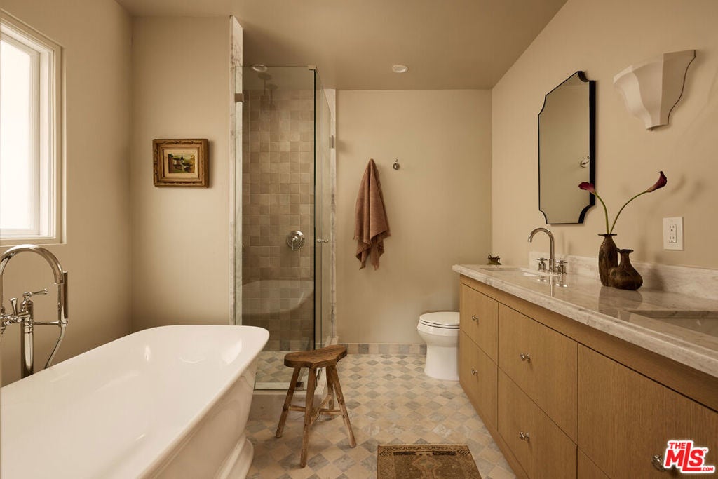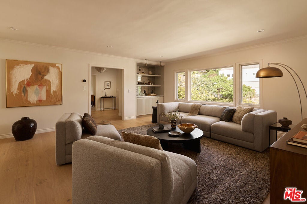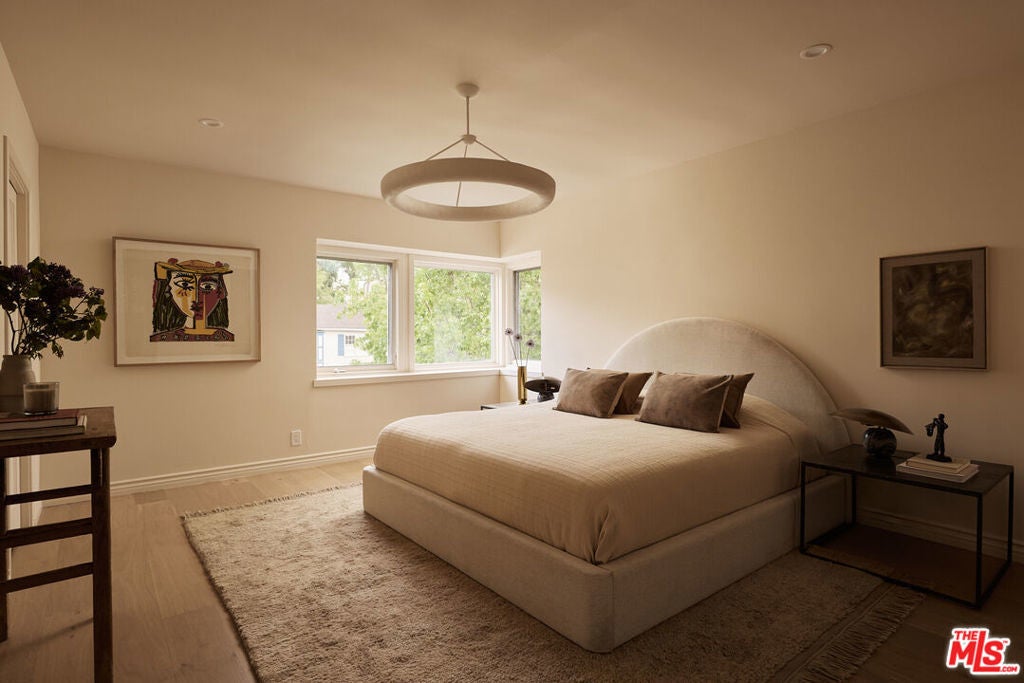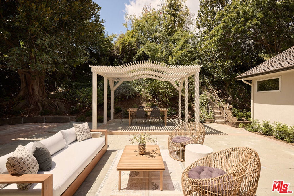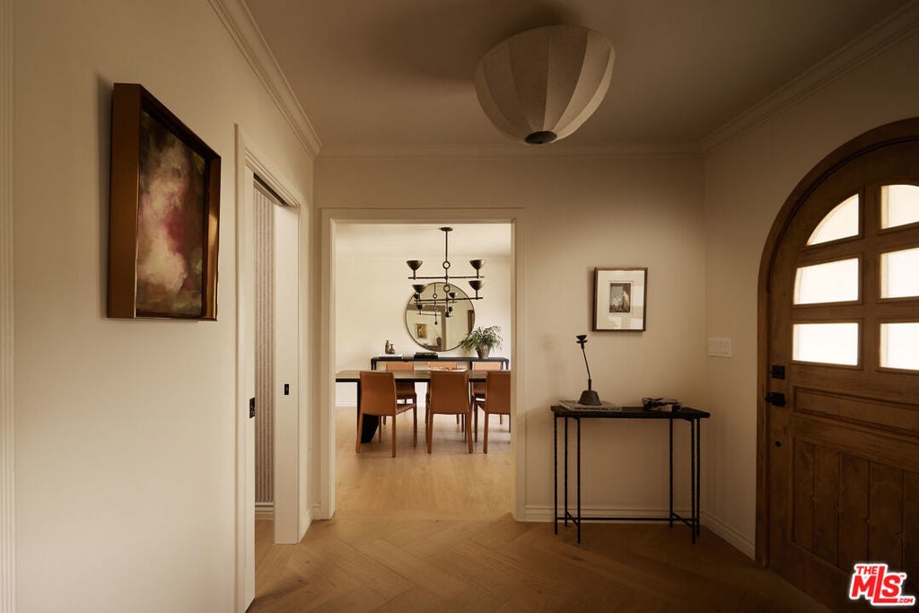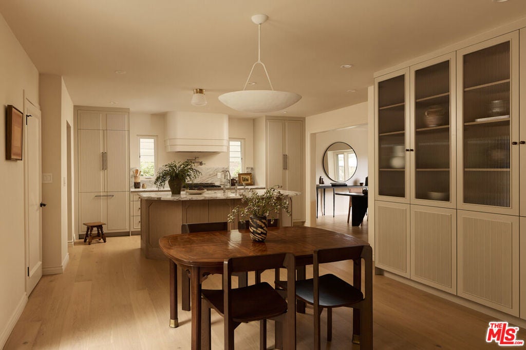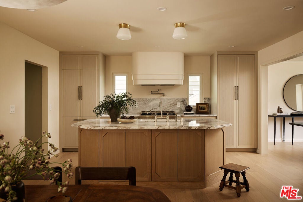 Nestled on a quiet and peaceful stretch of Bentley Avenue just north of Montana Avenue, this newly remodeled residence offers refined living in the highly sought-after Westwood Hills neighborhood, a beloved community known for its charm, convenience, and exceptional lifestyle. Fully reimagined and thoughtfully transformed, this move-in-ready 4-bedroom, 3.5-bathroom home has been remodeled from top to bottom with all-new systems, elevated finishes, and timeless materials throughout. Warm engineered white oak floors flow seamlessly across the interiors, complemented by custom cabinetry and bespoke millwork, sophisticated fixtures, and marble and quartzite countertops throughout. The heart of the home is a stunning chef's kitchen featuring paneled appliances, a striking white oak island, and luxurious marble countertops with a full-height backsplash, a space designed to be as functional as it is beautiful. Adjacent to the kitchen is a formal dining room, ideal for both intimate dinners and effortless entertaining. The expansive living room is lined with wall-to-wall windows and filled with soft, warm natural light. Complete with a built-in bar and a fireplace with a marble surround, the space creates a perfect ambiance for both relaxing evenings and hosting guests. The generously sized primary suite is bathed in warm natural light and features two walk-in closets. The primary bath is exquisitely curated with a soaking tub, elegant marble finishes, a tumbled limestone checkered floor, and a beautifully crafted white oak double vanity, creating a serene spa-like retreat. The outdoor spaces are equally inviting. The front yard, with a grassy area and new landscaping, feels like a cozy private park, elevated from the street to create a sense of privacy and tranquility. In the rear, a generous hardscaped entertaining area is enveloped by lush landscaping and anchored by a magnificent magnolia tree, giving the backyard a true feeling of sanctuary. Located within the coveted Warner Elementary School district, this home also offers convenience with close proximity to UCLA, dining, entertainment, and easy access to the 405. This is an opportunity to own a fully turnkey designer home in one of the Westside's most desirable neighborhoods.