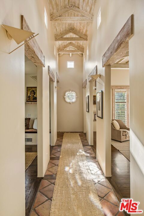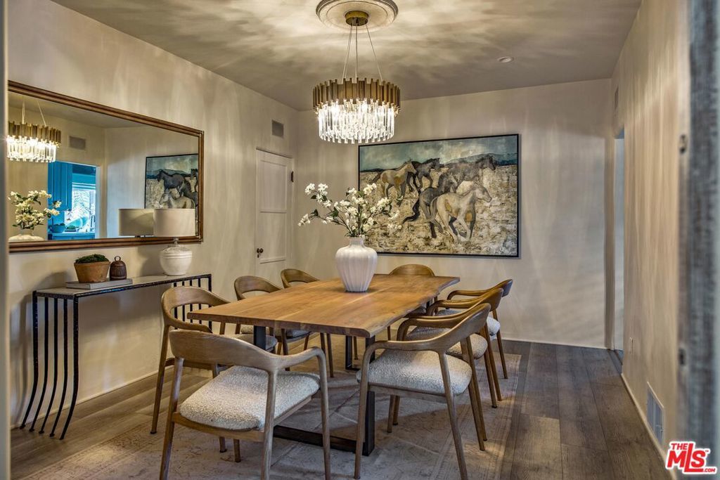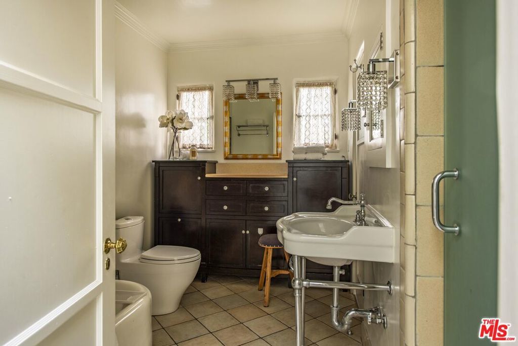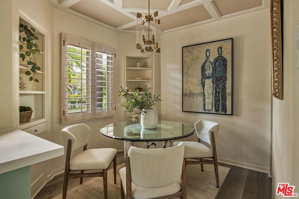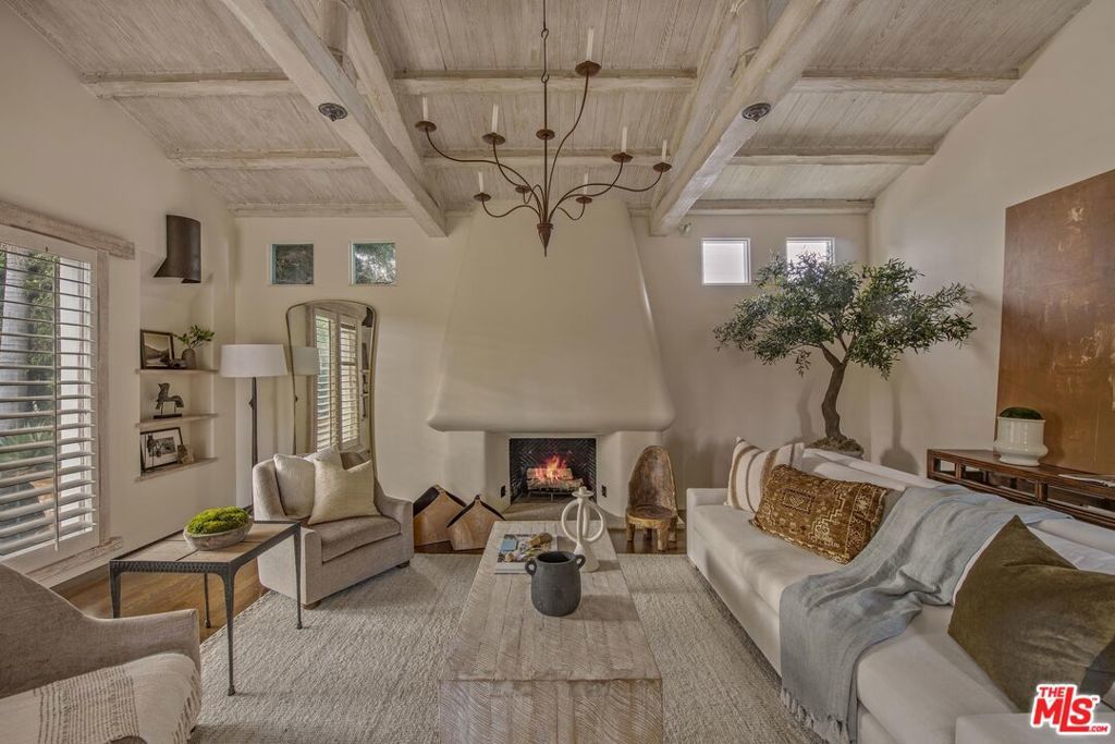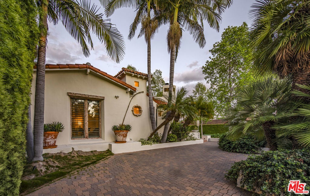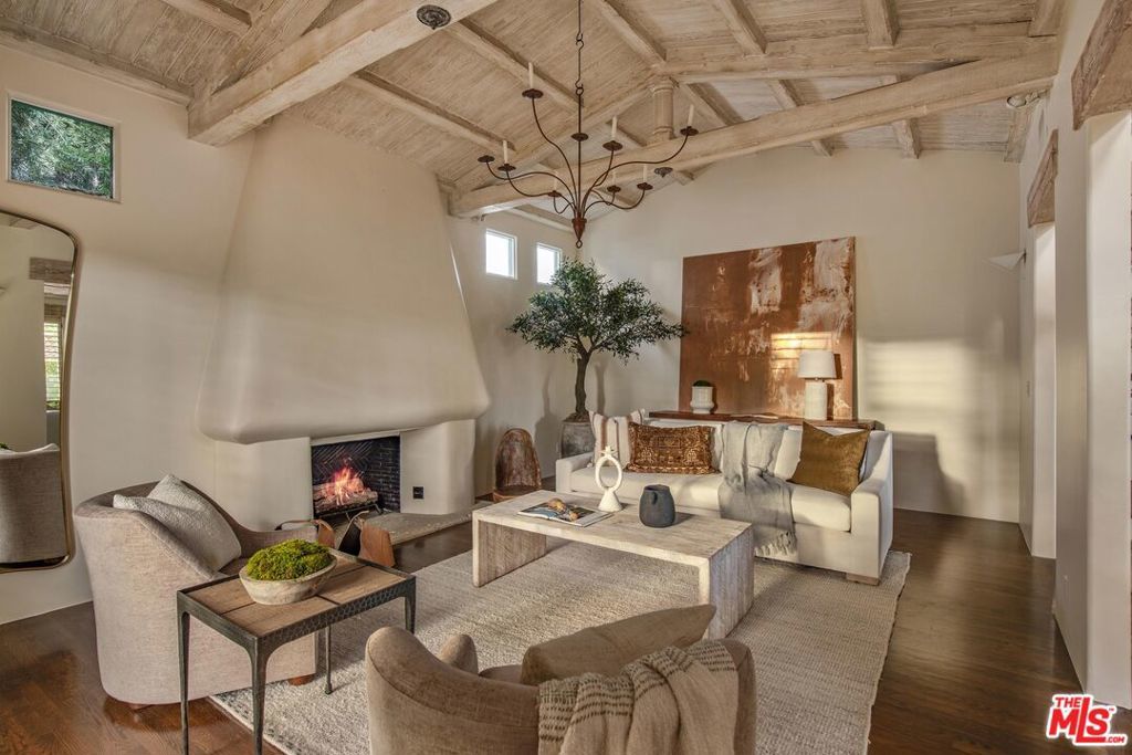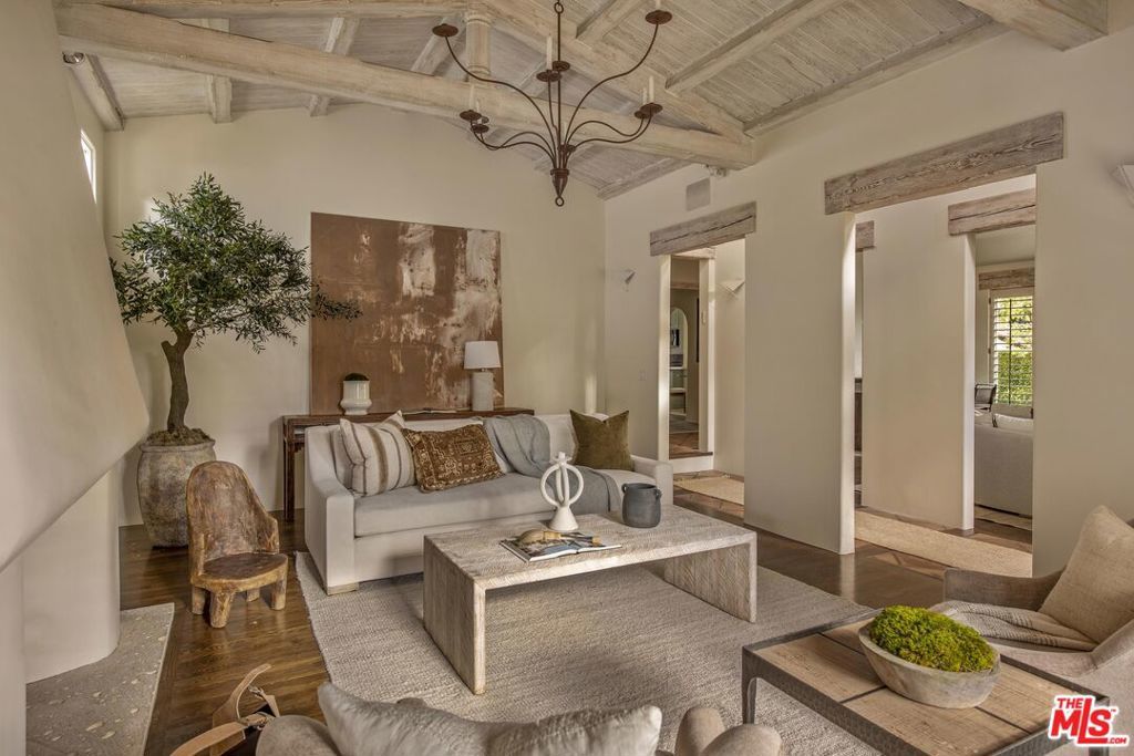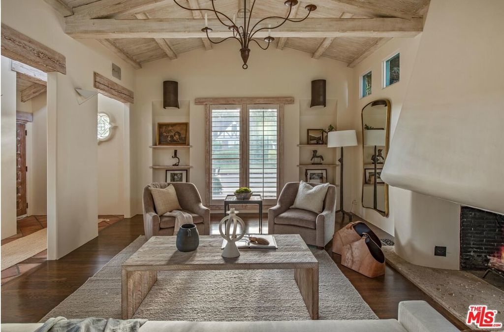 Set on a prominent corner lot in the heart of Beverly Hills, this distinctive Spanish Revival residence blends timeless character with thoughtful updates and exceptional potential. Elevated above the street and surrounded by lush landscaping, this soulful and sophisticated home showcases soaring exposed wood beam ceilings, clerestory windows and skylights that fill the interiors with natural light and highlight the custom ornamental metalwork and multiple artful fireplaces. The grand living room centers around a statement fireplace with curved detail, while a separate family room with a wet bar, built ins, and a second fireplace creates an ideal setting for entertaining alongside a formal dining area. The updated kitchen features quartz countertops, a stylish backsplash, ample cabinetry, generous pantry storage, and a sunny breakfast nook with built-in shelving. The primary suite opens to a romantic private terrace with an in-ground spa, creating a serene retreat and flowing seamlessly into a spacious patio ideal for outdoor dining. Additional highlights include recessed lighting, designer fixtures, water filtration, a basement area suited for flexible storage or utility use and a front driveway providing convenient off street parking for easy access. The classic white stucco exterior and red tile roof enhance the home's curb appeal, all within the award winning Beverly Hills Unified School District and just moments from world class shopping and dining. The corner lot configuration provides excellent potential to convert the garage into an ADU with its own separate entrance bordering Charleville Blvd, creating an ideal setup for additional income, guest quarters, or extended living, and buyers can take advantage of Beverly Hills' pre-approved ADU Program to help streamline the process.
