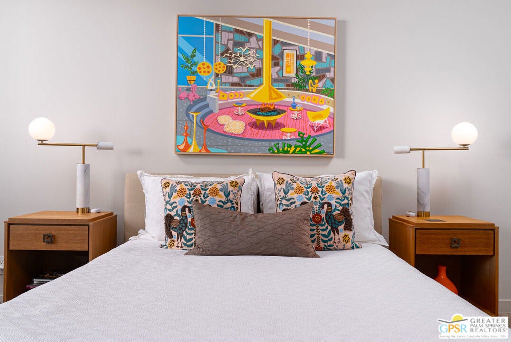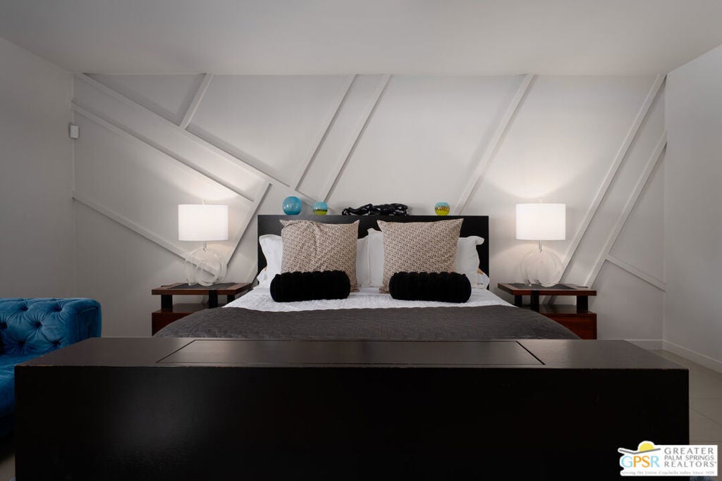 Discover iconic Palm Springs living in this striking Charles Du Bois residence, tucked at the end of a quiet cul-de-sac in sought-after Canyon Estates (on Fee Land)! Elevated to capture even more expansive valley and mountain views, the home's unique orientation maximizes both beauty and efficiency - southern exposure powers the solar panels, while the north-facing patio stays shaded all day for effortless outdoor living. Classic desert modern design shines through with clerestory windows, clean lines, and walls of glass that blur indoor and outdoor spaces. The flexible layout offers two spacious suites plus a stylish den or office, while the open living area, complete with wet bar, flows seamlessly to the expansive patio - perfect for entertaining or simply taking in the view! All set within a resort-style community featuring golf, pools, spas, tennis, and more - just minutes from Indian Canyons and downtown Palm Springs.