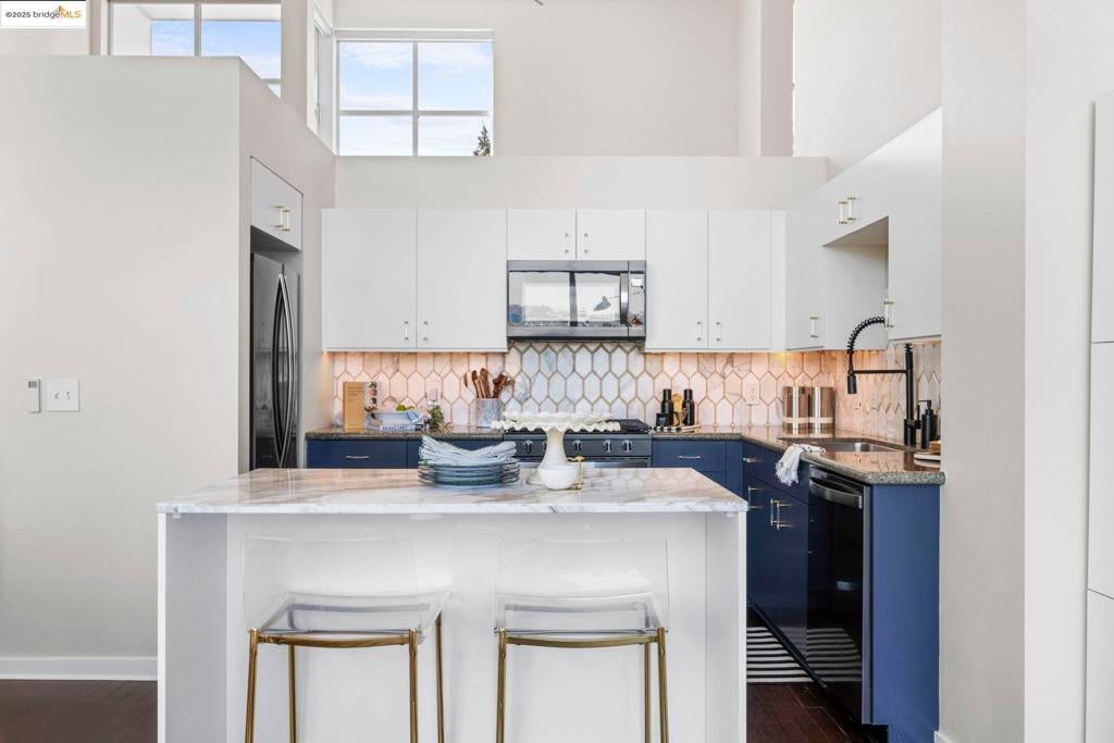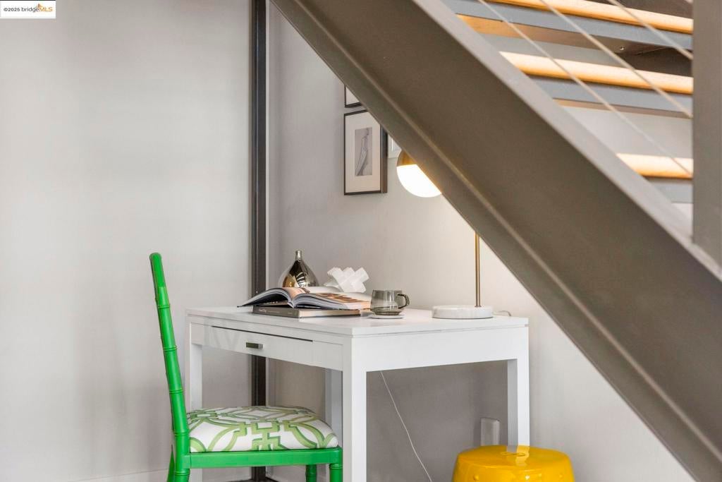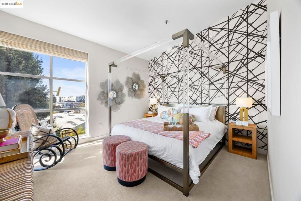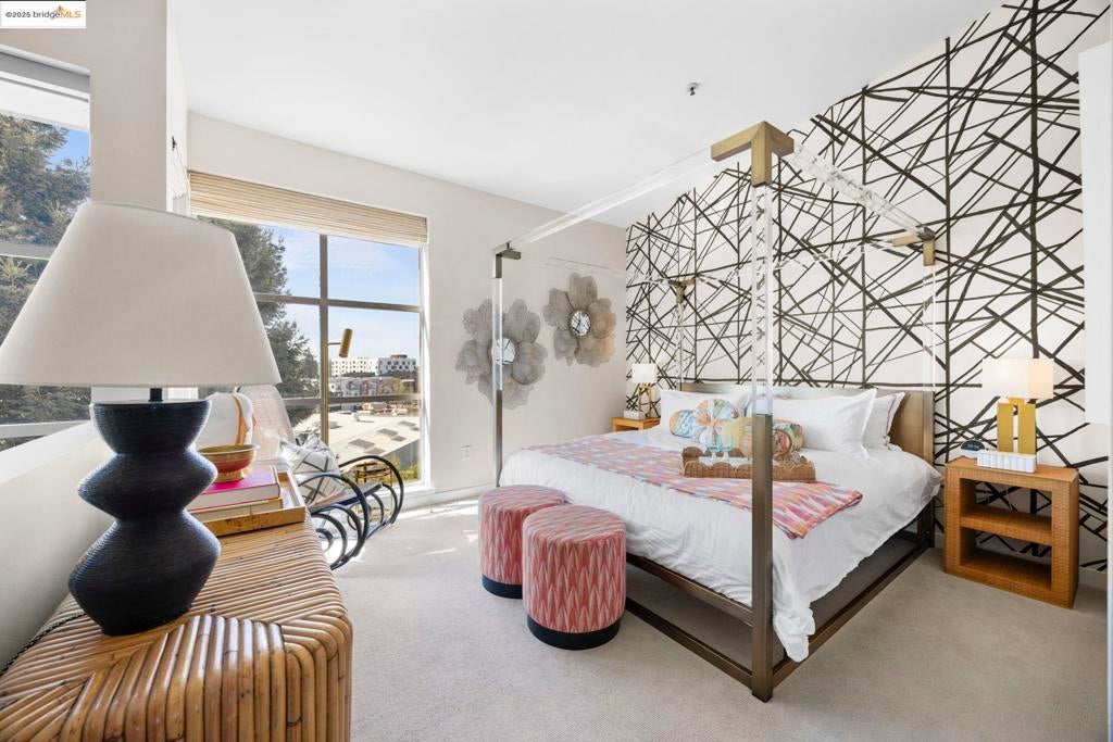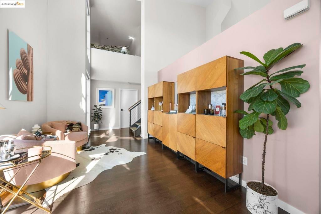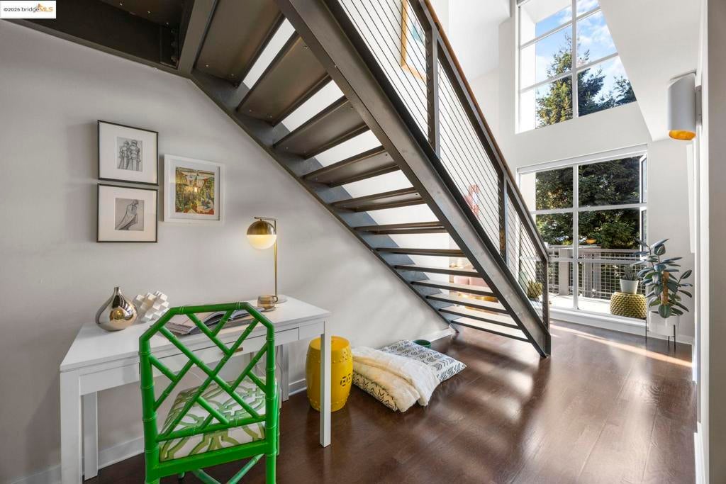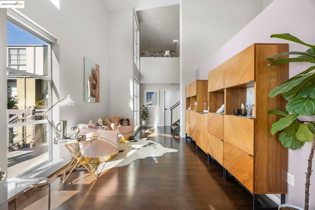 Coveted top-floor corner loft at GreenCity Lofts. The LEED-certified building is home to this 1BD+loft, 2BA residence featuring soaring 20+ ft ceilings and expansive windows that fill the space with light. No expense was spared in the professional renovation—every detail reflects modern luxury, thoughtful craftsmanship, and elevated living. Radiant-heated hardwood floors and curated finishes create a warm, refined atmosphere. The open kitchen is elegant and functional, with black stainless appliances, granite counters, marble backsplash, and a center island ideal for entertaining. The main level also includes a spa-like bathroom, in-unit laundry, and a peaceful enclosed bedroom tucked away for privacy. Upstairs, the versatile loft serves as a second bedroom, office, or creative retreat, complete with a custom walk-in closet and ensuite bath. Smart features include motorized roller shades and programmable thermostats, ready for your preferred automation system. Amenities include secure garage with RFID access, guest parking, two EV chargers, Amazon lockers, bike storage, and upgraded security. Steps from Bay Street, minutes to Temescal and Rockridge, with easy access to transit and freeways. Walk Score of 94. A rare blend of intentional design, natural light and prime location.