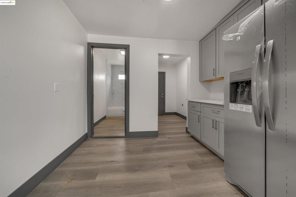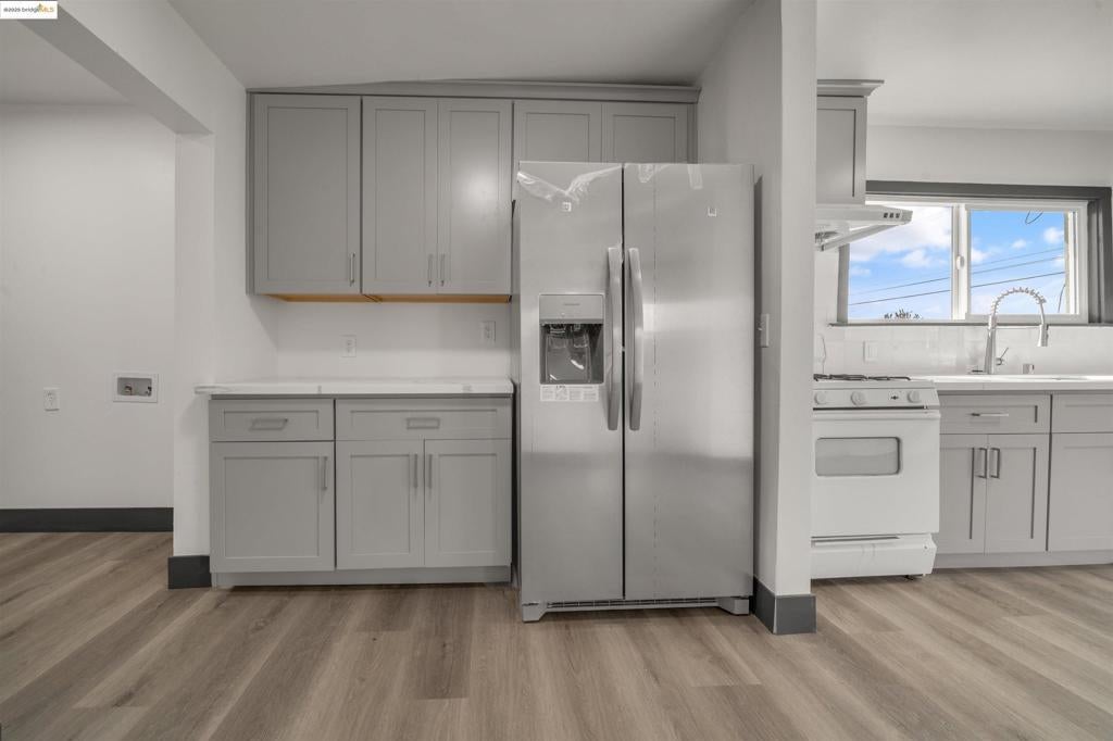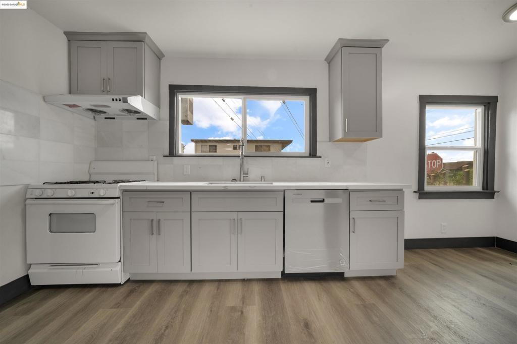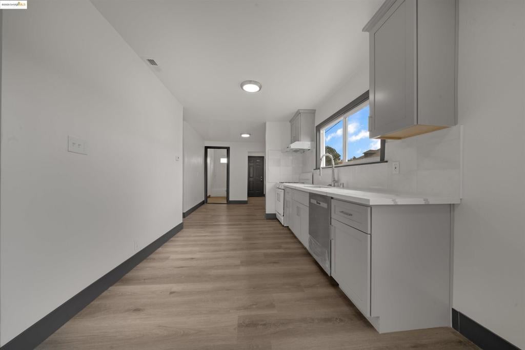 Back on the market. No fault of the property or seller. An excellent starter home for a first-time buyer. This 2bd/1ba East Oakland home has been extensively remodeled, upgraded, and updated. New laminate flooring, plumbing, electric with LED lighting, roof, central heating, and much more. The dining area and kitchen flow in an open architecture style. The kitchen has a new refrigerator, dishwasher, cabinets, stone tops, and a stainless steel sink. The bathroom has been completely remodeled with a full-sized shower and tub. There is a laundry room with a washer and a gas dryer. The property has a large electric gated area for parking up to 3 to 4 cars. This is priced to sell.