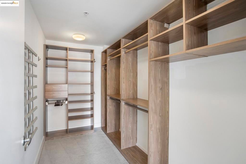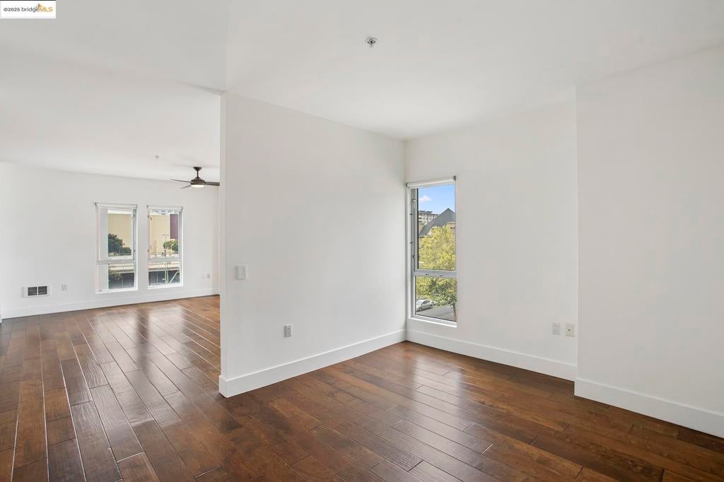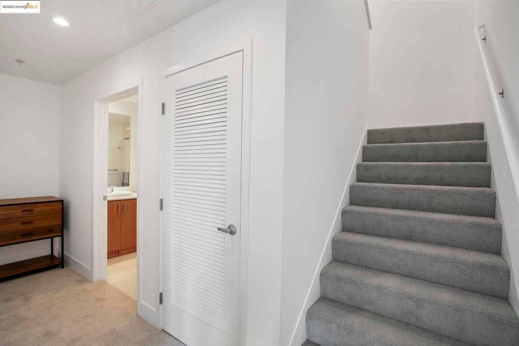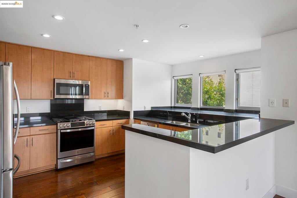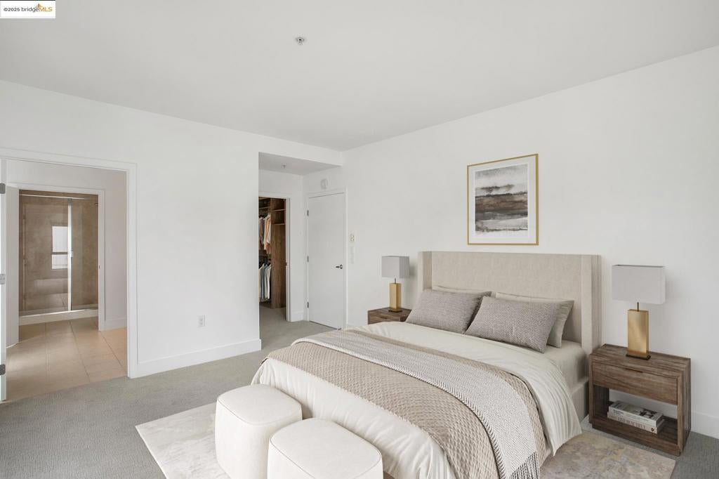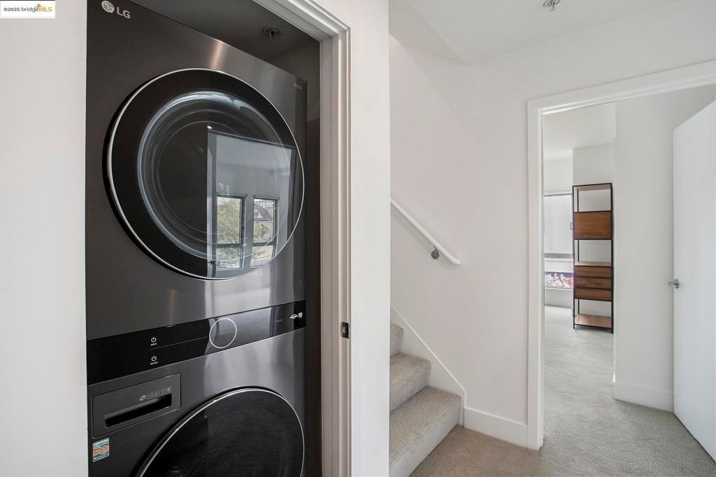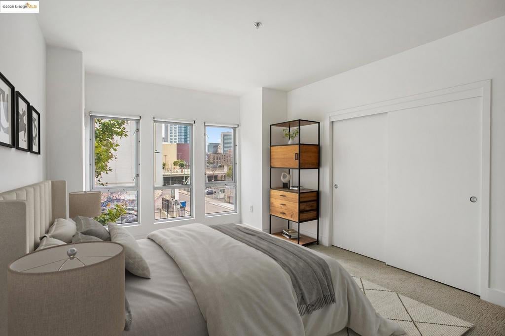 This 2-bedroom, 2.5-bath corner unit combines the feel of a townhouse with the ease and security of luxury condo living and with views to the SF skyline and Mt Tam. The main level showcases a sunlit, open-plan living and kitchen area framed by expansive windows, filling the home with natural light. The adjacent dining space offers flexibility and could easily be converted into a home office, yoga studio, or gym. The sleek kitchen features granite countertops, a breakfast bar, and abundant storage—perfect for both everyday living and entertaining. A convenient powder room and thoughtful storage complete this level. Downstairs, offers two spacious bedrooms, 2 fulls baths and stacked full size laundry. The primary suite is a spa-inspired retreat with dual vanities, a walk-in shower, and a generous walk-in closet, while the second bedroom and full bath with tub-shower combo are equally well-appointed for family, guests, or an office. Residents of Broadway Grand enjoy a secure lobby, courtyard, and elevator access. With EV parking, storage, and modern security, Unit 401 delivers peace of mind—just steps from BART and Uptown’s dining, shopping, and culture.