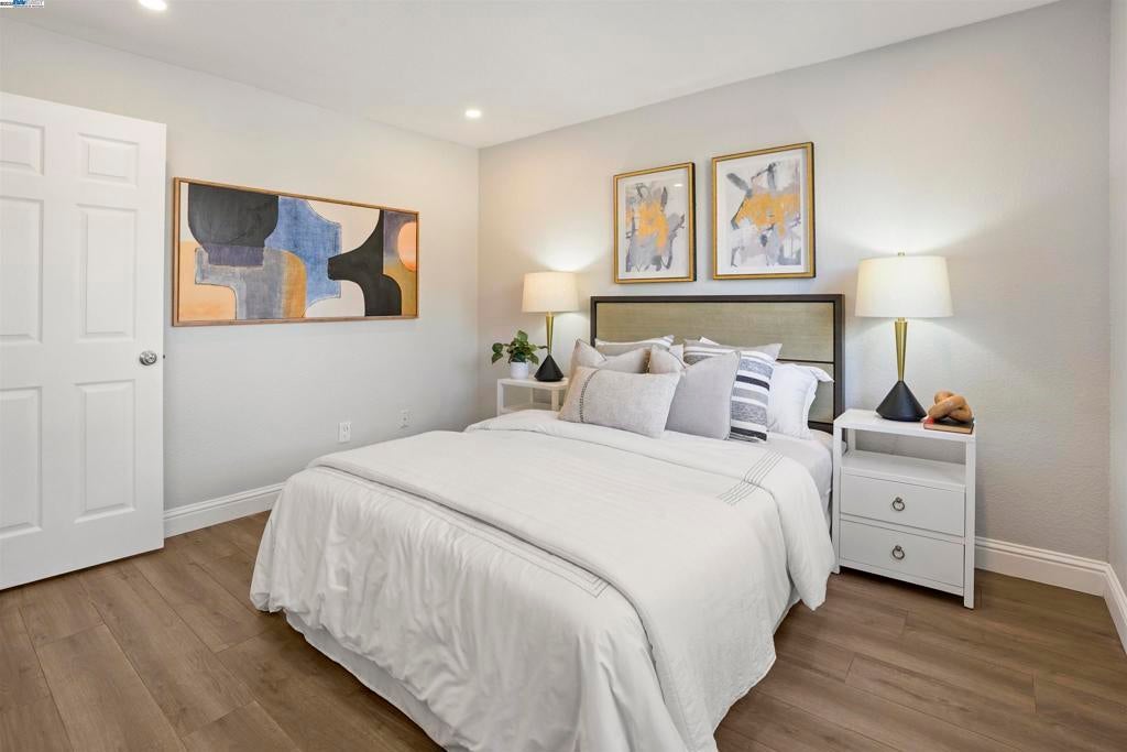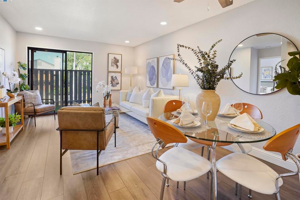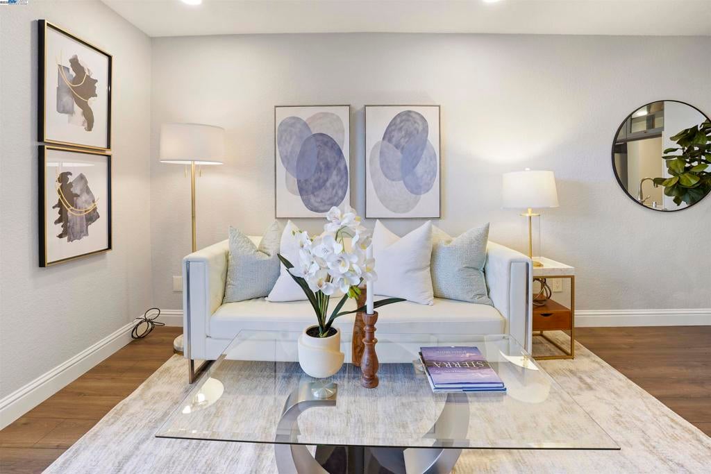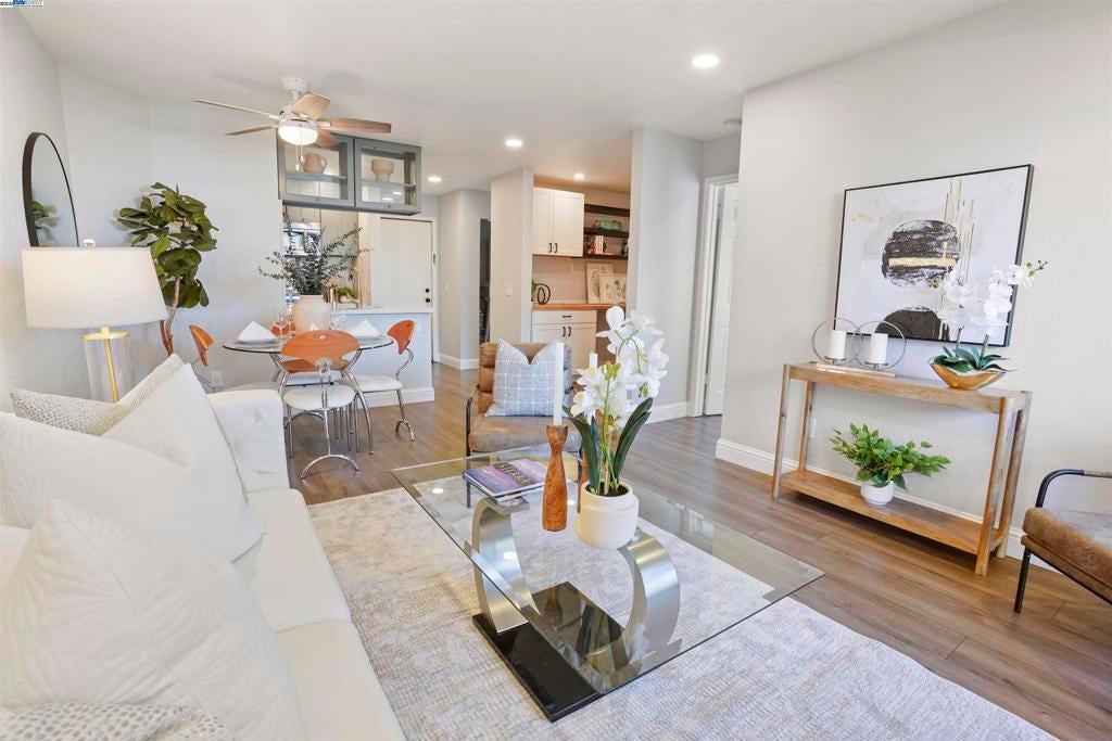 Welcome to this beautifully updated one-bedroom, one-bathroom condo with BONUS space, located in a gated community offering both security and convenience. This home features a modern, open layout with fresh paint and laminate flooring throughout. The updated kitchen includes sleek cabinetry, stainless steel appliances, and quartz countertops, making it as functional as it is stylish. A spacious living area is filled with natural light thanks to a west-facing sliding glass door that leads to a private deck, perfect for enjoying the afternoon sun. Just off the main living space is a versatile bonus area, ideal for a home office or a cozy second sitting room. The bedroom is well-sized, and the bathroom is tastefully finished for a clean, modern feel. Enjoy the convenience of an in-unit washer and dryer along with a dedicated covered parking spot. This home is ideally situated near the BART station, shopping, grocery stores and the golf course, with easy freeway access for commuters. With thoughtful updates and a bright, welcoming atmosphere, this condo is move-in ready and a perfect place to call home.