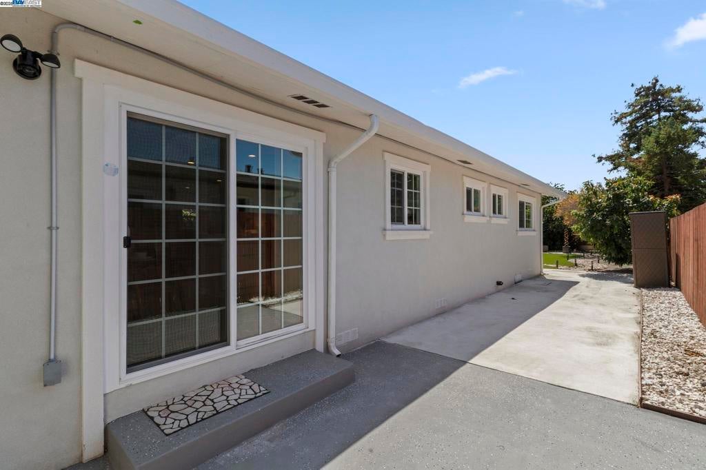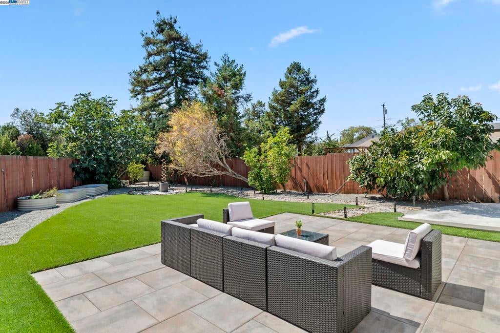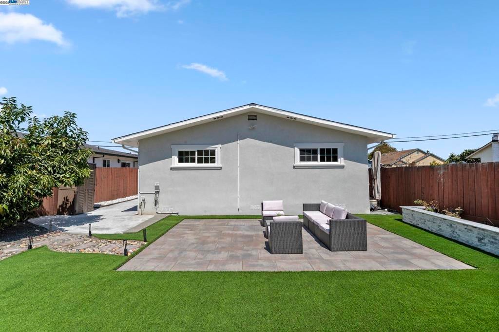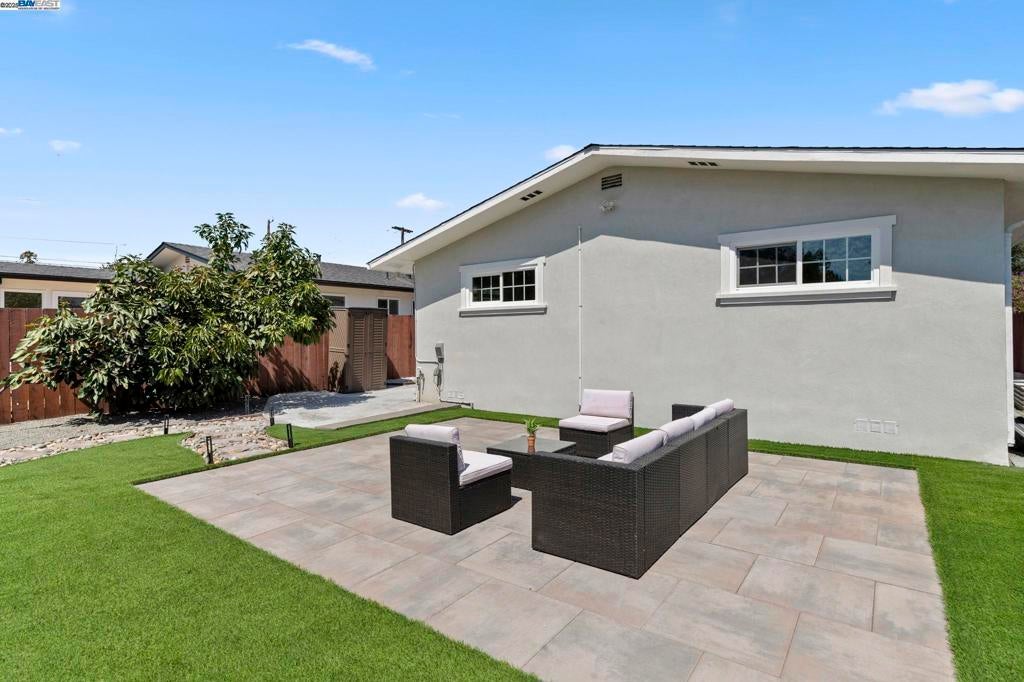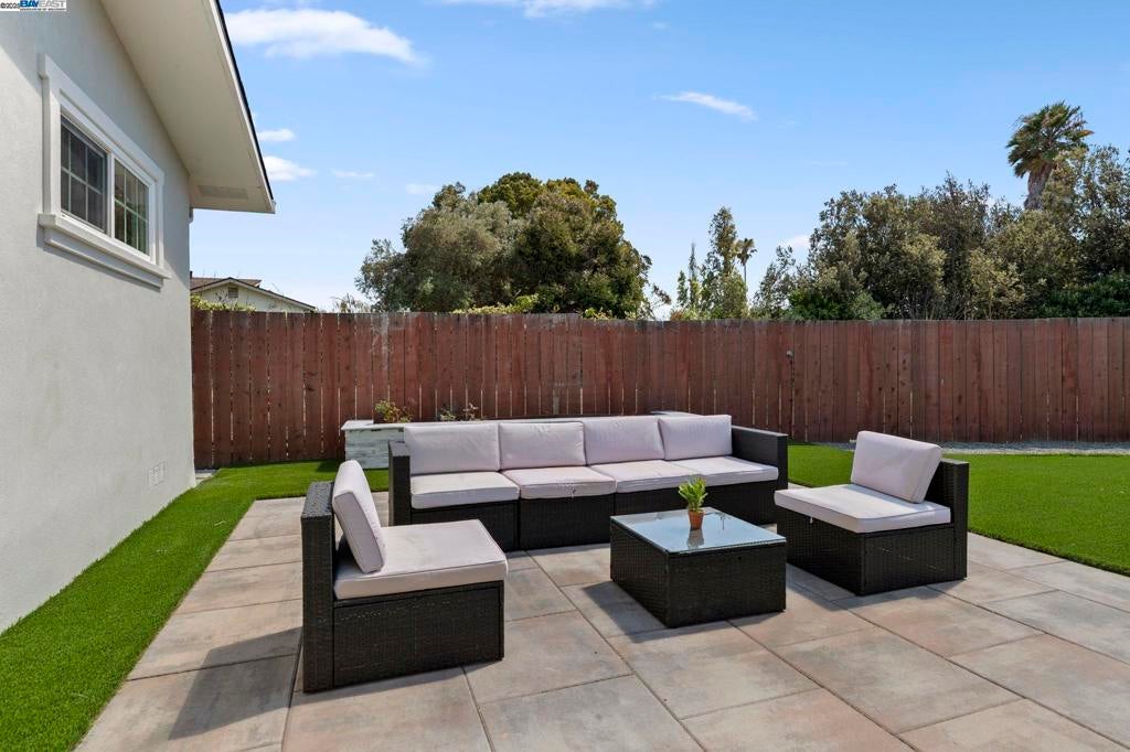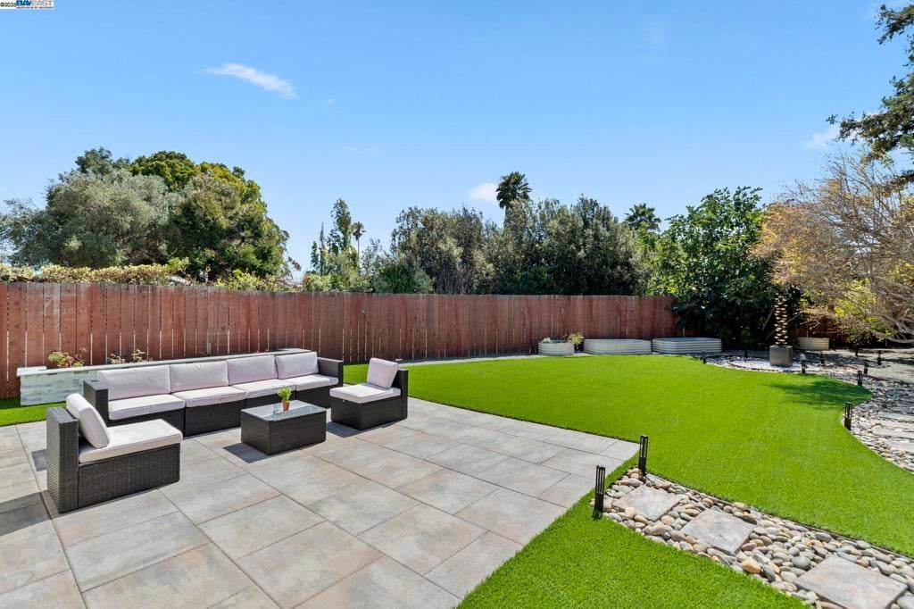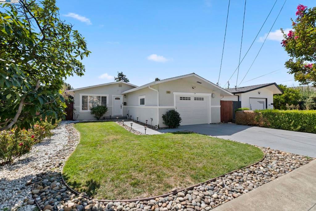 Welcome to this updated turn-key NE-facing 3-bed, 2-bath ranch-style home blending modern design with timeless comfort. The open, airy layout flows into a professionally landscaped backyard retreat. Curb appeal shines with lush lawn, river rock accents, and epoxy-coated walkway/driveway. Inside, a bright living room features a picture window, wood laminate flooring, and recessed lighting, connecting seamlessly to the kitchen/dining area. The kitchen boasts quartz countertops, stainless steel appliances (gas range, microwave, fridge), and reverse osmosis system, with backyard access from dining. Primary suite includes ensuite bath with decorative tile stall shower, dual shower heads, and custom door. Secondary bedrooms feature carpet and recessed lighting. Updated hall bath offers solid-surface vanity and shower/tub with custom tile surround. Backyard includes paver patio, turf, planter boxes, and accent lighting. Single-car garage offers epoxy floors, storage, laundry (W/D included). Other highlights: dual-pane windows, A/C, water softener, and custom window coverings. Convenient to parks, shopping, dining, BART, Tesla, Meta, and Silicon Valley.