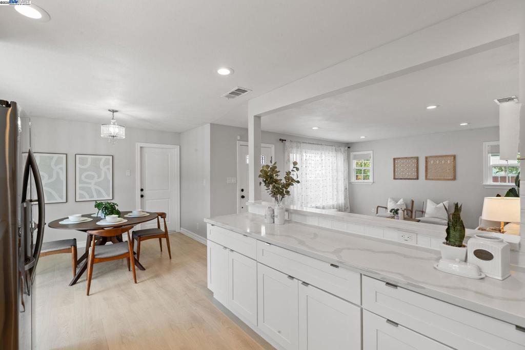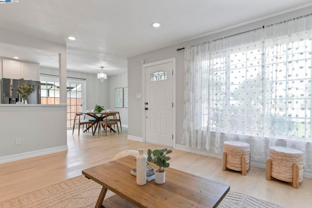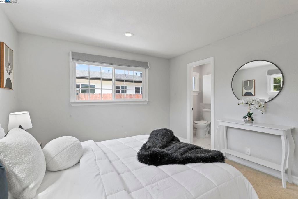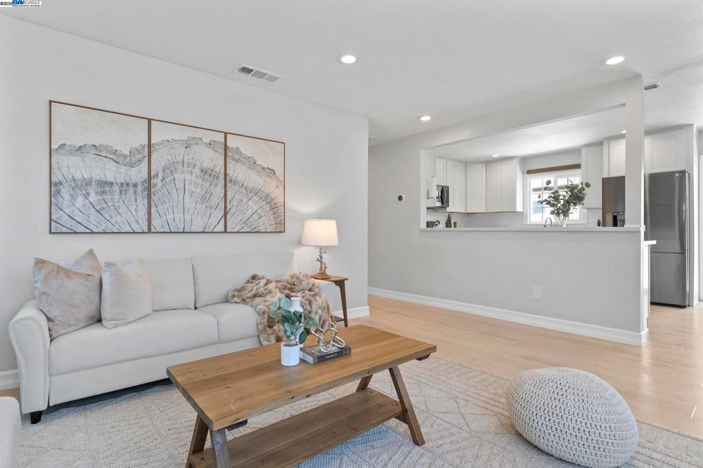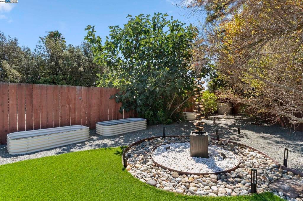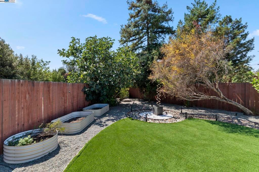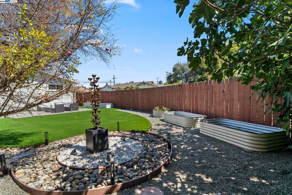 Welcome to this updated turn-key NE-facing 3-bed, 2-bath ranch-style home blending modern design with timeless comfort. The open, airy layout flows into a professionally landscaped backyard retreat. Curb appeal shines with lush lawn, river rock accents, and epoxy-coated walkway/driveway. Inside, a bright living room features a picture window, wood laminate flooring, and recessed lighting, connecting seamlessly to the kitchen/dining area. The kitchen boasts quartz countertops, stainless steel appliances (gas range, microwave, fridge), and reverse osmosis system, with backyard access from dining. Primary suite includes ensuite bath with decorative tile stall shower, dual shower heads, and custom door. Secondary bedrooms feature carpet and recessed lighting. Updated hall bath offers solid-surface vanity and shower/tub with custom tile surround. Backyard includes paver patio, turf, planter boxes, and accent lighting. Single-car garage offers epoxy floors, storage, laundry (W/D included). Other highlights: dual-pane windows, A/C, water softener, and custom window coverings. Convenient to parks, shopping, dining, BART, Tesla, Meta, and Silicon Valley.