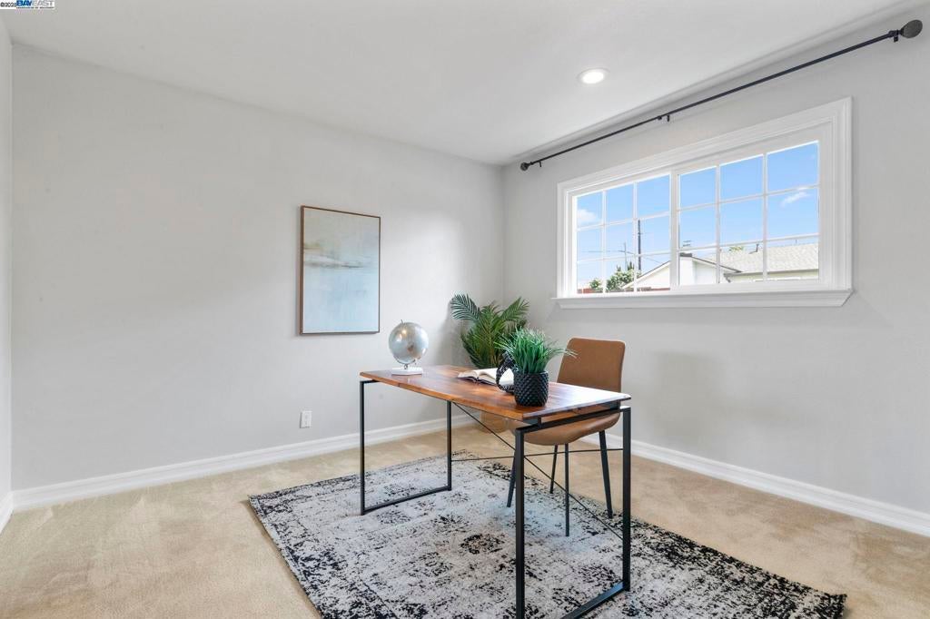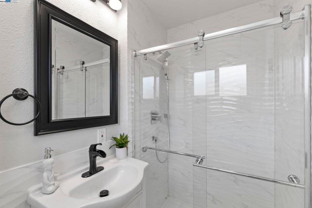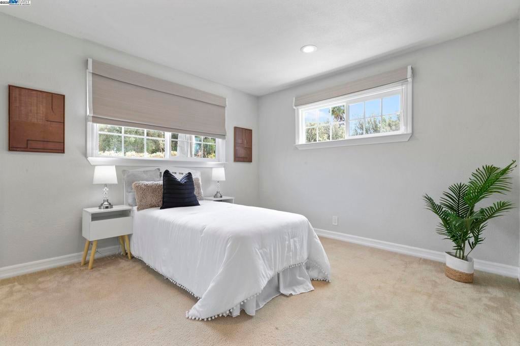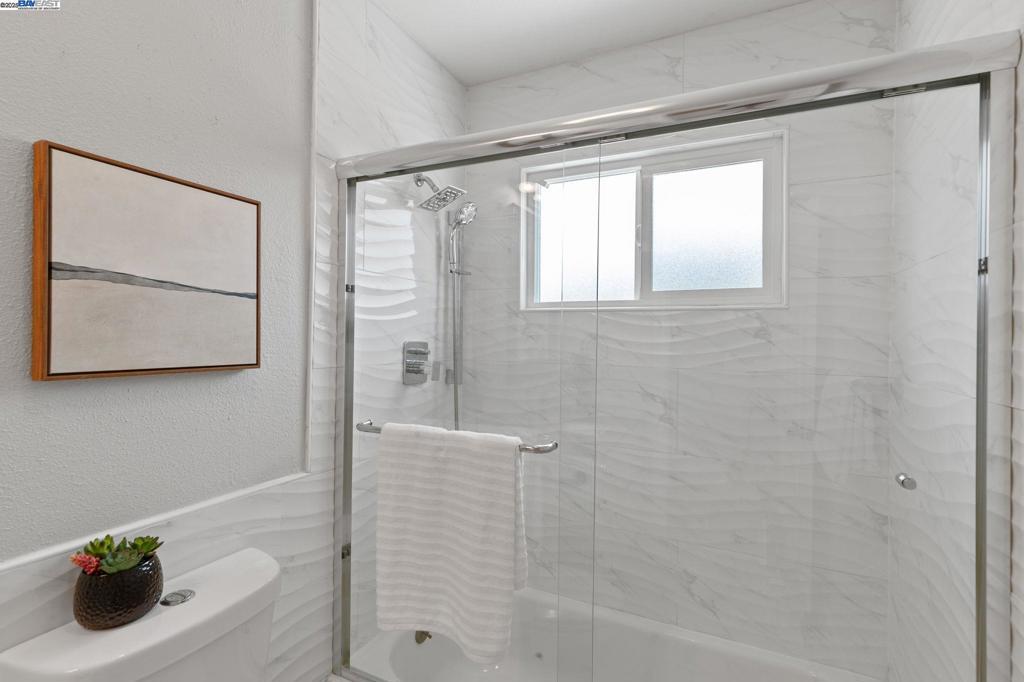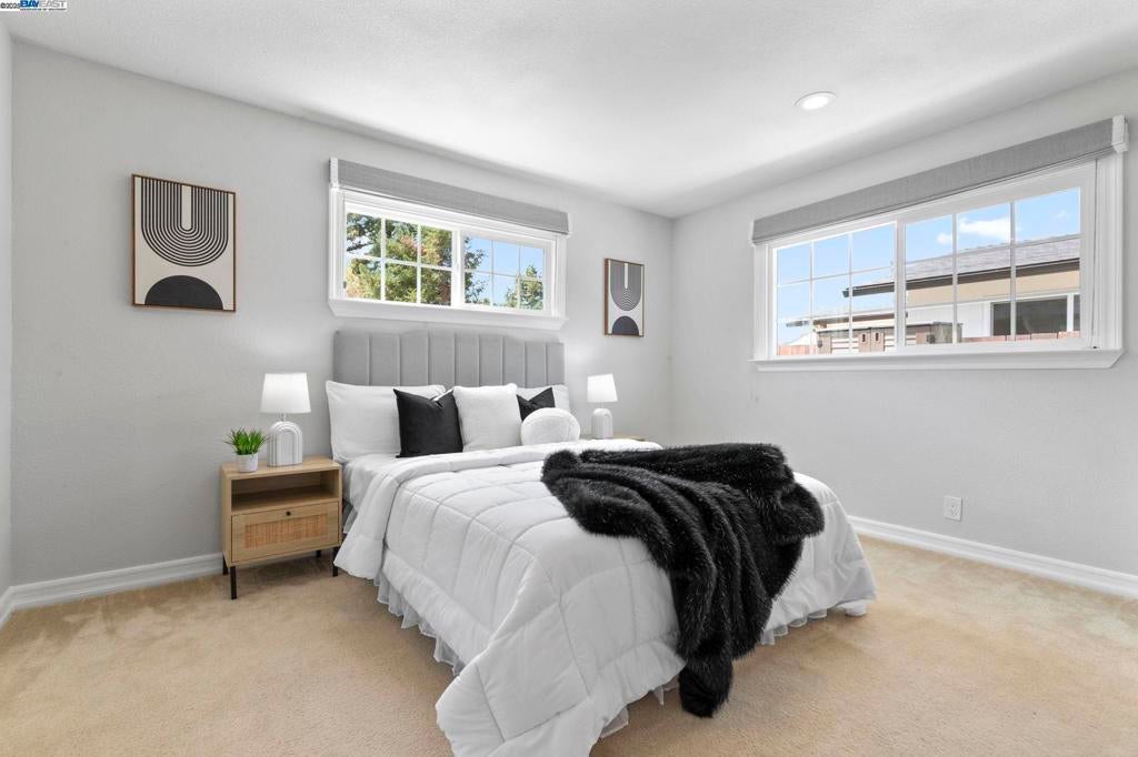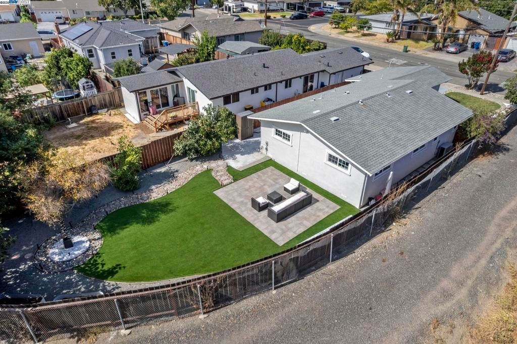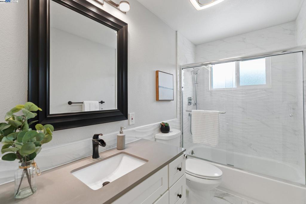 Welcome to this updated turn-key NE-facing 3-bed, 2-bath ranch-style home blending modern design with timeless comfort. The open, airy layout flows into a professionally landscaped backyard retreat. Curb appeal shines with lush lawn, river rock accents, and epoxy-coated walkway/driveway. Inside, a bright living room features a picture window, wood laminate flooring, and recessed lighting, connecting seamlessly to the kitchen/dining area. The kitchen boasts quartz countertops, stainless steel appliances (gas range, microwave, fridge), and reverse osmosis system, with backyard access from dining. Primary suite includes ensuite bath with decorative tile stall shower, dual shower heads, and custom door. Secondary bedrooms feature carpet and recessed lighting. Updated hall bath offers solid-surface vanity and shower/tub with custom tile surround. Backyard includes paver patio, turf, planter boxes, and accent lighting. Single-car garage offers epoxy floors, storage, laundry (W/D included). Other highlights: dual-pane windows, A/C, water softener, and custom window coverings. Convenient to parks, shopping, dining, BART, Tesla, Meta, and Silicon Valley.