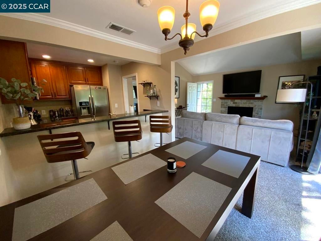 Charming East-facing and rare condo nestled in the highly sought-after Heritage Place complex in San Ramon (Twins Creek), this upper-level, end-unit condo offers a bright, open living space with vaulted ceilings and a cozy wood-burning fireplace. The living room flows seamlessly into the dining area, and the unit features convenient in-unit laundry room. Enjoy an upgraded kitchen with modern counters, newer SS appliances, custom cabinetry, and stylish flooring. The bathroom has been beautifully remodeled, & crown molding adds a touch of elegance throughout. Step out onto your private balcony, perfect for enjoying the outdoors, and benefit from additional storage space. The location couldn’t be better – just a short stroll to Starbucks, shopping, and dining. Minutes from the 680 freeway, top-rated schools, City Center Bishop Ranch, & so much more. The HOA fee covers water, garbage & includes 2 covered parking spots. Plus, the fridge, full-size washer, & dryer are all included – move-in ready!