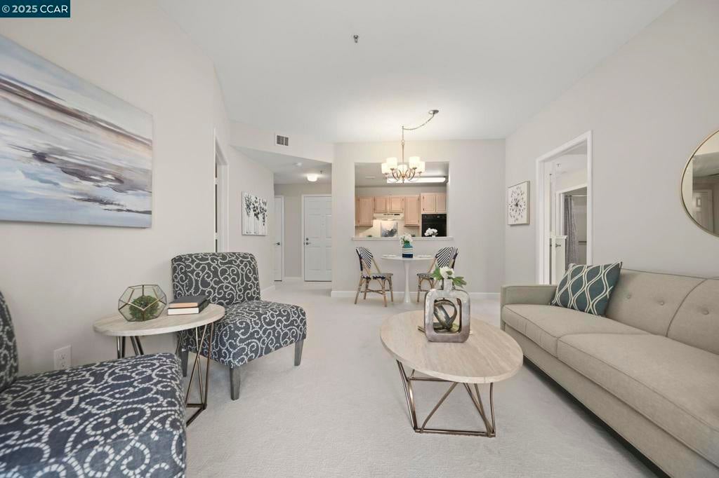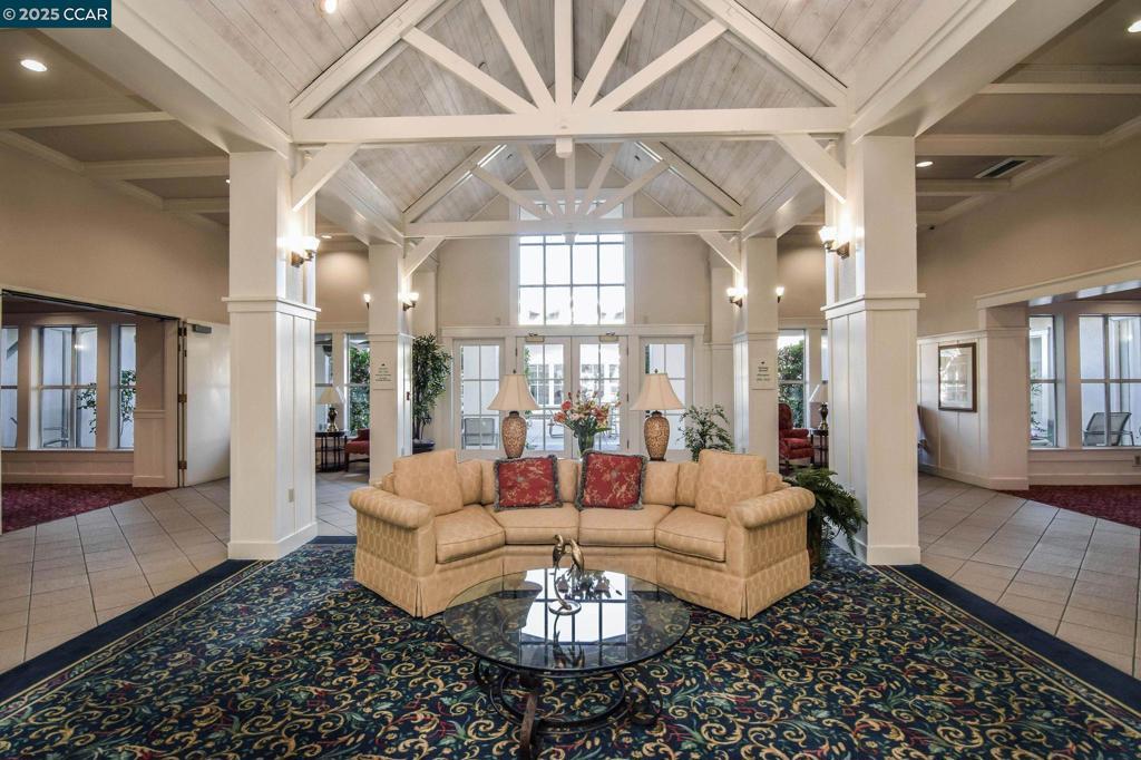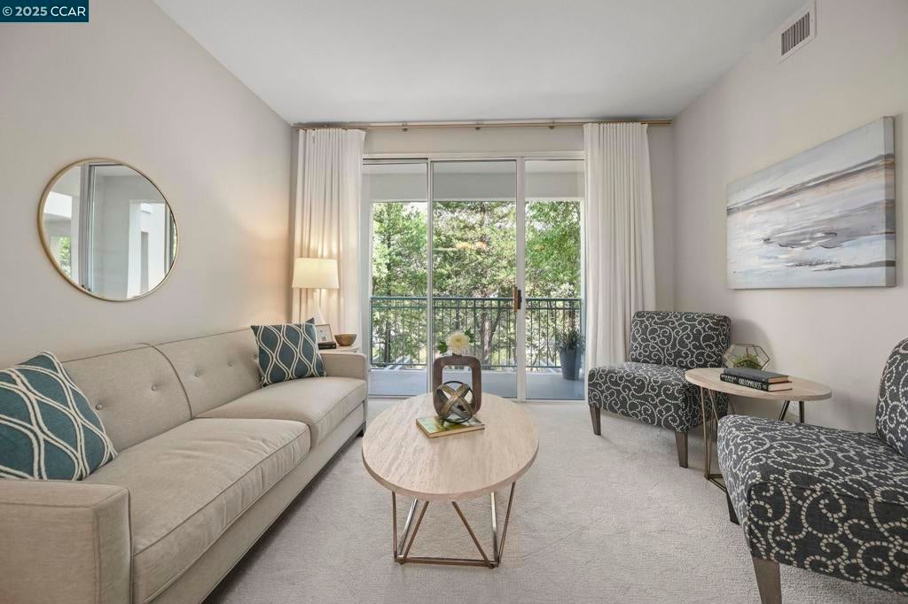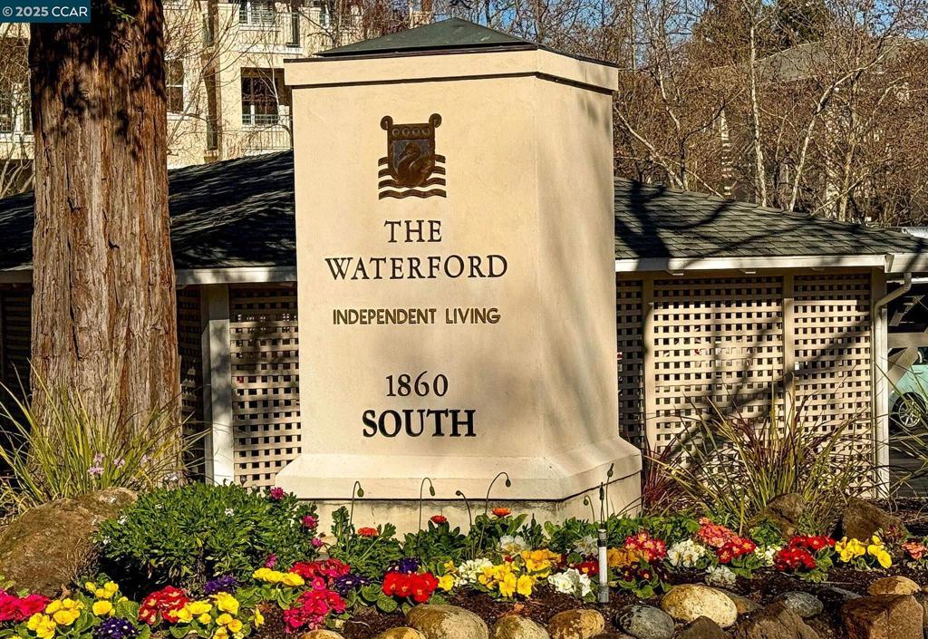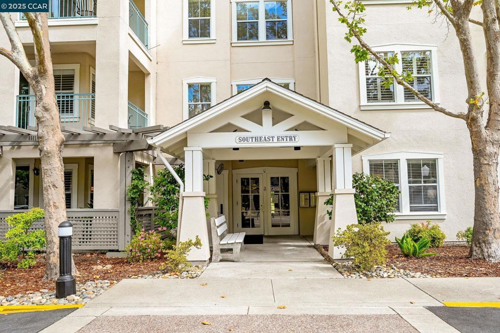 Beautiful 2-bedroom, 2-bathroom condo in The Waterford, a 55+ independent active senior living community in Rossmoor. Overlooking trees and facing away from the parking lot, this bright second-floor unit features an open kitchen that flows into the dining area and living room with sliding glass doors leading to a lovely deck. The primary suite offers a separate vanity area and an additional closet. The second bathroom includes a stall shower and in-unit washer and dryer. Elevator access allows for a no-step entry. Additional storage is conveniently located just one door down the hall. Carpet was replaced and the unit was freshly painted the week of September 22, 2025. HOA dues include water, trash, recycling, Comcast basic cable, and internet. Residents enjoy weekly housekeeping, one meal per day, and access to all activities and amenities. Community bus service provides transportation to nearby shopping areas and BART. Security and front-gate monitoring are also included.