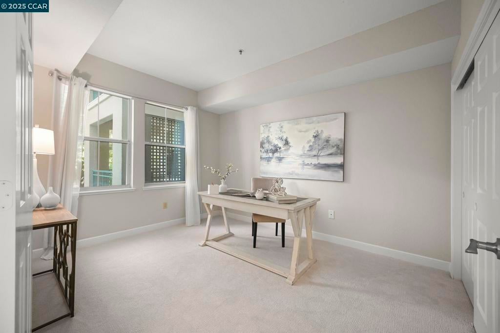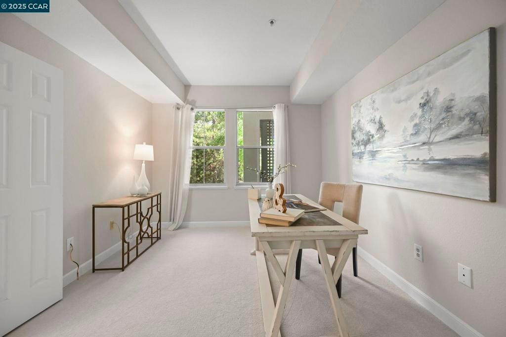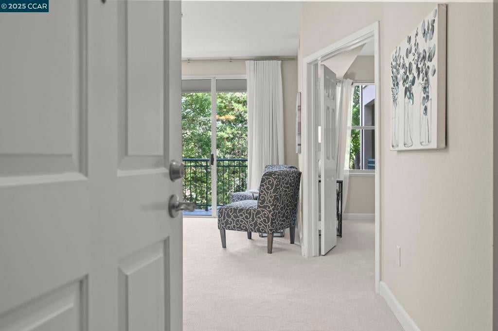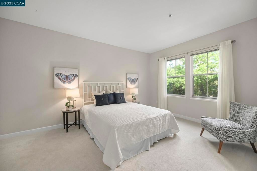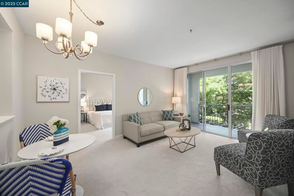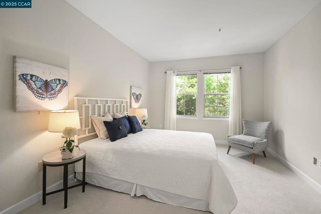 Beautiful 2-bedroom, 2-bathroom condo in The Waterford, a 55+ independent active senior living community in Rossmoor. Overlooking trees and facing away from the parking lot, this bright second-floor unit features an open kitchen that flows into the dining area and living room with sliding glass doors leading to a lovely deck. The primary suite offers a separate vanity area and an additional closet. The second bathroom includes a stall shower and in-unit washer and dryer. Elevator access allows for a no-step entry. Additional storage is conveniently located just one door down the hall. Carpet was replaced and the unit was freshly painted the week of September 22, 2025. HOA dues include water, trash, recycling, Comcast basic cable, and internet. Residents enjoy weekly housekeeping, one meal per day, and access to all activities and amenities. Community bus service provides transportation to nearby shopping areas and BART. Security and front-gate monitoring are also included.