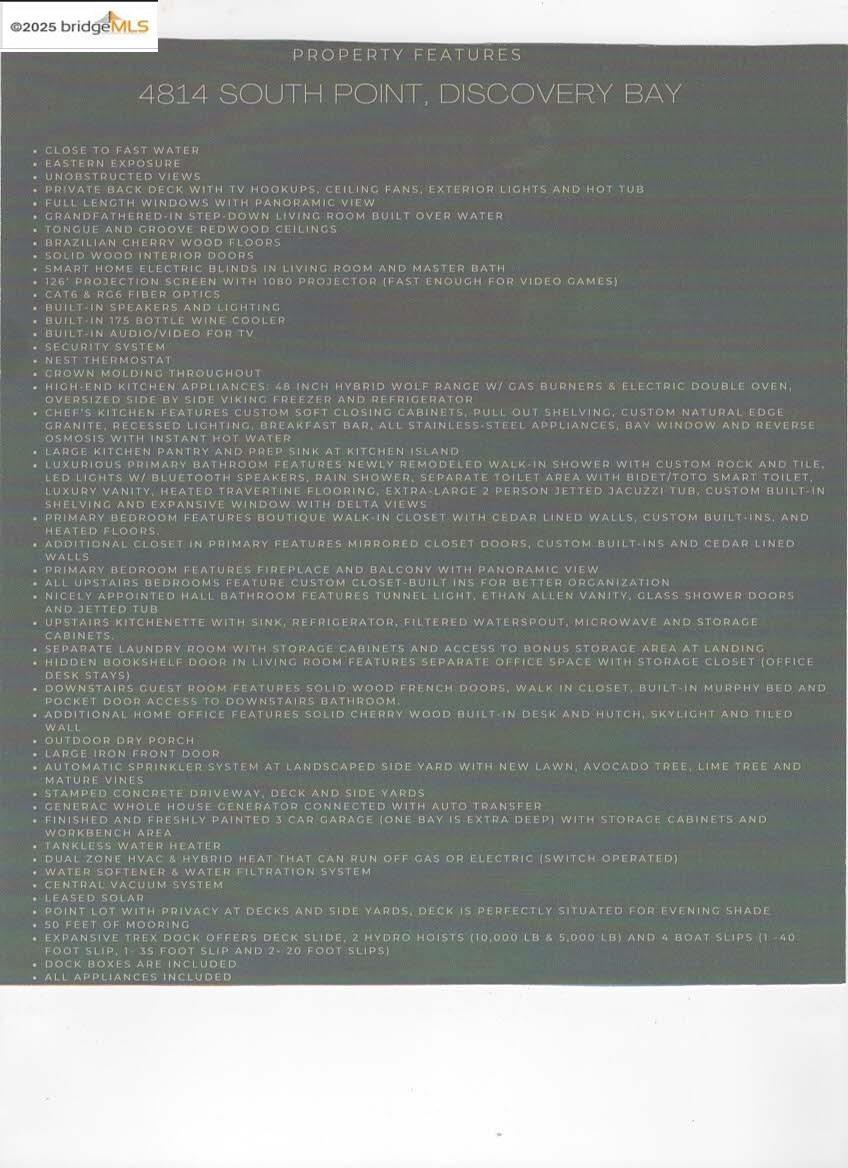 ONCE IN A LIFETIME OPPORTUNITY. Waterfront Luxury at its fullest. This house has all of the bells and whistles. Located minutes to FAST WATER part of Discovery Bay. Jump into your boat and sail away. Great for Water lovers and any one who wants to be apart of Discovery Bay Boating traditions. Golf club also within vicinity for the Golf lovers out there. Truly a great primary home or a great vacation home or a combination of the two. Enjoy a wonderful sunrises on the water without leaving your home of luxury. You can dock three boats at your very own pier. Also two Boat lifts to store your boat out of the water. Eastern exposure to enjoying the Delta. Hot Tub, Solar, heated floors, bidet, central vacuum, tank less water heater, Osmosis water filter, and much more. Open Sat and Sunday FROM 2 TO 4:30 PM EACH DAY.