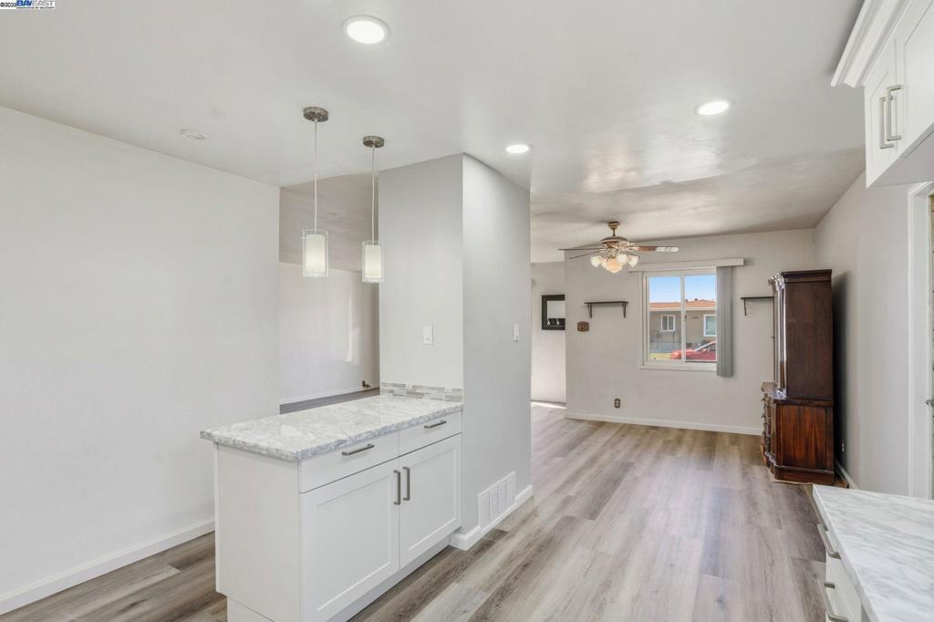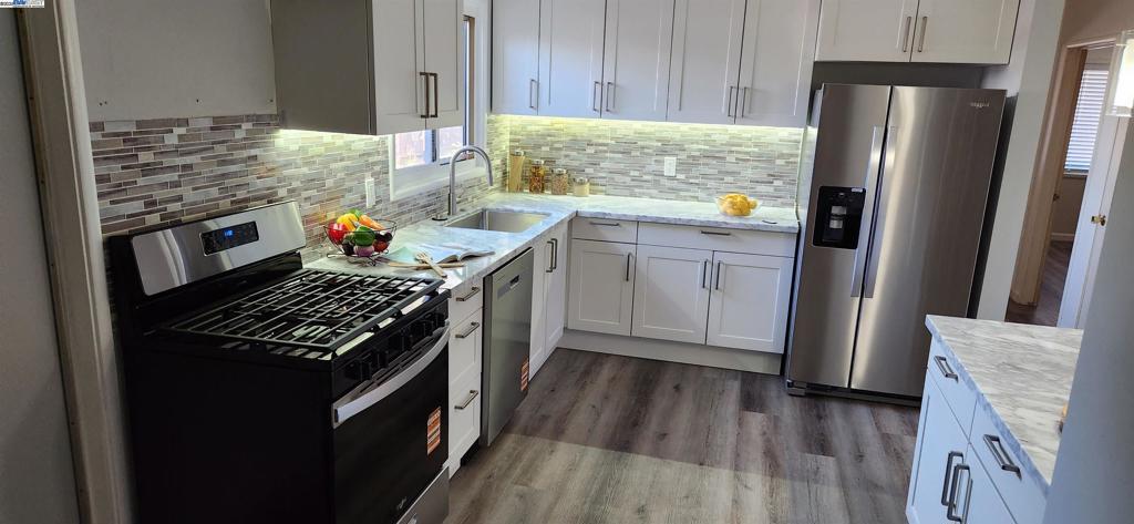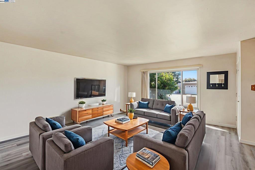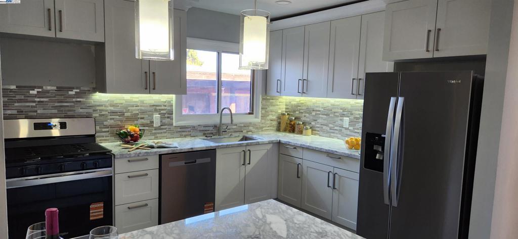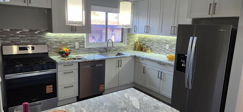 Welcome Home For The Holidays! This beautifully updated 3-bedroom, 1.5-bath home offers 1,182 sf of stylish living space on a 5,000 sf lot, right on the San Lorenzo border. Step inside to discover brand-new laminate flooring throughout and a fully remodeled kitchen featuring brand new appliances, under-cabinet lighting, pendant lighting over a spacious open-concept island, and modern finishes. The bathroom has also been completely renovated with a fresh, contemporary design. Outside, the home boasts fresh exterior paint, a landscaped front yard with a mature lemon tree, blooming rose bushes, and a 2-car garage. The fenced backyard includes multiple fruit trees and a covered patio perfect for relaxing or entertaining with convenient access through the rear garage door. Conveniently located to nearby restaurants, the new Via Toledo Park, schools and easy access to freeway 880. Don't miss this move-in ready gem!