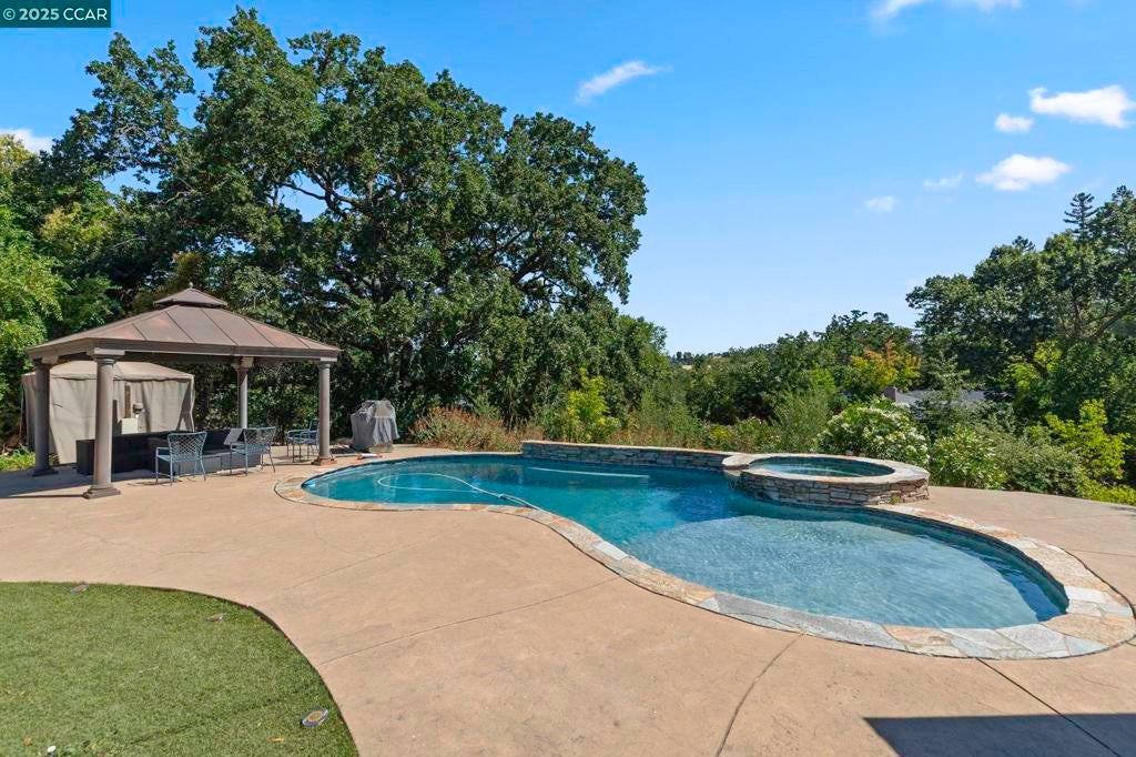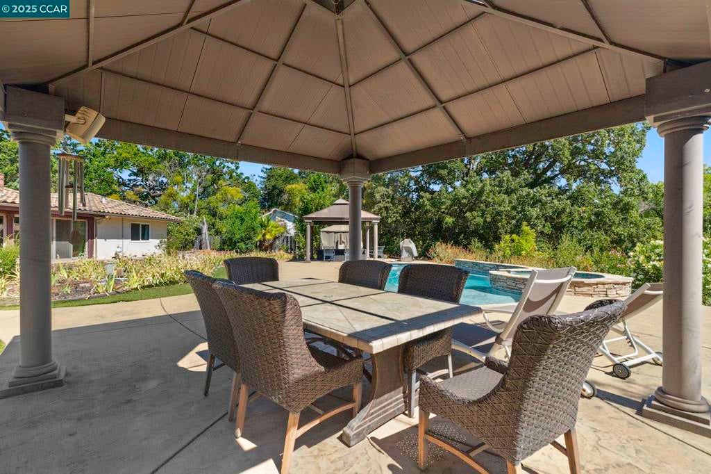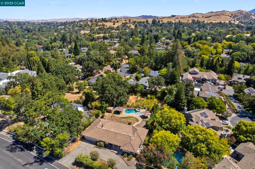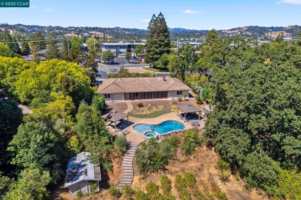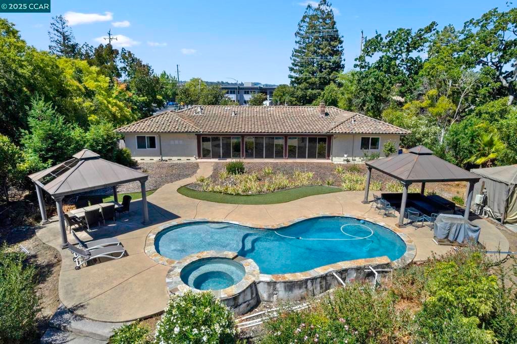 Discover the allure of this expansive single-story 4bd/2bth rancher with attached 1bd/1bth ADU situated steps away from the vibrant heart of downtown Broadway Plaza. Nestled on nearly three-quarters of an acre (0.73), this property presents an exceptional opportunity for significant expansion including an “additional” ADU or a potential subdividing lot subject to Walnut Creek's approval. The lot itself is a near-perfect rectangle, offering an ideal canvas for your vision. Be sure to review the drone photos for stunning overhead views. This residence is an entertainer and chef's dream, featuring a spacious cherrywood kitchen complete with elegant tile backsplash and a full suite of stainless steel appliances, including a double oven, chimney style hood. The home is bathed in natural light, thanks to the floor-to-ceiling wall to wall windows along the rear in the expansive bonus room. Primary bedroom on one end of the house, and three other bedrooms on the opposite side of home. The indoor laundry room is very spacious. Outside, there is a sparkling pool with water fountain, Baja Shelf and hot tub, spacious decks, two gazebos, grape vine field. AUD offers fully equipped kitchen, W/D, a full bath and split A/C and heater system. Located within the top rated Walnut Creek Schools.