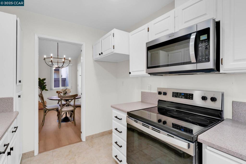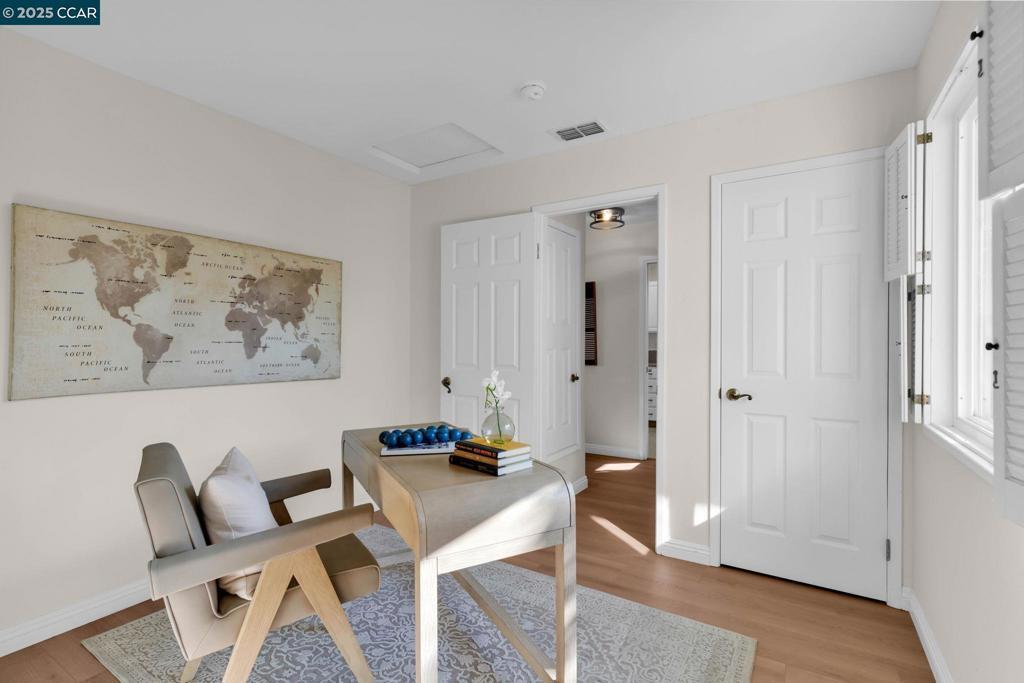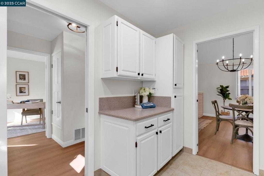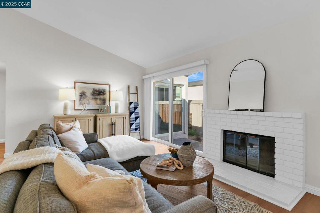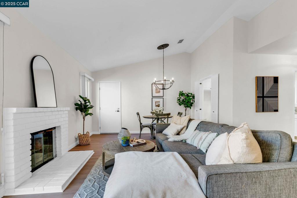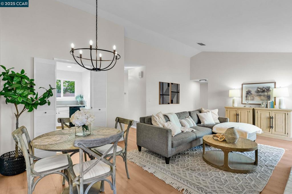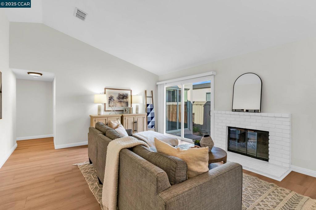 Spectacular single story end unit brimming with style and sophistication! Coveted neighborhood with a stunning surround of stunning Mt Diablo views! Splashed in natural light with vaulted ceilings, the spacious living room offers a cozy wood burning fireplace, new laminate flooring, new light fixtures, and walls of windows looking out to the sunny patio. Kitchen features include white cabinetry, solid surface counters, stainless steel appliances and designer black hardware. The primary bedroom is a tranquil retreat featuring vaulted ceilings, ample closet space and sliding French doors open to the quiet back patio. An updated bathroom has a newer vanity, stall shower and newer hardware and fixtures. A convenient office/3rd bedroom is situated in the middle of the unit and looks out to the quiet front courtyard. The attached two car garage is spacious and has laundry hook ups and storage space. Sunny and tranquil, the back patio is perfect for entertaining or romantic and elegant meals al fresco. This sought after location offers stunning views of Mt. Diablo and is just steps to the picturesque community swimming pool, scenic trails, and convenient proximity to charming downtown shopping and restaurants.