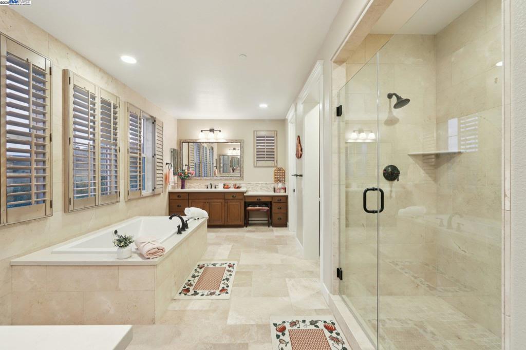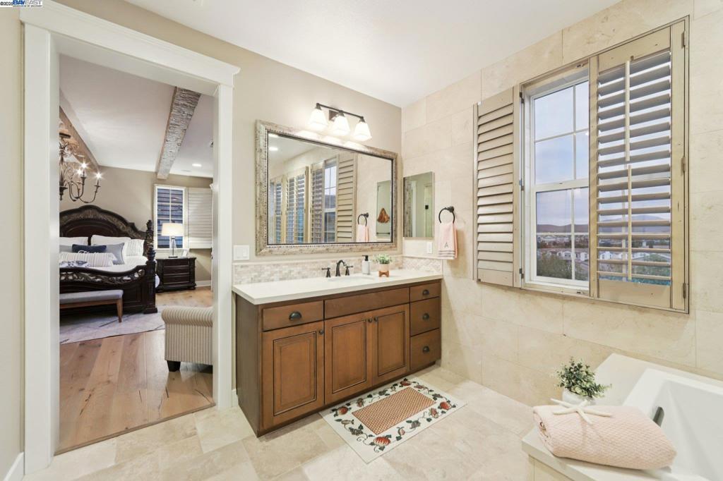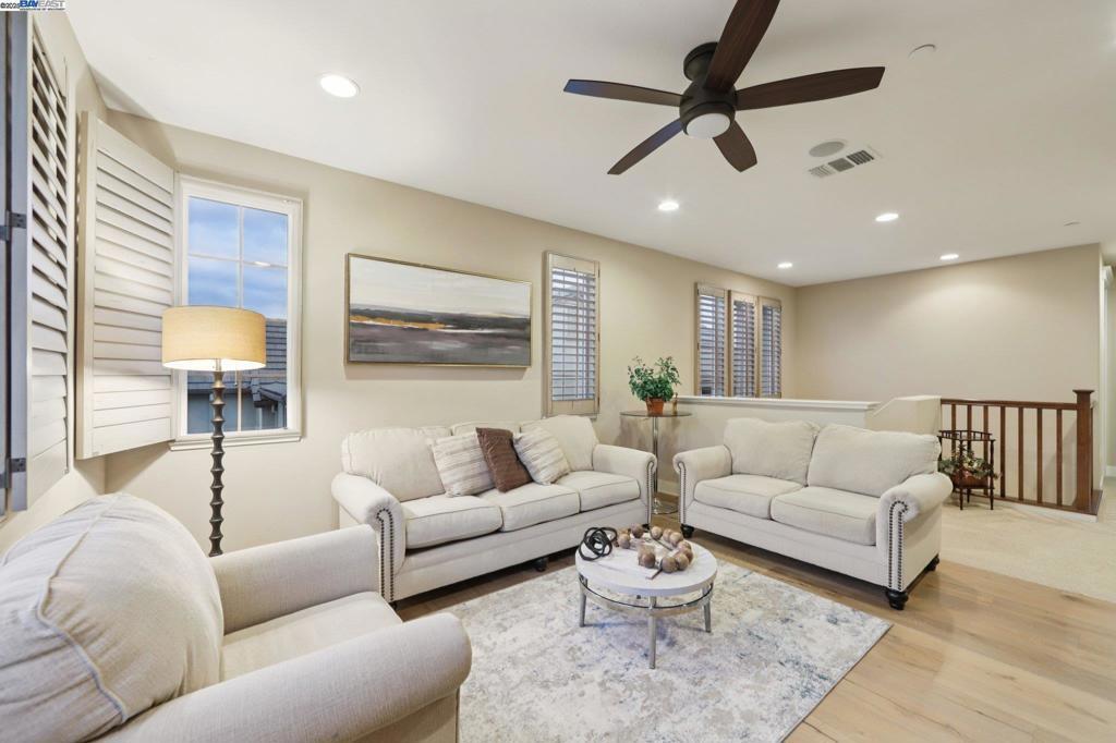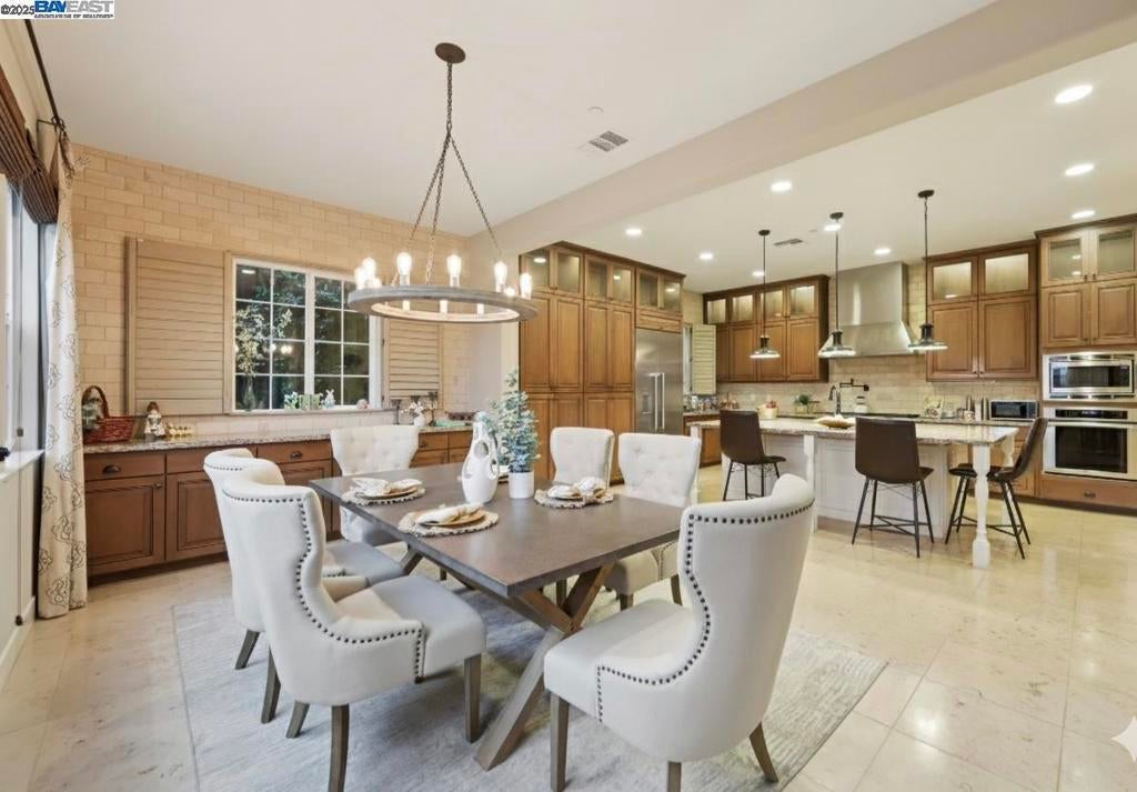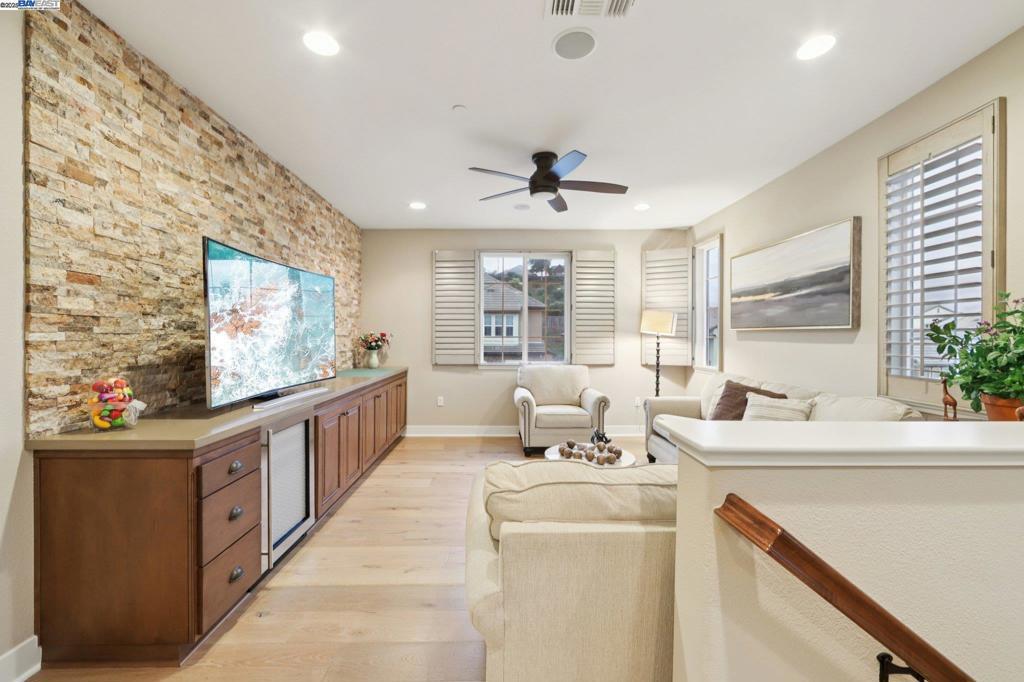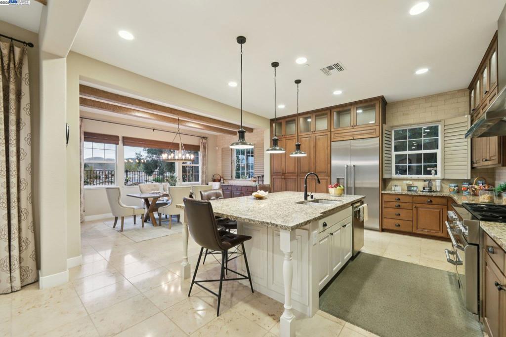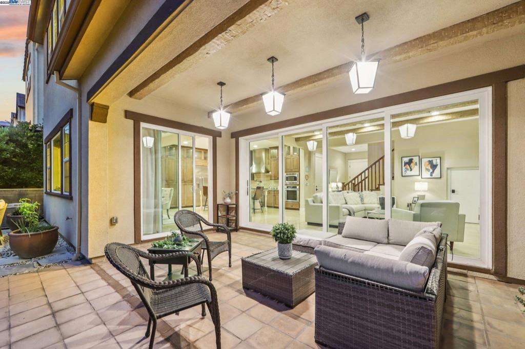 Stunning former model home with panoramic hill views from both levels and nearly $300K in upgrades on a premium view lot. Interior features include hardwood and stone tile floors, French maple cabinetry, beamed ceilings, built-ins, stone accents, wooden shutters, and surround-sound prewire. The gourmet kitchen offers ceiling-height cabinets, a large island, Thermador stainless steel appliances, a 48" range, and pot filler. The great room opens to the outdoor living area through an expandable glass wall for seamless indoor-outdoor flow. A first-floor bedroom with a full bath provides flexibility for guests or multigenerational living. The professionally finished backyard includes a covered tile patio, faux beams with pendant lighting, built-in KitchenAid BBQ with seating, and a gas fire pit, all overlooking rolling hills. Located near highly rated schools: John Green Elementary, Fallon Middle, and Emerald High. This home combines luxury finishes, modern design, and exceptional views throughout.