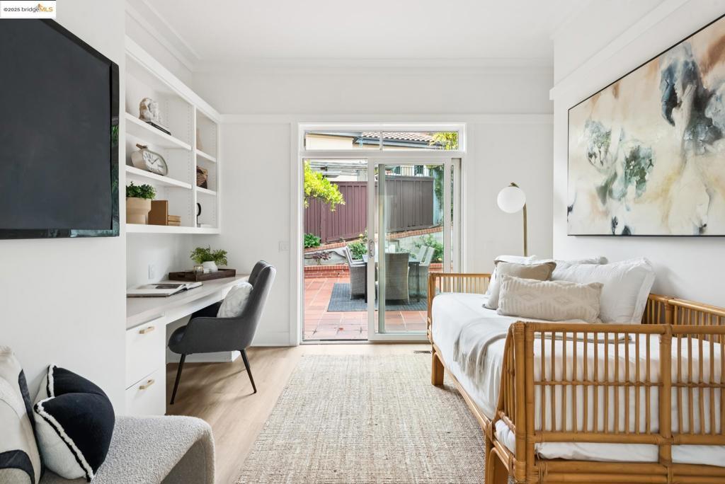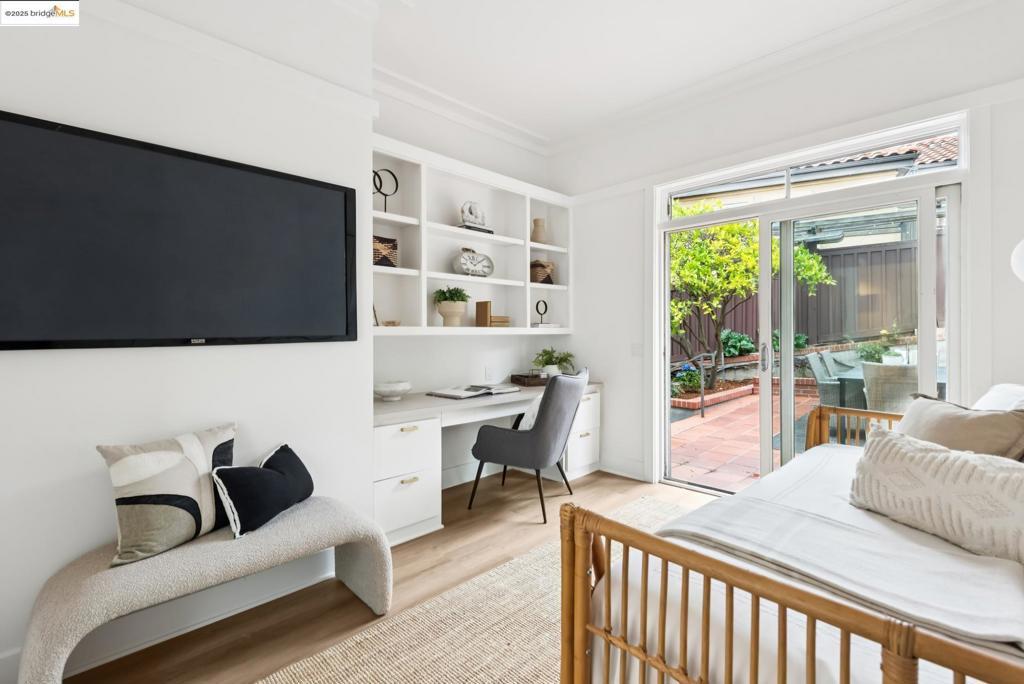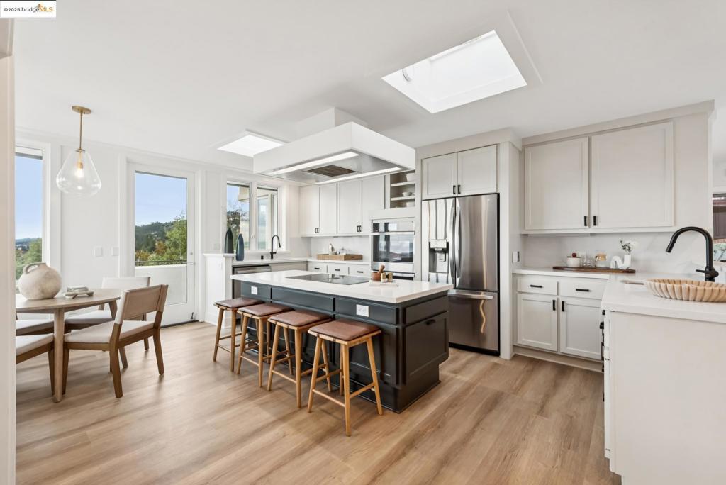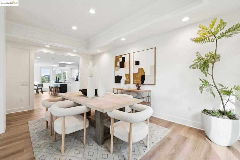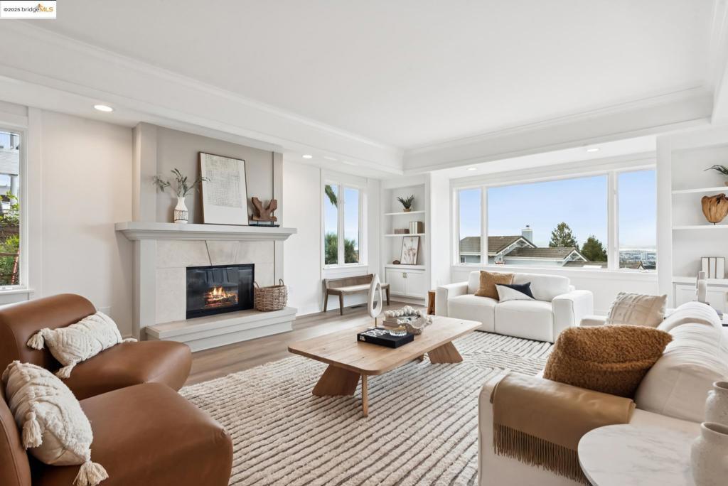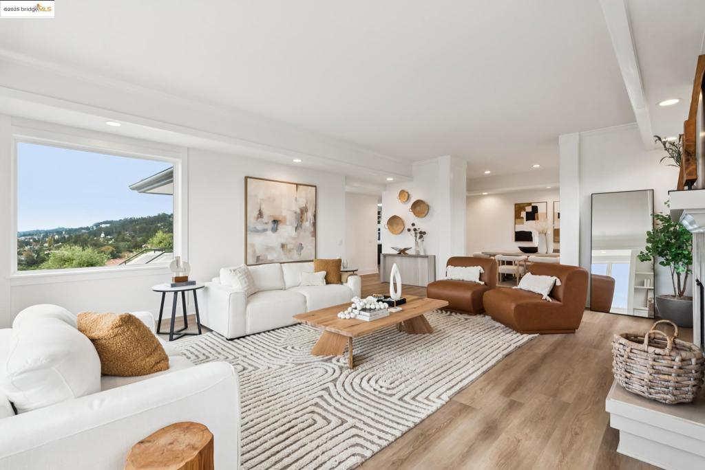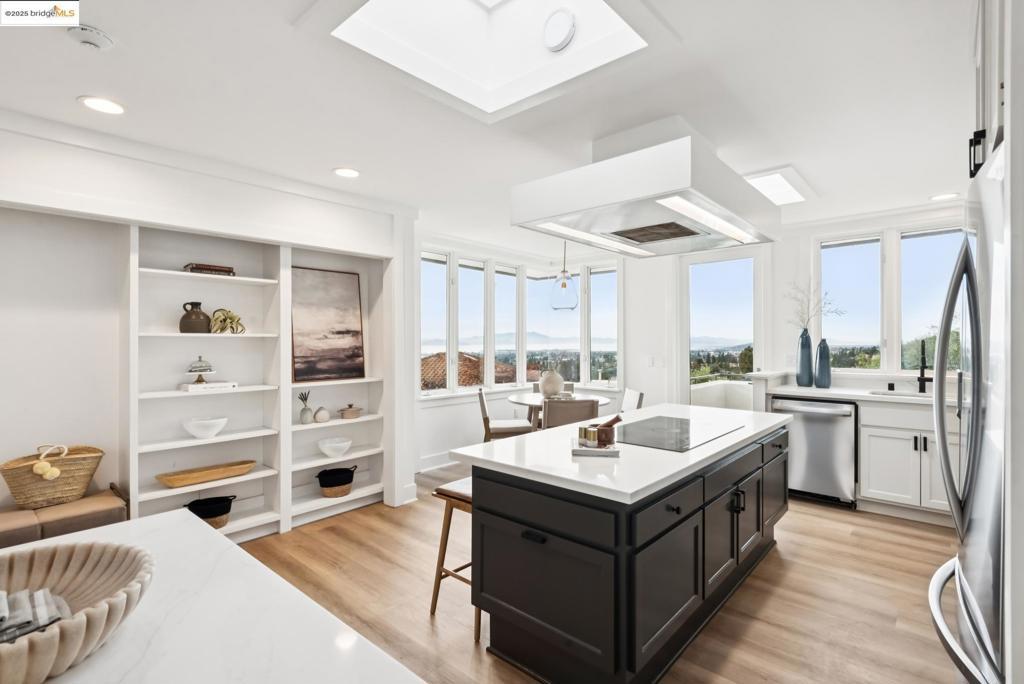 Perched in coveted Upper Rockridge, this contemporary home offers stunning panoramic views of the Bay and Berkeley Hills. The main level welcomes you with a gracious foyer and convenient elevator, opening to a spacious living room framed by expansive windows and breathtaking views. The large dining room and open, updated kitchen create a natural flow for entertaining. The primary suite features a brand-new spa-like bath, with two additional bedrooms and baths, laundry, and a powder room completing this level. A serene patio offers a private outdoor escape or ideal home office access. Downstairs, a separate suite with a generous family room, bedroom and bath provide flexible living space—perfect for guests, an au pair, or an in-law suite—with its own exterior entrance. A large garage with ample storage adds convenience and versatility. Ideally located near Rockridge shopping, dining, BART and top commuter options, this home combines style, comfort, and location in one exceptional package. Views: Downtown