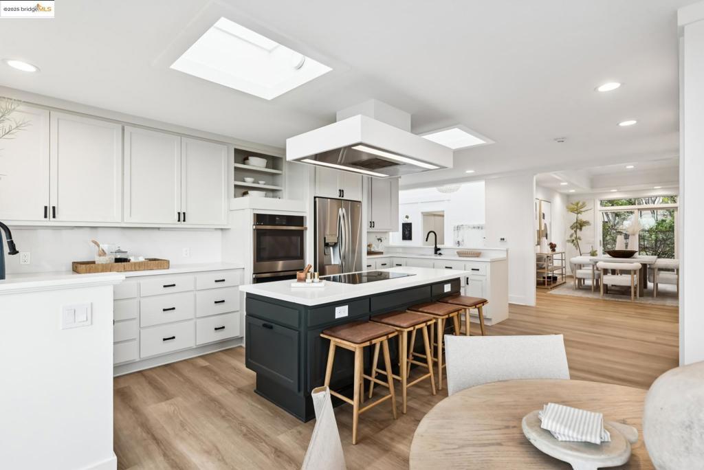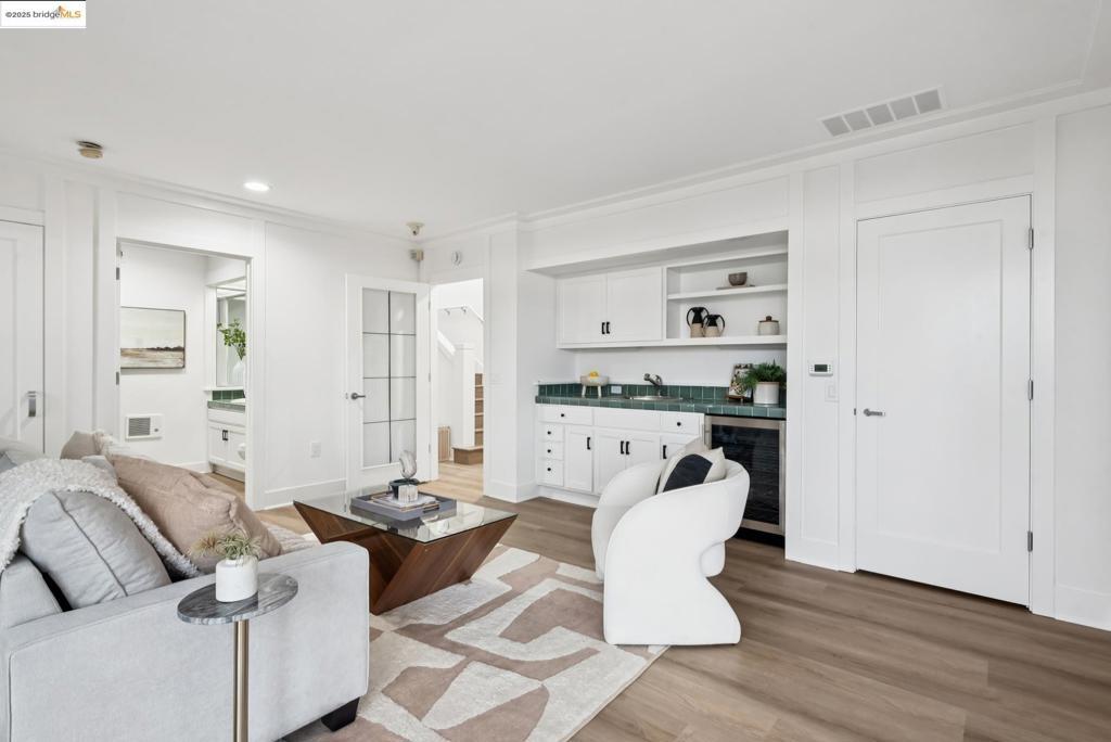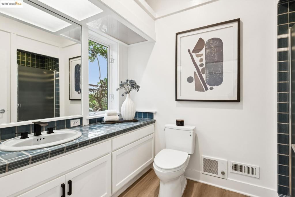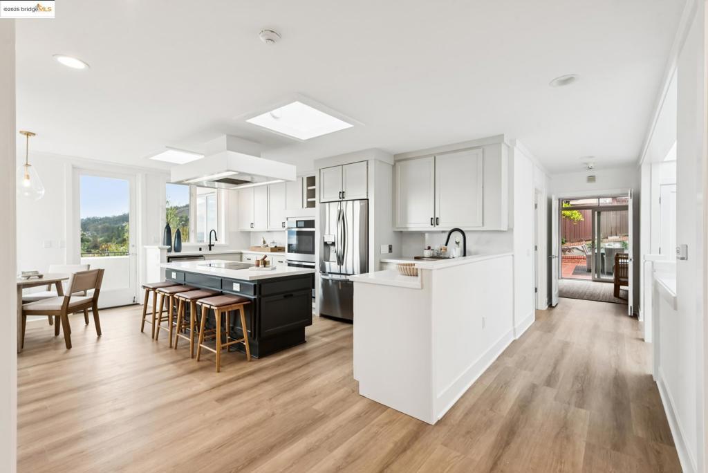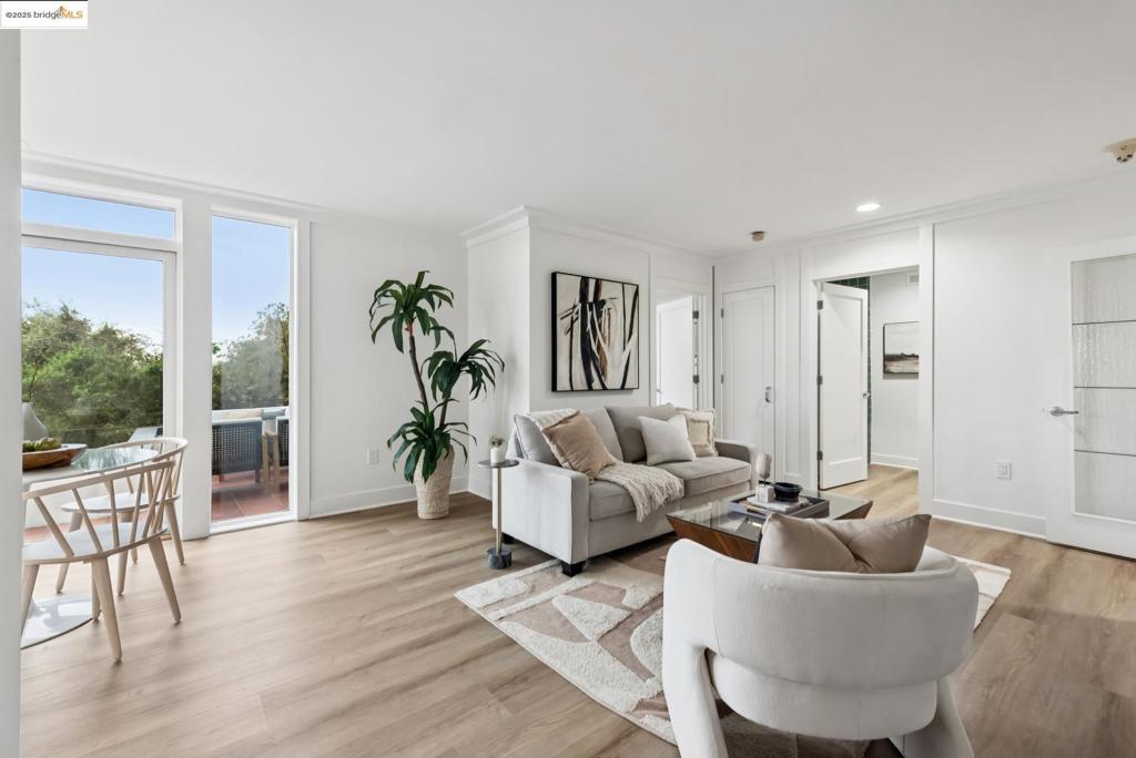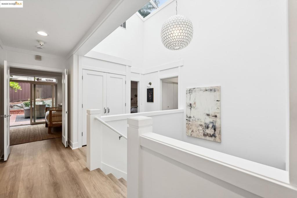 Perched in coveted Upper Rockridge, this contemporary home offers stunning panoramic views of the Bay and Berkeley Hills. The main level welcomes you with a gracious foyer and convenient elevator, opening to a spacious living room framed by expansive windows and breathtaking views. The large dining room and open, updated kitchen create a natural flow for entertaining. The primary suite features a brand-new spa-like bath, with two additional bedrooms and baths, laundry, and a powder room completing this level. A serene patio offers a private outdoor escape or ideal home office access. Downstairs, a separate suite with a generous family room, bedroom and bath provide flexible living space—perfect for guests, an au pair, or an in-law suite—with its own exterior entrance. A large garage with ample storage adds convenience and versatility. Ideally located near Rockridge shopping, dining, BART and top commuter options, this home combines style, comfort, and location in one exceptional package. Views: Downtown