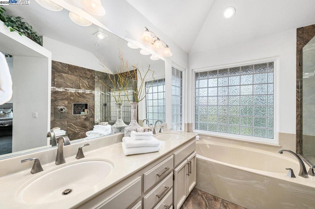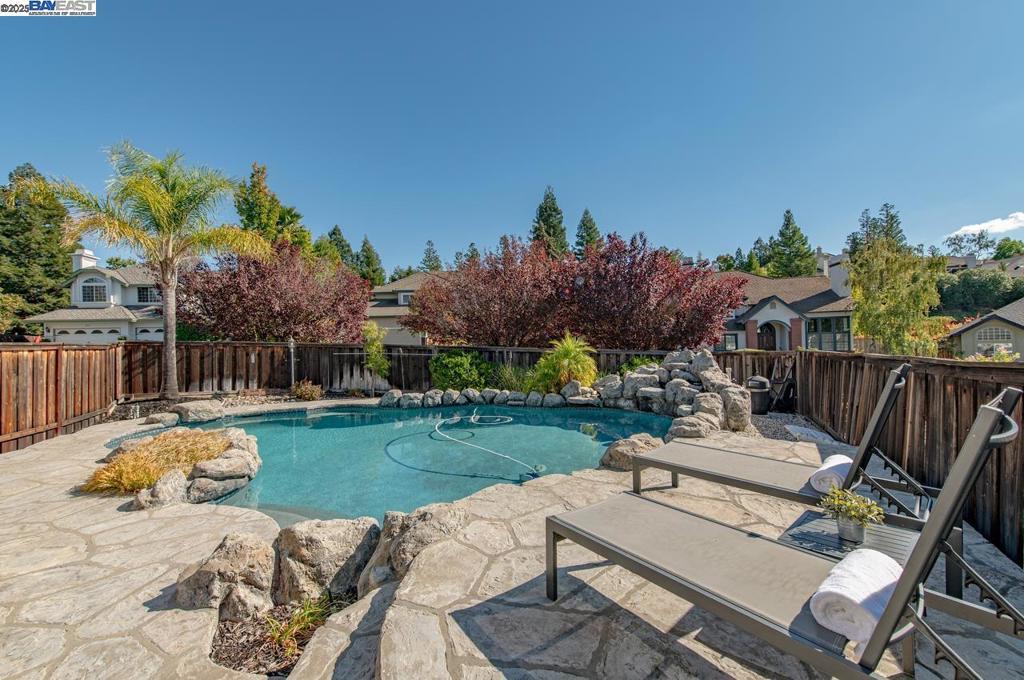 Tucked away at the end of a quiet cul-de-sac, this beautiful (EAST FACING) Vintage Heights semi-custom home welcomes you with a grand iron door that sets the tone for the style and sophistication within. The spacious 2837 sq. ft. floor plan features cathedral ceilings, spacious living room and formal dining, tile floors, a sweeping iron staircase, and abundant natural light. The heart of the home is the wonderful kitchen—complete with stone counters, large center island, pantry, custom cabinetry, and a charming breakfast nook overlooking the backyard. It’s the perfect gathering space for morning coffee or lively evenings with friends. The inviting family room opens to a serene backyard retreat featuring a pavered patio and a sparkling pool—ideal for summer entertaining. Elegant primary suite offers sweeping views of Mt. Diablo and a spa-like bathroom with a walk-in shower, large tub and generous closet space. There is an open landing that's perfect for home study. Spacious secondary bedrooms. Located in one of Pleasanton’s most sought-after neighborhoods, this home combines luxury, comfort, and an unbeatable location—close to top-rated Pleasanton schools, parks, and the vibrant downtown lifestyle Pleasanton is known for. Close hiking trails and wineries