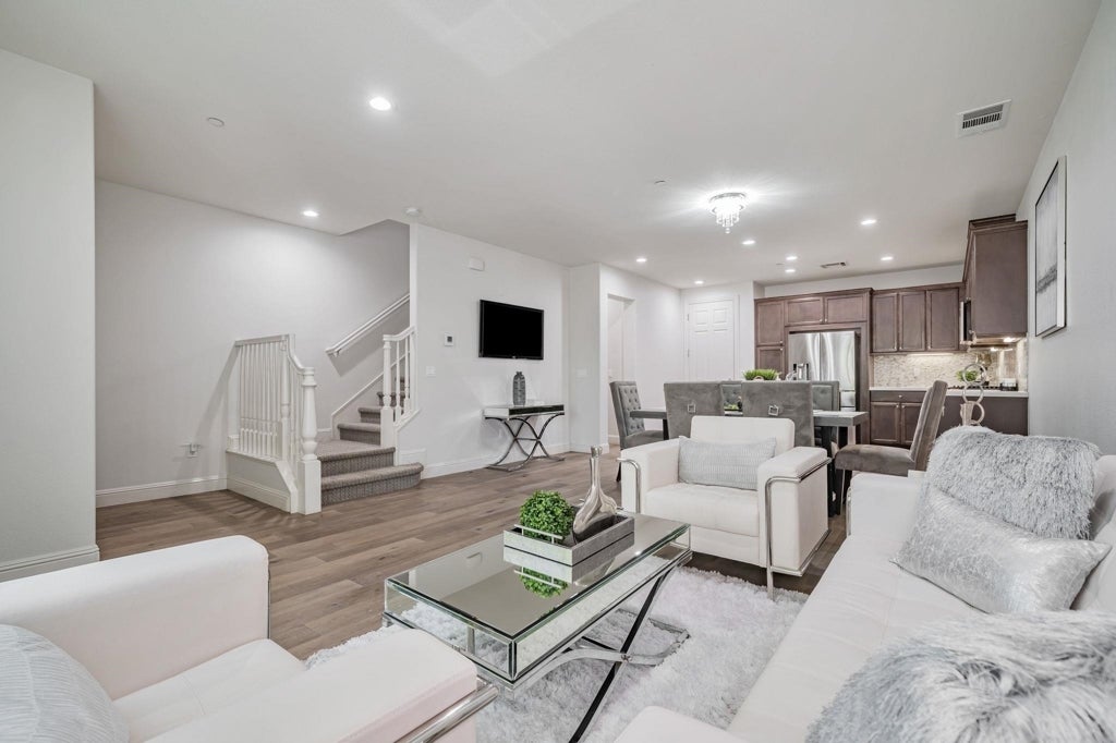 This Northwest-facing TWO STORY 3-bed + loft, 2.5-bath townhome-style condo is in the desirable Gale Ranch Cantera community, offering comfort, functionality, and prime location. Built in 2017, this upgraded home features an open-concept layout with natural light, high ceilings, and hardwood floors. The gourmet kitchen includes a large center island, granite countertops, gas range, and stainless steel appliances. The spacious great room flows into the dining area—ideal for entertaining or relaxing. Upstairs, the versatile loft with new chandelier can serve as a home office or playroom. The large primary suite includes dual walk-in closets and a spa-like ensuite. Secondary bedrooms are generously sized, each with walk-in closets. Additional features include dual-pane windows, recessed lighting, water softener, and a 2-car side-by-side garage with built-in storage. Located in a family-friendly neighborhood with walkable access to top-rated schools—Quail Run Elementary, Gale Ranch Middle, and Dougherty Valley High—plus nearby parks, trails, and shopping. Just minutes from Gale Ranch Plaza, BART, and major freeways for easy commuting.