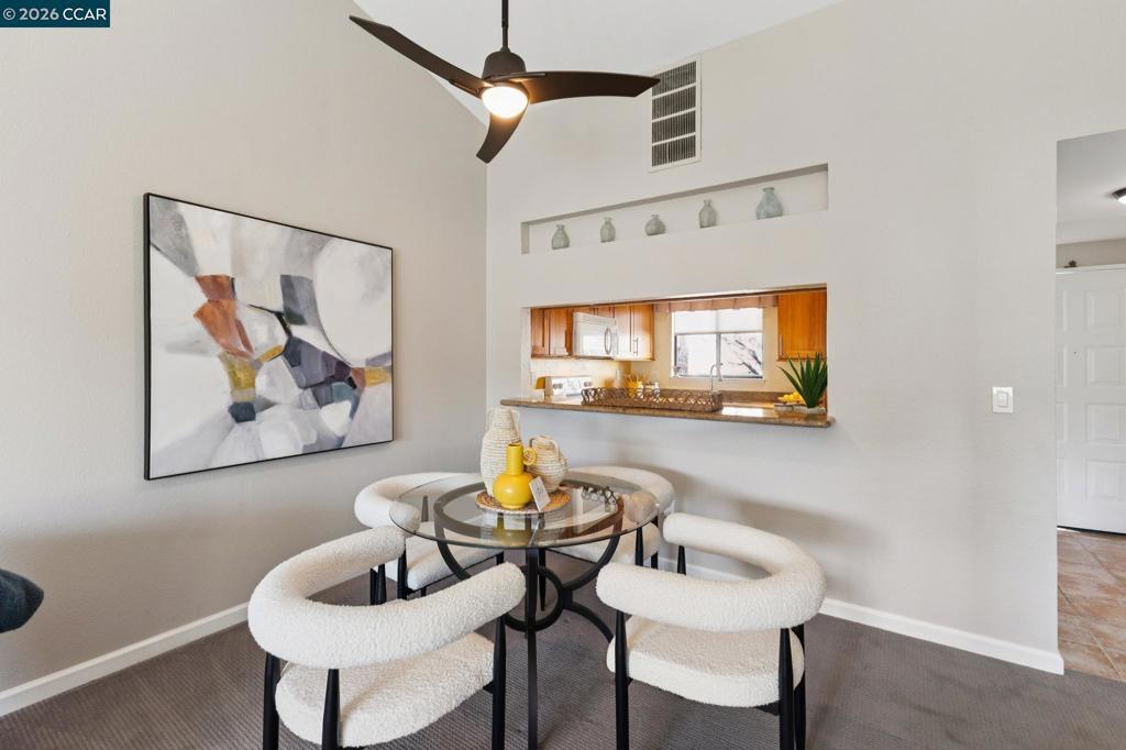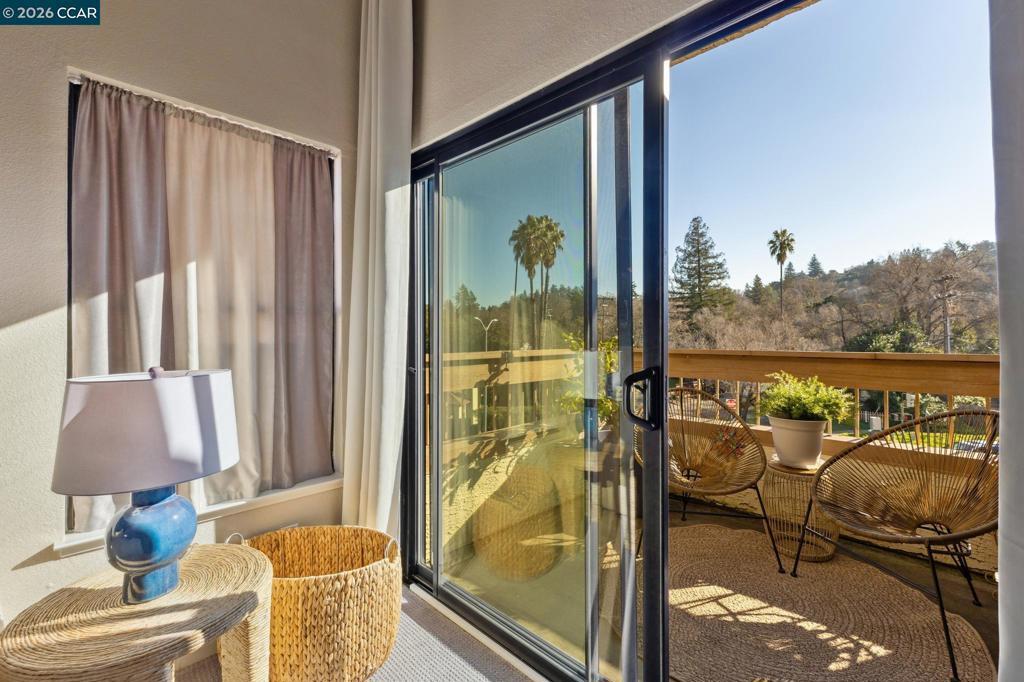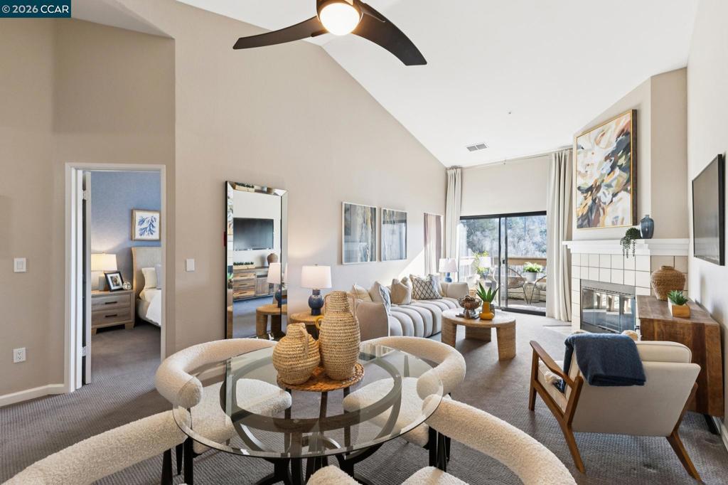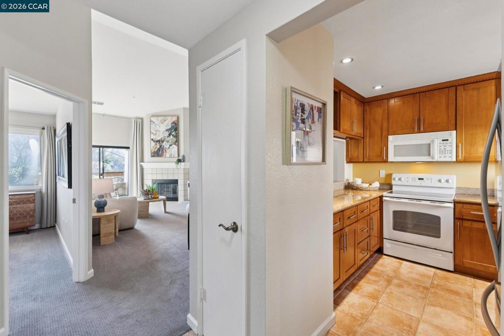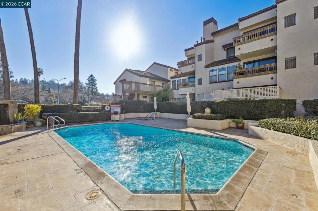 Light-filled and ideally located, this top-floor 1-bedroom, 1-bath corner condo offers 670 square feet of comfortable, open-concept living just moments from downtown Walnut Creek. Vaulted ceilings and abundant natural light create an airy feel, while the gas fireplace anchors the living space with warmth and character. The updated kitchen features granite countertops and flows seamlessly into the living and dining areas—perfect for everyday living and entertaining. Step out onto the private balcony to unwind and enjoy the elevated outlook. Additional highlights include in-unit washer and dryer, a dedicated parking space, a ceiling fan in the living room, and a thoughtful mix of carpet and tile flooring. Set within a well-maintained community offering a resort-style pool, jacuzzi, and clubhouse. HOA dues include water and trash. Located near top-rated schools, shopping, dining, BART, and commuter routes, this home delivers convenience, comfort, and lifestyle in one smart package.