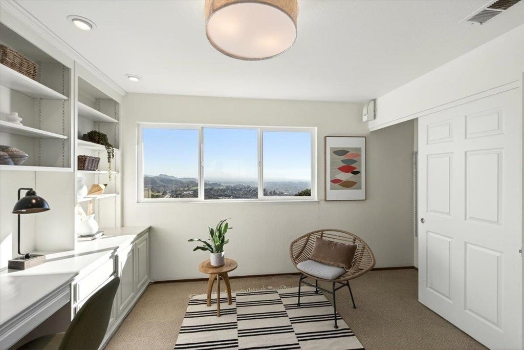 Set within the prestigious Ridgemont community, this exceptional two-story residence offers 3,128 square feet of sophisticated living with 4 bedrooms and 2.5 baths, designed to capture panoramic views of San Francisco, the Bay, and the iconic Golden Gate Bridge. Three bedrooms are framed by stunning vistas, while the formal living room with fireplace and the formal dining room provide elegant settings for refined entertaining. The updated kitchen opens to the family room, where a second fireplace creates a warm yet elevated atmosphere. The primary suite is a luxurious retreat with sweeping views and a spa-inspired bath featuring Bluetooth speakers and a striking mural of the Bay Bridge. A media room with wet bar enhances entertaining, while opening the hidden door reveals the fourth bedroom with a distinctive speakeasy-inspired touch. Recent updates include new carpet with refreshed bathrooms and kitchen. Outdoors, lush green lawns await you, with a patio off of the dining room, a private courtyard in front, and a backyard pergola that invite relaxation. A three-car garage adds convenience, select Rogue Fitness home gym equipment that may be sold separately. The HOA offers 24/7 private security and a community pool.