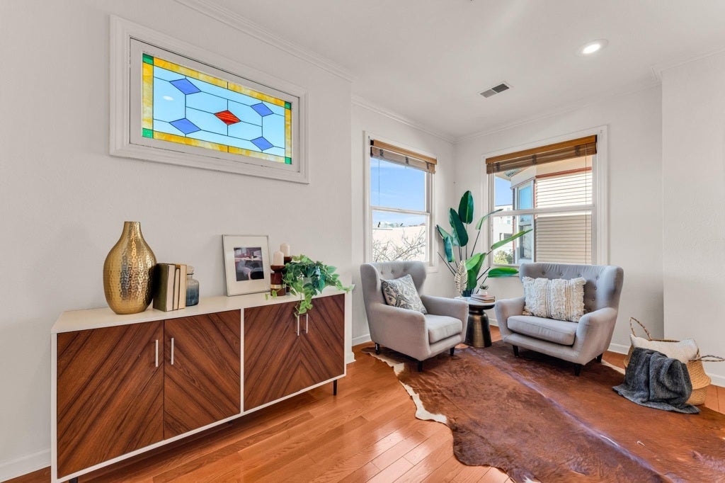 Introducing an Uptown flat in a boutique 6-unit Victorian building. This condo feels like a single-family home with a generous living area and proper dining room both with gleaming hardwood floors. Two generous sized bedrooms boast large walk-in closets and fresh carpet. Upper corner location with lots of energy efficient windows bring in natural light. The unit benefits from a spacious office so you can work from home. A private balcony off the primary bedroom provides a spot to enjoy the outdoors in the sun or unfurl the retractable awning for some shade. An oversized attic for storage and endless possibilities. Condo features in unit laundry, deeded parking for one car, and integrated fire sprinklers for safety. The complex is self-managed with low HOA dues. The exterior has been recently painted to feature its Victorian architecture. Uptown is one of Oakland’s most vibrant neighborhoods with the historic Paramount and Fox theaters, along with some of Oaktown’s most popular restaurants. Grocery shop at nearby Whole Foods and Sprouts. Enjoy all the activities and beauty of Lake Merritt. For transportation; BART is just a 1 1/2 blocks away and easy freeway access to SF and beyond. Walk score of 97. This is the downtown jewel you have been looking for!