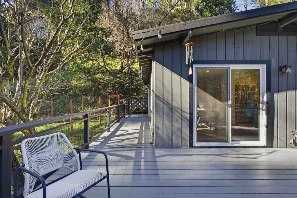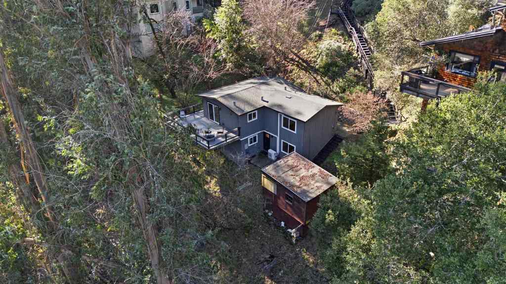 Tucked into the Oakland Hills on a rare double lot, this mid-century-style home offers a peaceful, nature-surrounded setting with the convenience of city access. The open-concept upper level connects the living room, dining area, and kitchen, filled with natural light and featuring hardwood floors, updated millwork and appliances, and energy-efficient windows throughout. A brick fireplace anchors the space, accented by a birch threshold for a refined, modern touch. Comfortable bedrooms offer great light and storage, while refreshed interior finishes and updated flooring on the lower level add move-in-ready appeal. Outdoor living shines with a wrap-around deck and expansive patio, ideal for entertaining, relaxing, and enjoying the surrounding trees and wildlife. The hillside landscape is dotted with native California plants. Located just minutes from Montclair Village, neighborhood parks, Highway 13, and key commuter routes, this home blends retreat-like privacy with everyday Oakland convenience.