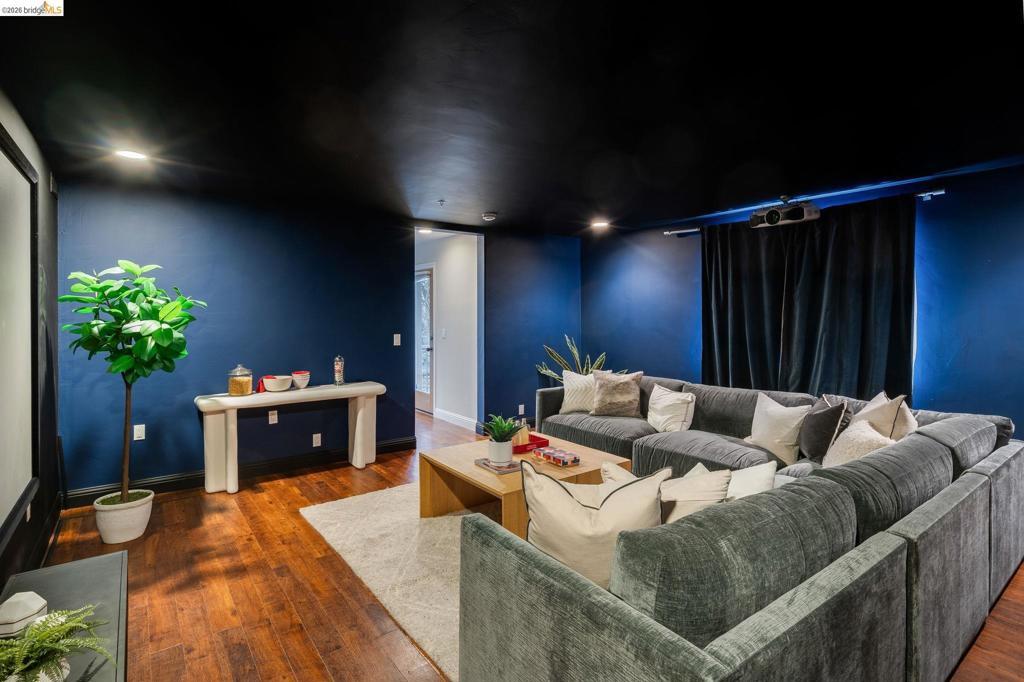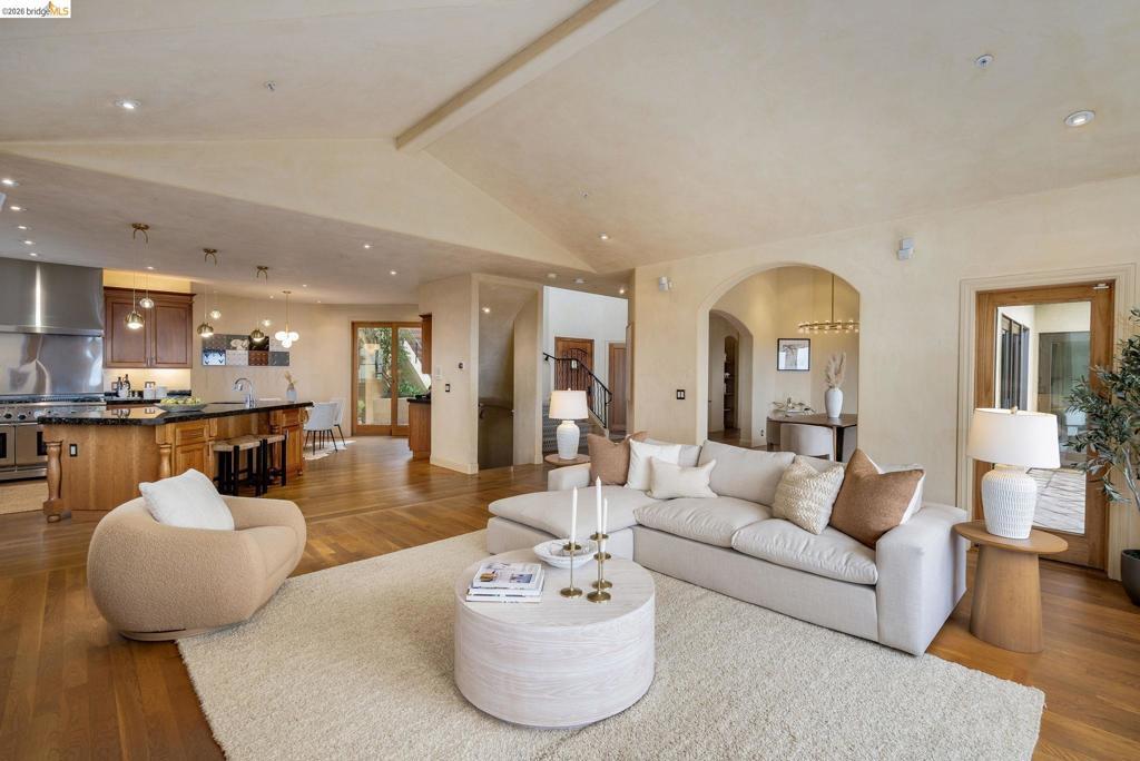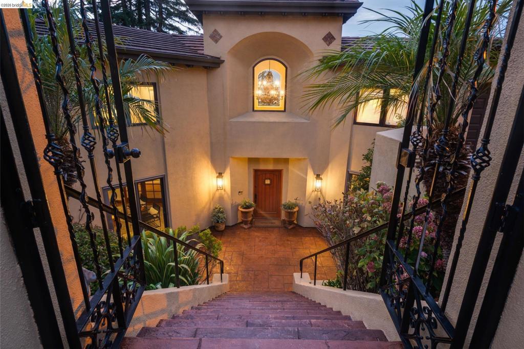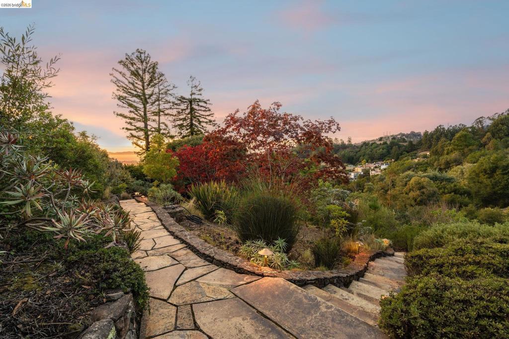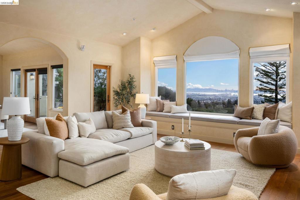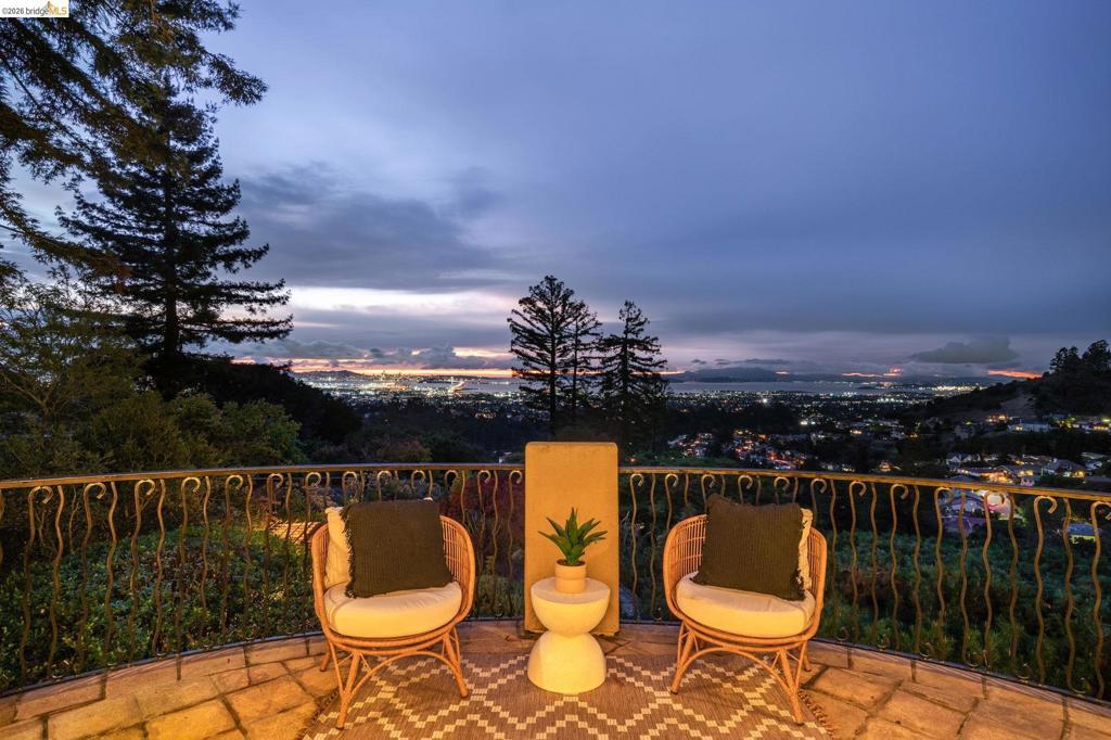 Amazing panoramic views of the San Francisco skyline, the Golden Gate Bridge, the Bay Bridge, the Richmond Bridge, and glittering bay waters define 6257 Virgo Road, a one-of-a-kind Montclair hillside estate perched on a tranquil street. More than 5,100 sq ft of refined, move-in-ready living sits on a lushly landscaped 14,544 sq ft lot, with seamless indoor-outdoor flow built for elevated everyday living and unforgettable entertaining. An expansive chef’s kitchen opens to formal living and dining rooms with soaring ceilings and walls of glass framing the views. A sunlit, dedicated office creates the ideal work-from-home sanctuary. Four spacious bedrooms and 3.5 spa-inspired baths include a showstopping primary suite with a fireplace, sitting area, and a boutique-caliber walk-in closet with custom built-ins. Downstairs, enjoy a home theater plus gym or flex space. Outside, a generous yard is enhanced by a seasonal creek and a charming handcrafted bridge, perfect for morning coffee and golden hour gatherings. Owned solar with Tesla Powerwalls, hardwood floors, and three gas fireplaces complete this exceptional offering. Minutes to Montclair Village, parks, and easy commuter routes. Views: Downtown