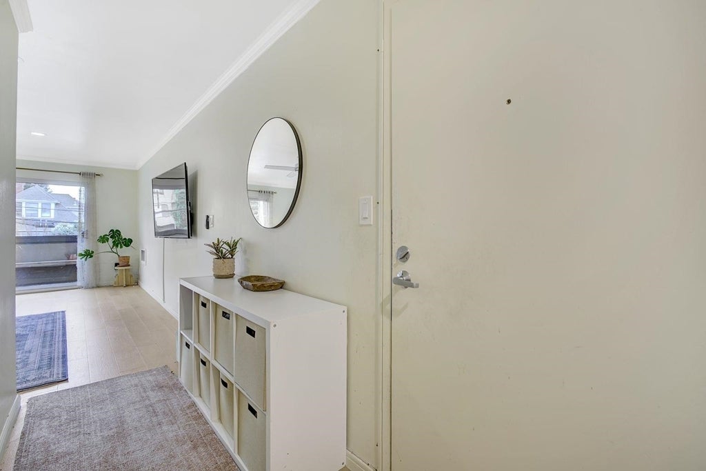 Perched on the top floor, this sun-filled corner residence delivers the best of Adams Point living. Located at 407 Orange Street, Apt 410, just moments from Lake Merritt, Uptown, and Piedmont, this home blends modern comfort with unbeatable urban access. The bright, airy living space is bathed in natural light, with sliding glass doors opening to a private deck—perfect for morning coffee or evening unwinding. The bedroom is thoughtfully positioned so it does not share walls with neighboring units, offering enhanced privacy and quiet. Recent upgrades include engineered hardwood floors, sleek LED lighting, and elegant crown molding throughout. The updated kitchen shines with quartz countertops, stainless steel appliances, and a new sink and faucet. Ample storage, convenient shared laundry just down the hall, elevator access, and a dedicated parking space in the gated garage complete the package. With quick access to Highway 580, this is effortless Bay Area living at its finest. Some photos have been digitally altered.