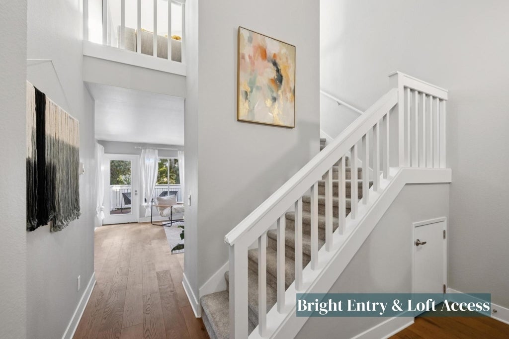This unique two-story loft-style 1-bedroom, 1-bath condo offers 915 sq ft of flexible, light-filled living in the highly sought-after Marina Lakes community. Unlike typical one-level units, this home features a true upstairs loft, creating an open, architectural feel that’s perfect for modern living, working, and entertaining. The main level includes a spacious bedroom with ample closet space, a full bathroom, and an in-unit washer and dryer for everyday convenience. The living area is finished with luxury vinyl flooring and flows into a stylish kitchen with quartz countertops and stainless steel appliances. Upstairs, the open loft overlooks the living area and captures peaceful Bay Trail views, making it ideal as a home office, guest space, or creative studio a rare and highly desirable feature that sets this home apart from others in the community. Residents enjoy resort-style Marina Lakes amenities including two swimming pools, hot tubs, a fitness center, lighted tennis and pickleball courts, EV charging stations, a community garden, and clubhouse access. Located just blocks from Marina Bay Yacht Harbor, waterfront trails, parks, and the Sunday Farmers Market, plus easy access to the Richmond Ferry Terminal and freeways.