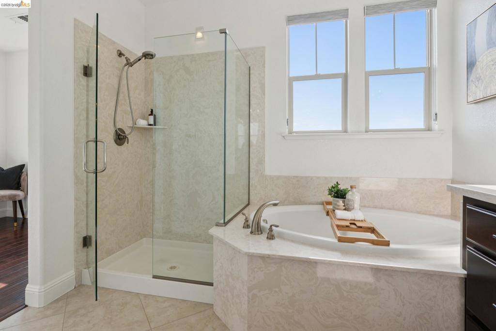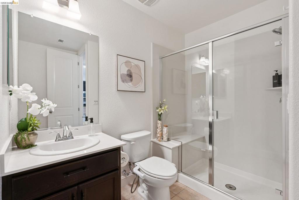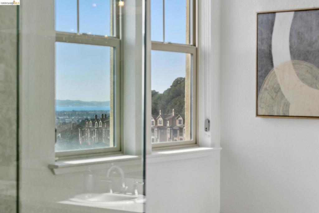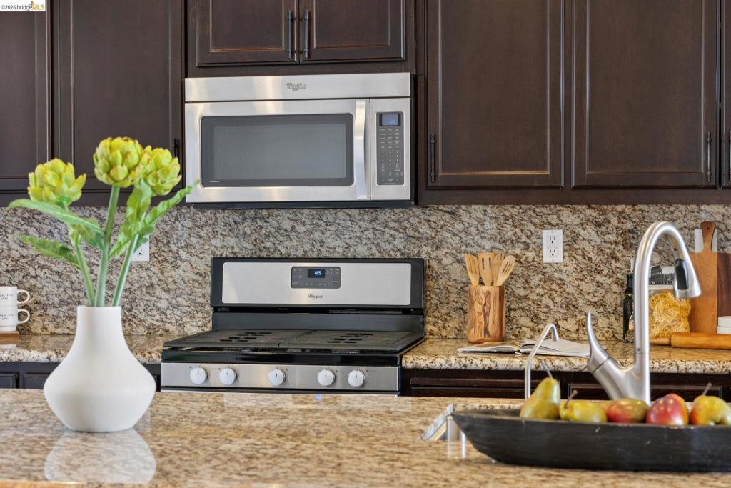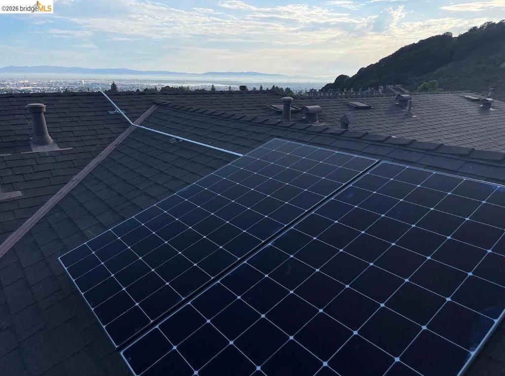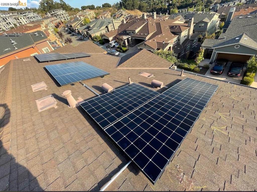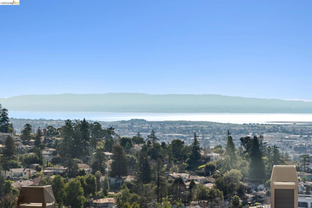 Stunning contemporary townhome with panoramic San Francisco Bay views, located in the desirable Monte Vista Villas community in Oakland Hills. Built in 2013, this 4-bedroom, 3-bath residence offers an open floor plan filled with natural light and hardwood floors. The main level features an open living and dining area that opens to a view balcony, along with a chef’s kitchen equipped with stainless steel appliances, granite countertops, a large center island, ample storage, and access to a private rear patio with avocado and pomegranate trees, ideal for entertaining. A full bedroom and bathroom on this level provide excellent flexibility. Upstairs, the spacious primary suite enjoys bay views and a spa-style bathroom with dual vanity and soaking tub, accompanied by two additional bedrooms, a full bath, and a laundry room. Additional upgrades include an owned 3.4 kW solar system, EV charger, hot water recirculation system, reverse osmosis drinking water filtration, home security system with outdoor cameras, automated Stoneside blinds, and an automated garage with MyQ monitoring. An oversized attached two-car garage offers direct interior access. Community amenities include a clubhouse, fitness center, walking paths, and playgrounds. Easy access to highway 580, 13 and 24.