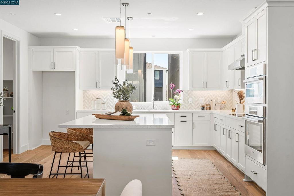 Move-in ready new construction home by award-winning SummerHill Homes, in highly desirable City Village community. Three-story row home w/ over $67,000 in upgrades blending contemporary architecture with curated designer finishes. Featuring three levels of modern living, this home showcases an open-concept main level with expansive living & dining areas, enhanced by wide-plank hardwood flooring in a warm Vintage Wicker tone. Chef’s kitchen has Bosch 800 Series ss appliances, induction cooktop, convection oven, speed microwave, stainless hood & dishwasher. White shaker cabinetry, polished nickel hardware, quartz slab countertops & full-height vertical herringbone mosaic backsplash create a clean, sophisticated aesthetic. Throughout the home, recessed LED lighting, under-cabinet lights, CAT6 structured wiring, & pre-wiring for security system. Snowbound interior paint & smooth panel doors enhance the light, airy feel. Spacious primary suite w/ upgraded Piedrafina vanity surfaces, polished chrome fixtures & framed shower enclosure. Secondary baths feature coordinated finishes, tile flooring & quality Kohler fixtures. Plush Anderson Tuftex carpet adds comfort to select living areas. City Village offers convenient access to shopping, dining, top-rated schools & freeway access.