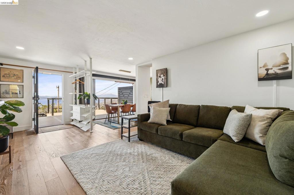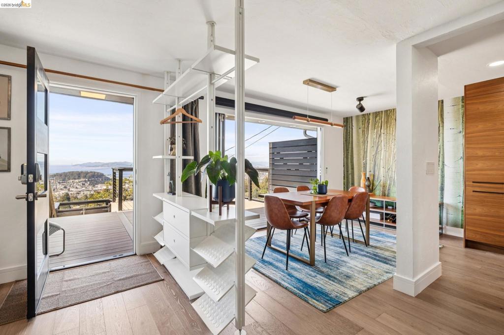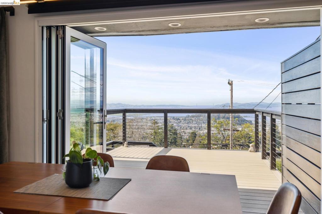 Mid-century modern home with breathtaking views of the Bay Bridge, Golden Gate Bridge, San Francisco skyline, and Mt. Tamalpais. An open floor plan captures the views from the kitchen, dining, and living areas, creating a natural flow for both everyday living and entertaining, with seamless access to an expansive deck for indoor-outdoor living. Thoughtfully updated throughout, the home features a modern kitchen, two full bathrooms, a bright laundry room, and a flexible office space. Each bedroom features its own updated en-suite bath. Recent improvements include newer windows, updated electrical, EV charger installation, a newer deck, added wall insulation, and upgraded plumbing. Approximately 0.3 miles to shops and amenities in Kensington Village.