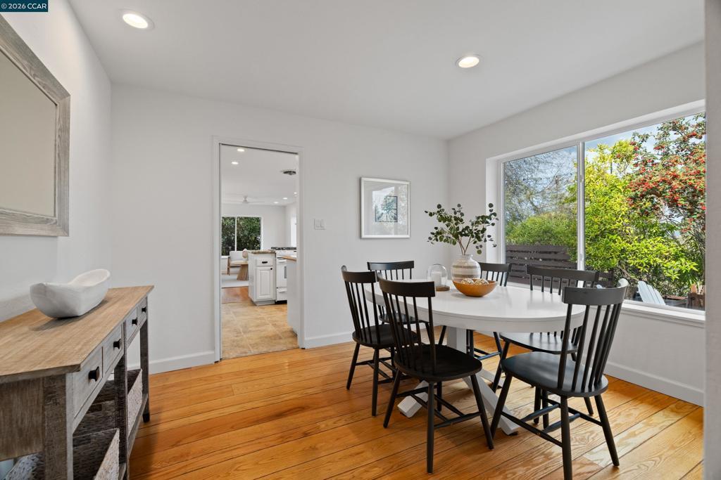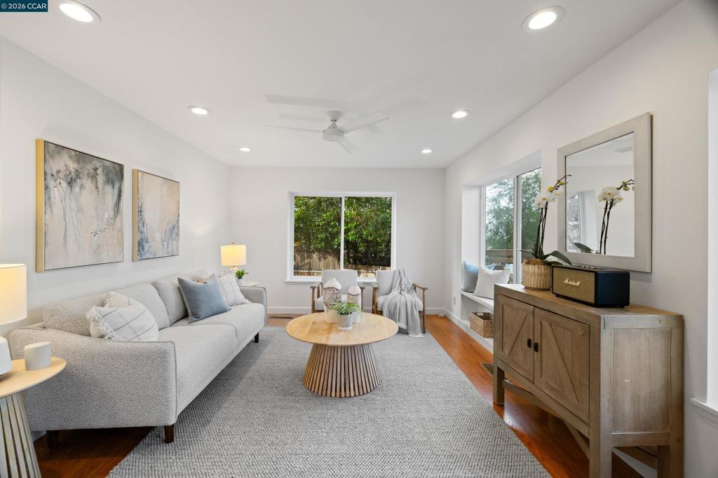 Do not miss this stunning single-story hillside retreat offering sweeping views and an effortless year-round indoor/outdoor lifestyle. Just a short stroll to the scenic trails and open space of Larkey Park, this home blends privacy with convenience. Step into the spacious living room, where floor-to-ceiling windows frame the landscape, and natural light pours in throughout the day. The updated kitchen features sleek granite countertops with breakfast bar seating, crisp white cabinetry, a garden window, stainless steel double sink, abundant storage, and an open flow to the family room with picturesque windows and a charming bench seat. The generous primary suite offers sliding glass doors to the backyard and an ensuite bath. Two additional well-sized bedrooms share a sizable hall bath with separate tub and walk-in shower. Designed for entertaining, the backyard showcases an expansive view deck surrounded by mature trees, a level lawn area, play structure, and stunning hillside vistas. Whether hosting friends or enjoying a quiet morning coffee, the setting feels both serene and connected. Additional features include recessed lighting, hardwood flooring throughout, and a two-car attached garage. All just minutes to downtown Walnut Creek and short walk to trails and park.
