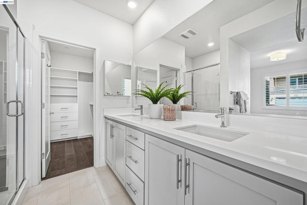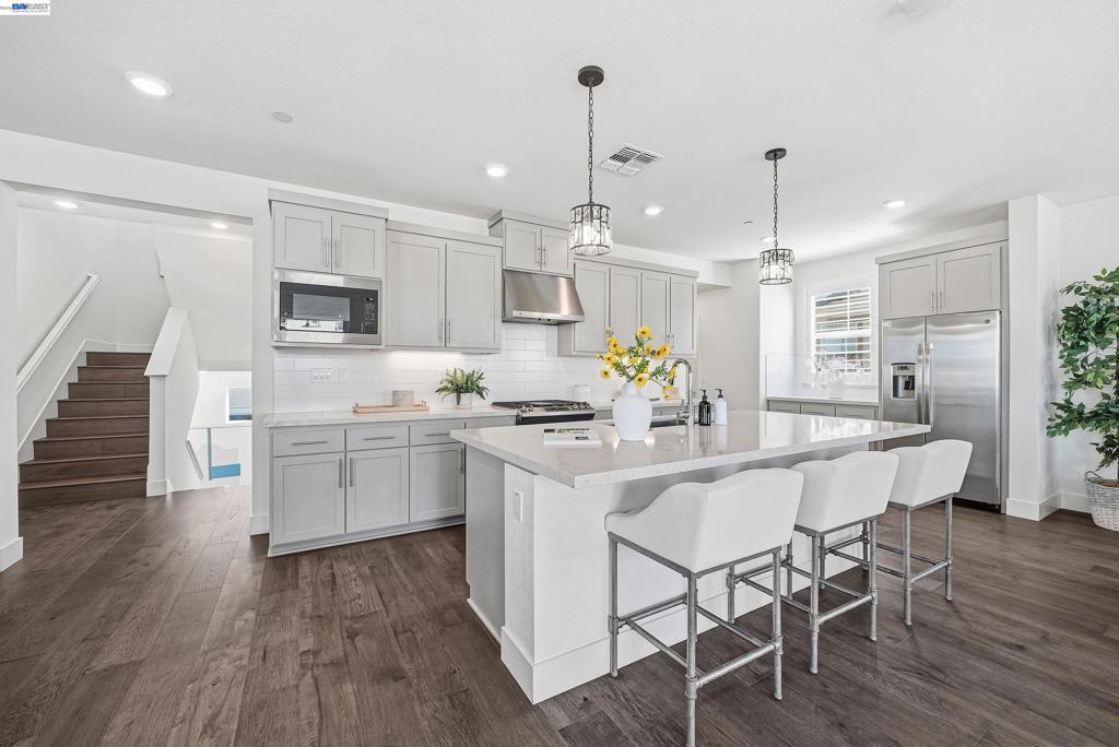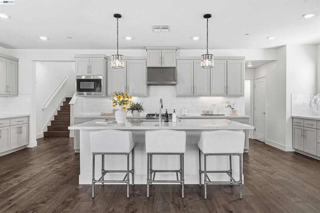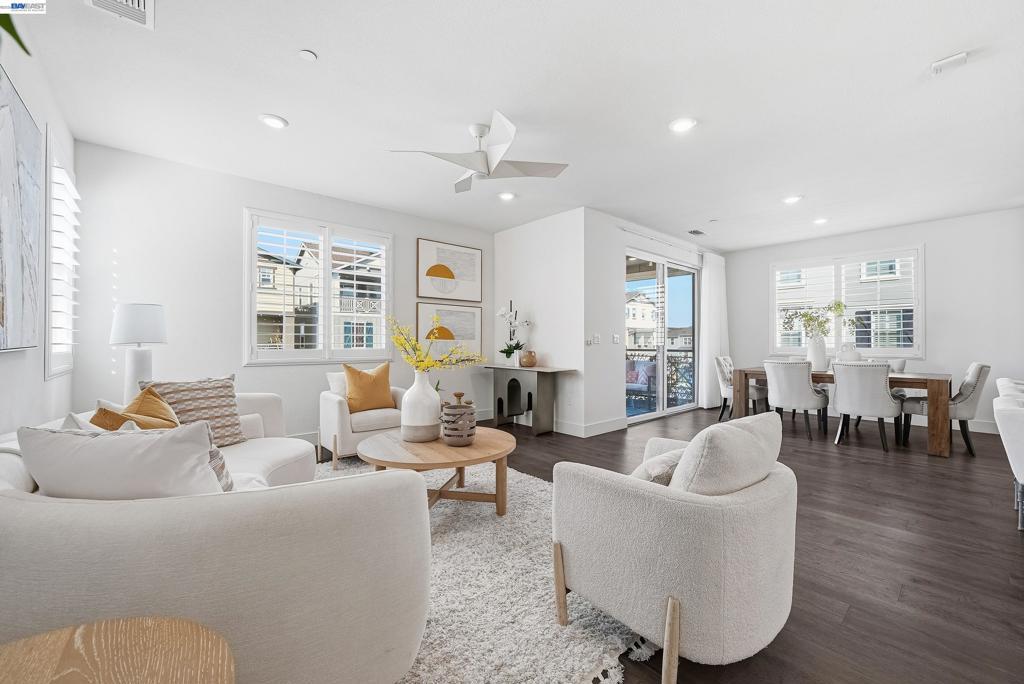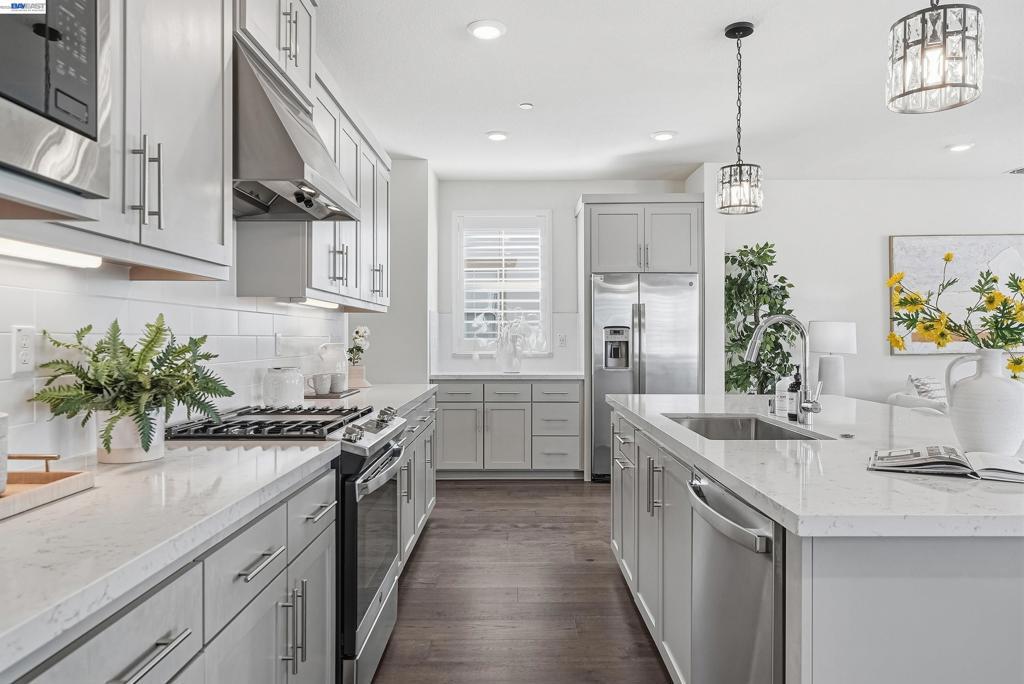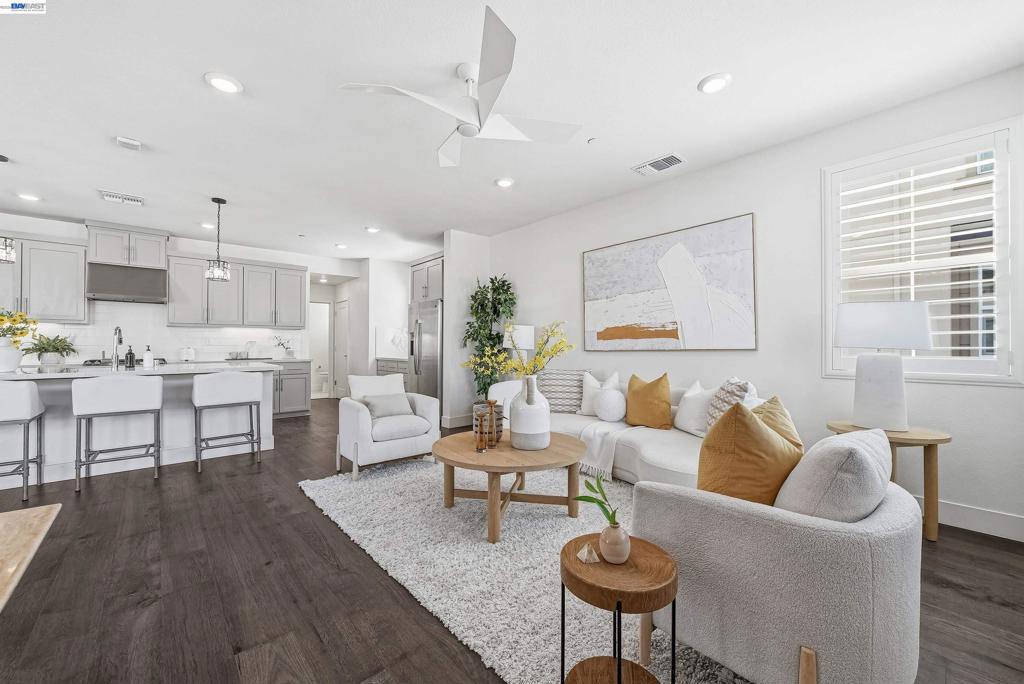 Nestled in the Bridgeway community, this corner-lot residence redefines luxury with its sought-after Bungalows Plan 2 layout. The home offers 4 B/4.5B. One standout feature is the ground-floor suite, complete with its own private entrance, cozy living area, kitchenette, and dedicated laundry room. It is ideal for hosting guests, accommodating extended family, or creating a serene retreat. Upstairs, the master suite is a sanctuary in its own right, bathed in natural light and boasting a custom-designed walk-in closet with a bespoke cabinet system. Another generously sized suite on the second floor adds to the home’s allure, providing both comfort and privacy. Engineered hardwood floors flow throughout, paired with elegant upgraded shutters and Hunter Douglas drapes. The gourmet kitchen features an oversized island with premium finishes, top-of-the-line stainless steel appliances, and a spacious pantry. With two laundry rooms and customized closets, convenience meets luxury at every turn. Enjoy your covered patio and landscaped yard, perfect for morning coffee or evening gatherings. Nearby Don Edwards San Francisco National Wildlife Refuge offers open space with trails and nature to explore. Easy access to the Dumbarton Bridge and I-880.