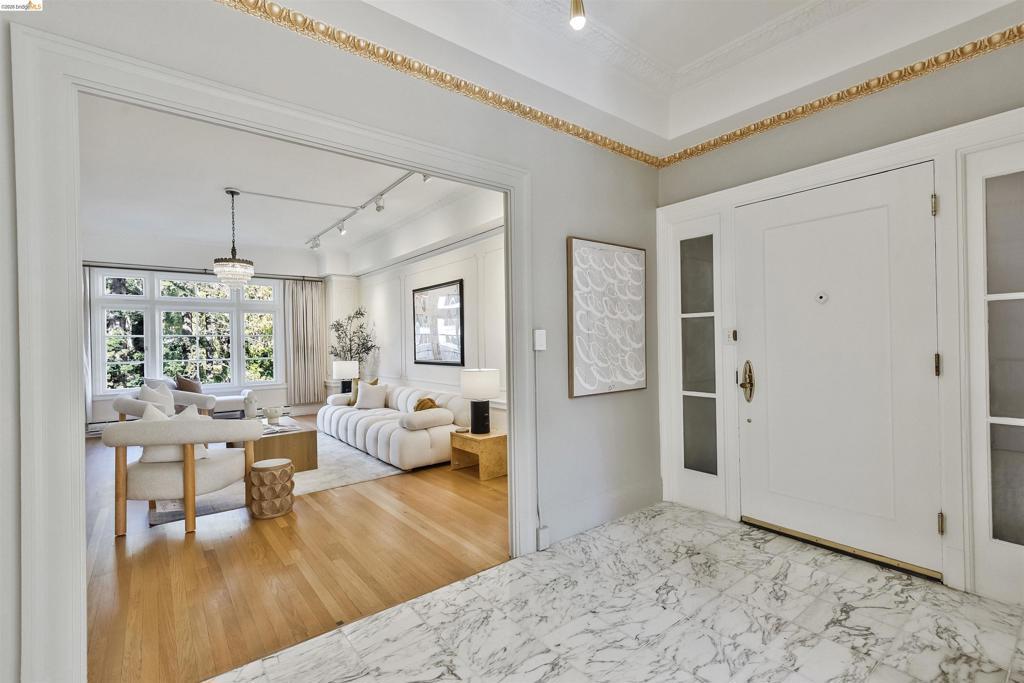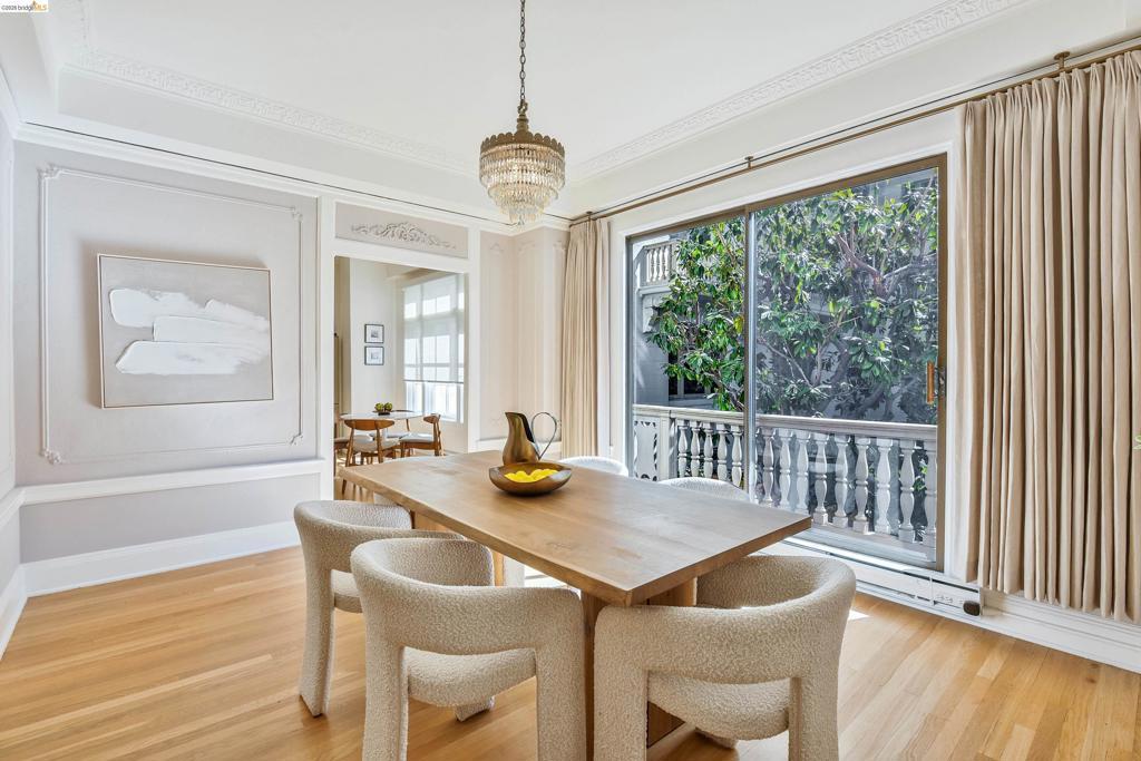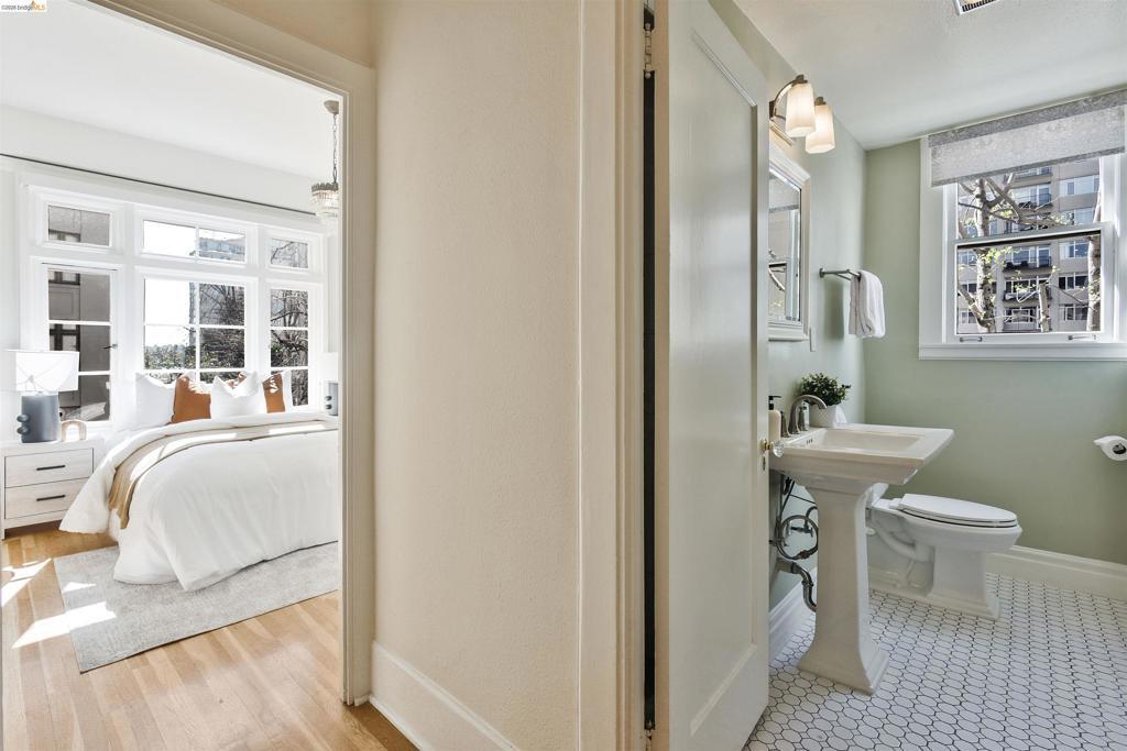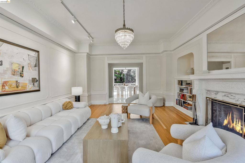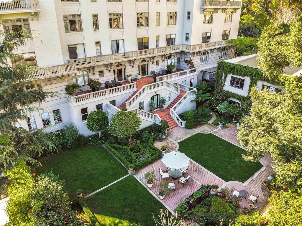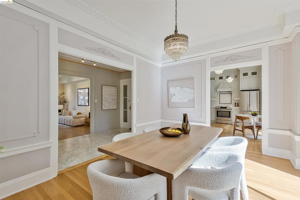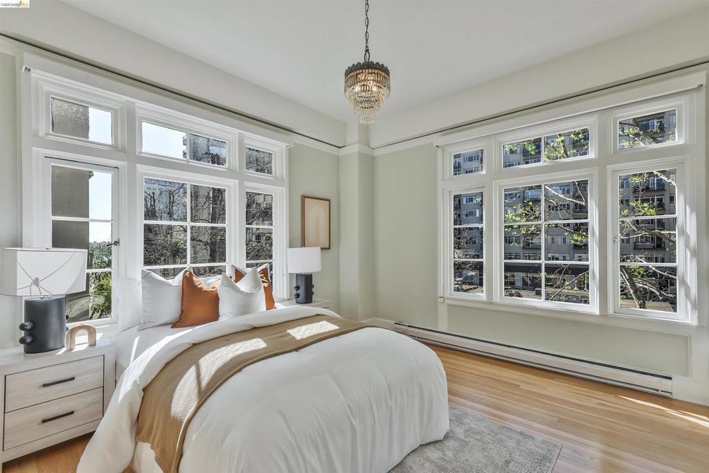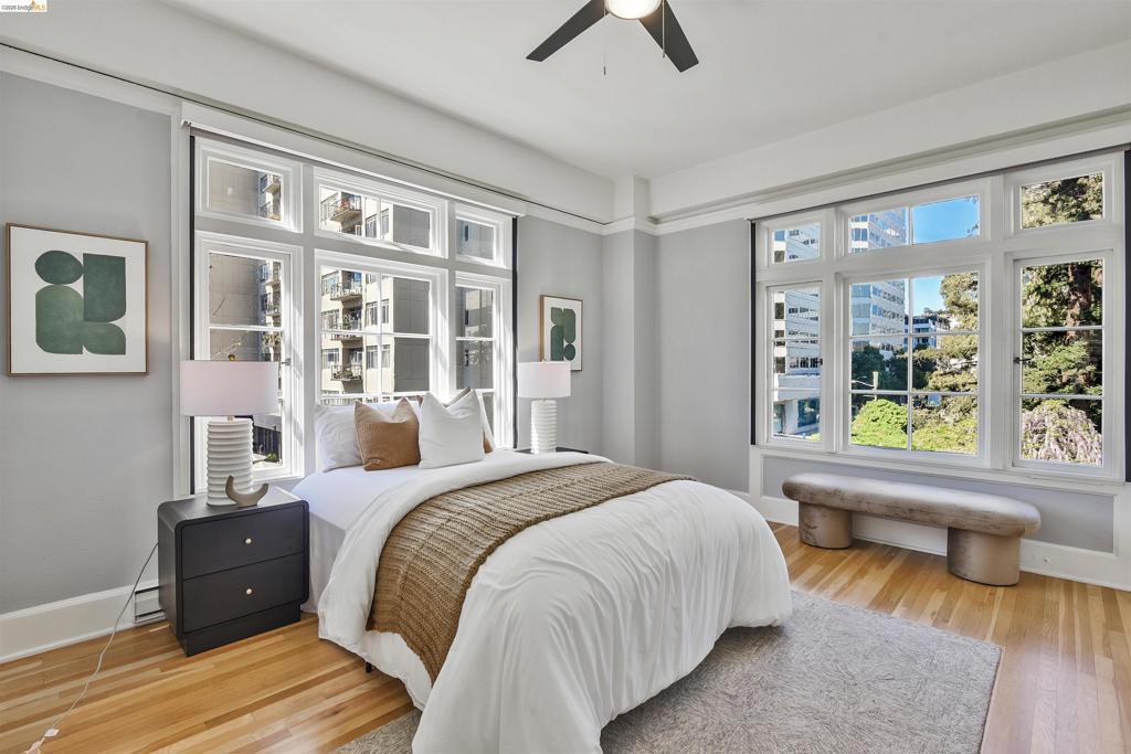 The Regillus is a 1920s Beaux Arts luxury condo building on Lake Merritt. The grand marble lobby leads to formal gardens and terraces with sweeping views of the lake. HOA includes attendant reception desk, insurance, security with closed circuit cameras, internet and cable TV, water/sewer, trash, laundry, building management, maintenance and cleaning staff. Close to Whole Foods, Trader Joe's and a 5-minute walk to BART. This spacious 2-bedroom, 2 bath 1379 sqft condo features 10 ft ceilings and has been renovated preserving ornate detail with four vintage deco crystal chandeliers. A marble foyer leads into the spacious formal living room with grand, wood-burning fireplace. To the left is a formal dining room. The large, renovated custom kitchen has quartz counters, herringbone backsplash, and custom soft-close cabinetry. Bathrooms have been renovated yet still honor the original 1920s period. Updated electrical panel. This elegant condo features refurbished, white oak hardwood floors with original, large multi-paneled windows on three sides of condo letting in lots of light. Custom window coverings include Belgium linen curtains and motorized black out shades. Includes one garage parking space and private storage room.