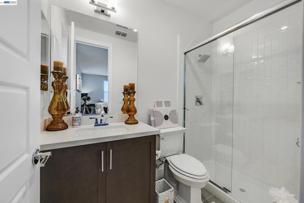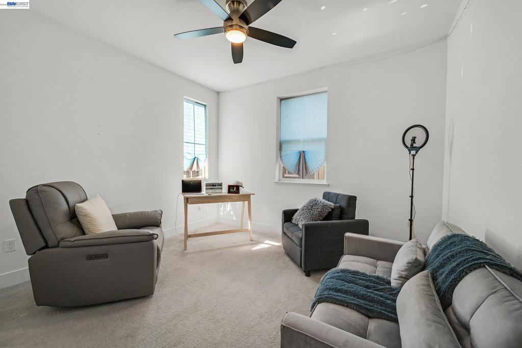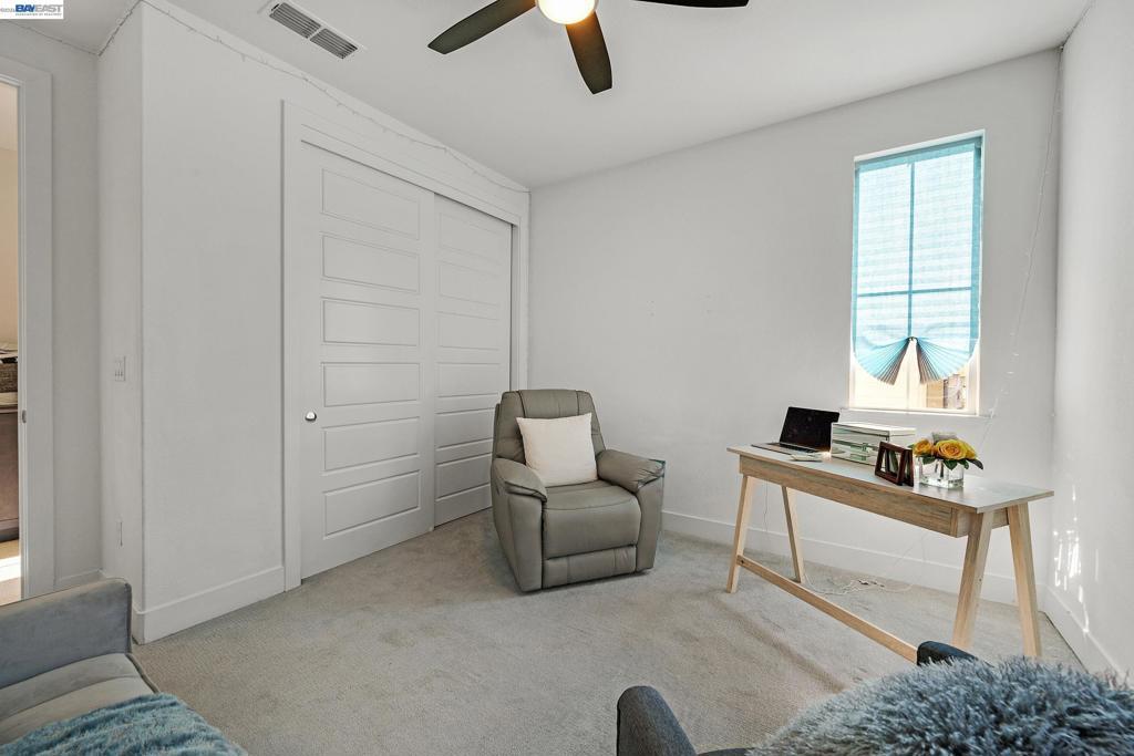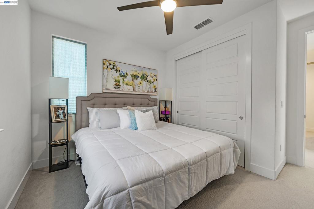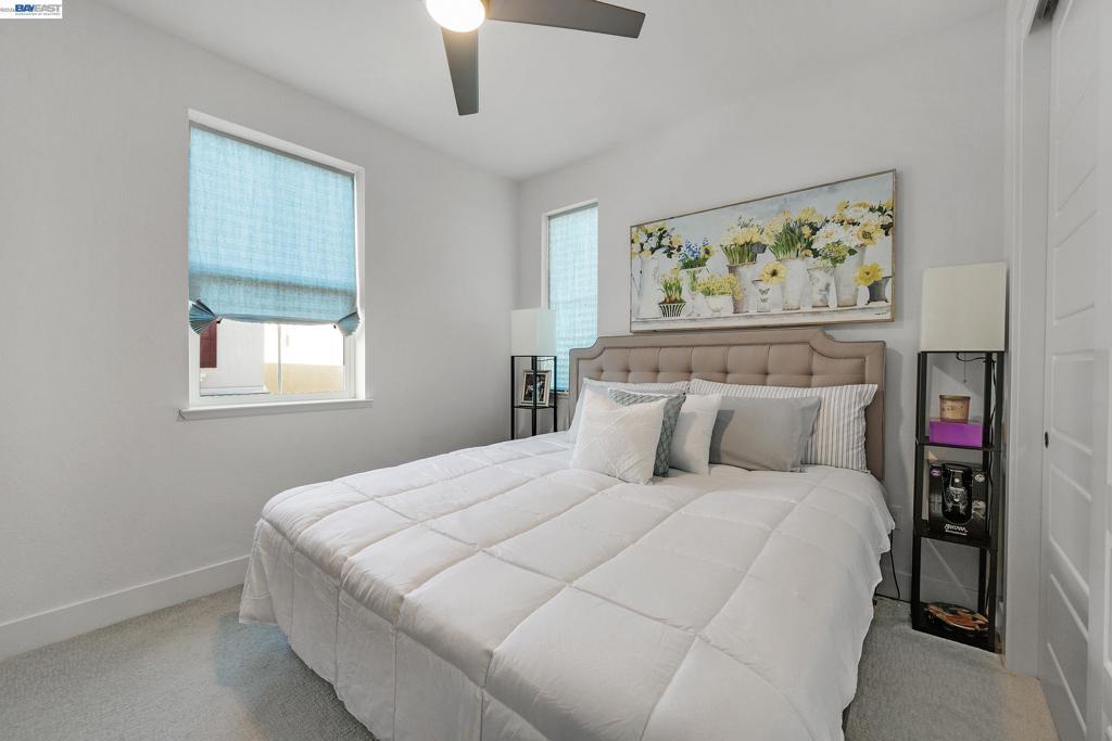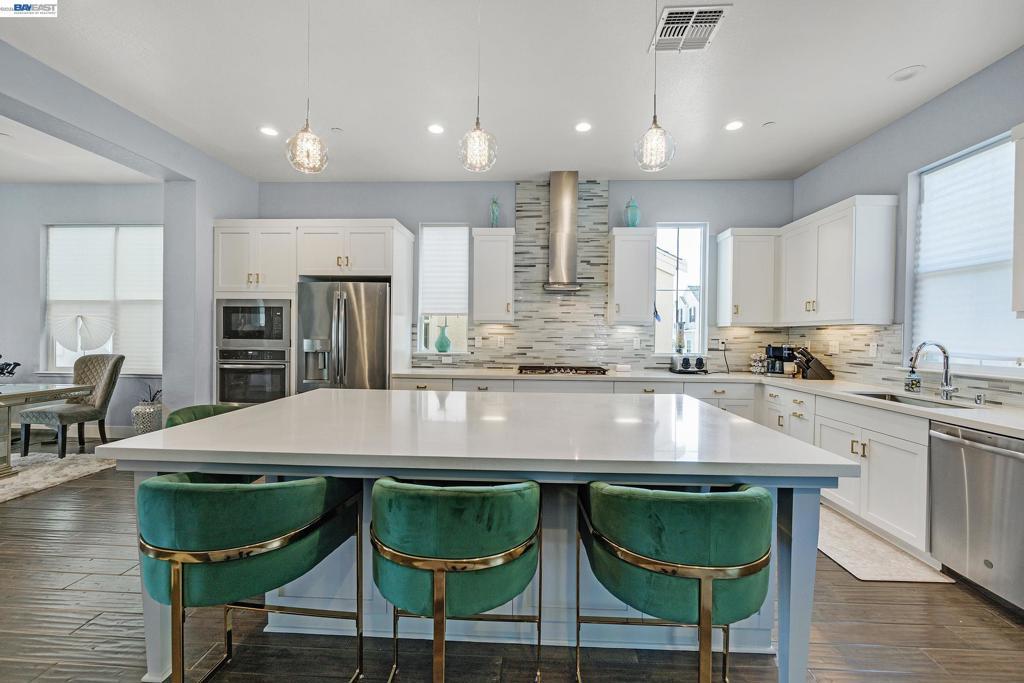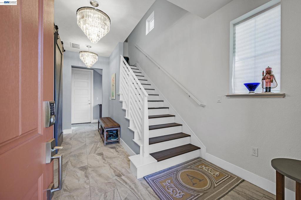 Don't miss the opportunity to live in one of Dublin's most desirable and sought after gated communities, Wallis Ranch. Suburban feel with urban amenities this 4 bedroom 3.5 bathroom home has been beautifully upgraded and welcomes you into the elegant entryway with two glittering crystal chandeliers. Gorgeous custom barn doors surround the entry to a large 2nd living room or forth bedroom/office with full bath and walk-in closet. To your right is a customized hardwood staircase leading up to the second floor with an open floor plan and casual elegance that abounds. Dark hardwood flooring a large living room with stone wall, electric fireplace, and dining space awaits you. The generous sized kitchen has been professionally and beautifully painted in a pristine white with champagne gold fixtures and has the much sought after large island and pantry. The adjoining space has room for a large dining table for entertaining or family gatherings or as displayed in the photos, pool anyone? Enjoy the view of the mountains from your second floor balcony or from the windows of the large primary suite which you will find on the third floor along with two additional bedrooms, 2 full baths, a laundry room and much more. Absolutely a must see!
