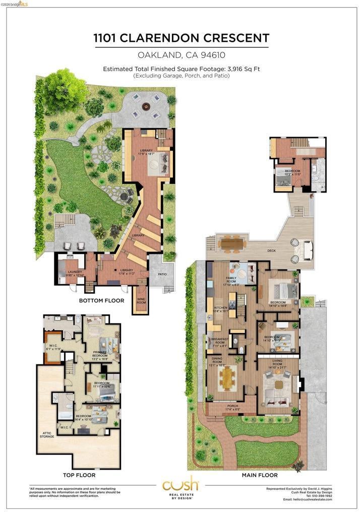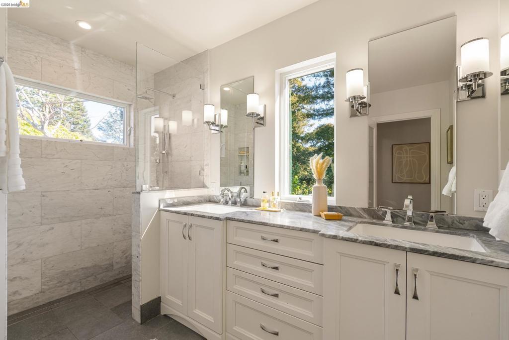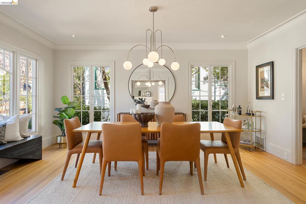 Crocker Highlands at its finest. A rare three-level home on one of the neighborhood's most coveted blocks, 3,900 sq ft of thoughtful design, enduring character & effortless livability. The main level opens to a light-filled living room w/ fireplace & built-in bookshelves, a formal dining room, & an eat-in kitchen anchored by a Lacanche range, stone counters & a sunny breakfast nook. The adjoining den flows to generous decks overlooking private gardens w/ lemon & plum trees. Two additional bedrooms & a powder room complete this floor. Upstairs, all bathrooms have been fully renovated. The primary suite features vaulted ceilings, a walk-in closet & a spa-like bath w/ dual vanities & frameless glass shower. Two additional bedrooms both w/glimpses of the Bay share a sleek hall bath. The lower level offers a writer's retreat w/ cork floors, bird's-eye maple desk, built-in library & a wall of windows onto the garden — an exceptional home office space, plus a dedicated laundry room & wine cave. A dedicated staircase leads to a private en-suite bedroom w/ deck access. Steps from award-winning Crocker Highlands Elementary. Minutes to the best of Grand Lake shops and restaurants, Lake Merritt & Bay Bridge access to SF.