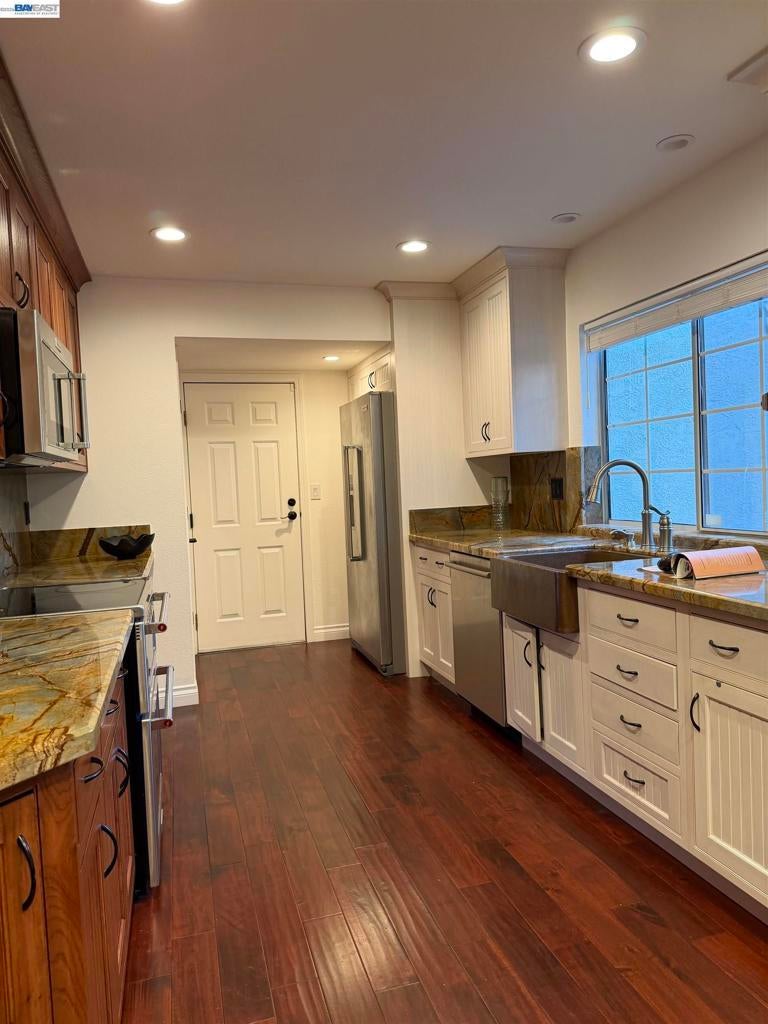 Incredible 2-bed 2-bath townhome in the Kildare complex. Total remodeling costs are approximately $200K. Designed with unique, high-quality custom upgrades and meticulously remodeled throughout, highlighted by beautiful engineered wood plank flooring, the Fabulous newer kitchen features impressive custom-built cabinets that extend into the dining and living rooms, providing ample storage. highlighted by top_of the-line, artistically designed granite countertops. Stainless steel appliances feature a double oven, electric stove, matching microwave, double door refrigerator, and a rare, unique copper farmhouse sink; a class door has been added to the pantry. The beautiful wood staircase flows to the 2nd level. The den at the top of the stairs is a great place for an office. 1-car garage and 1 assigned car space. A new tankless electric water heater was added. close to freeways, park. and restaurants. Complex with pool, spa, and basketball court. water and garbage are included in the HOA fee.