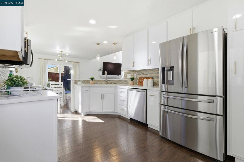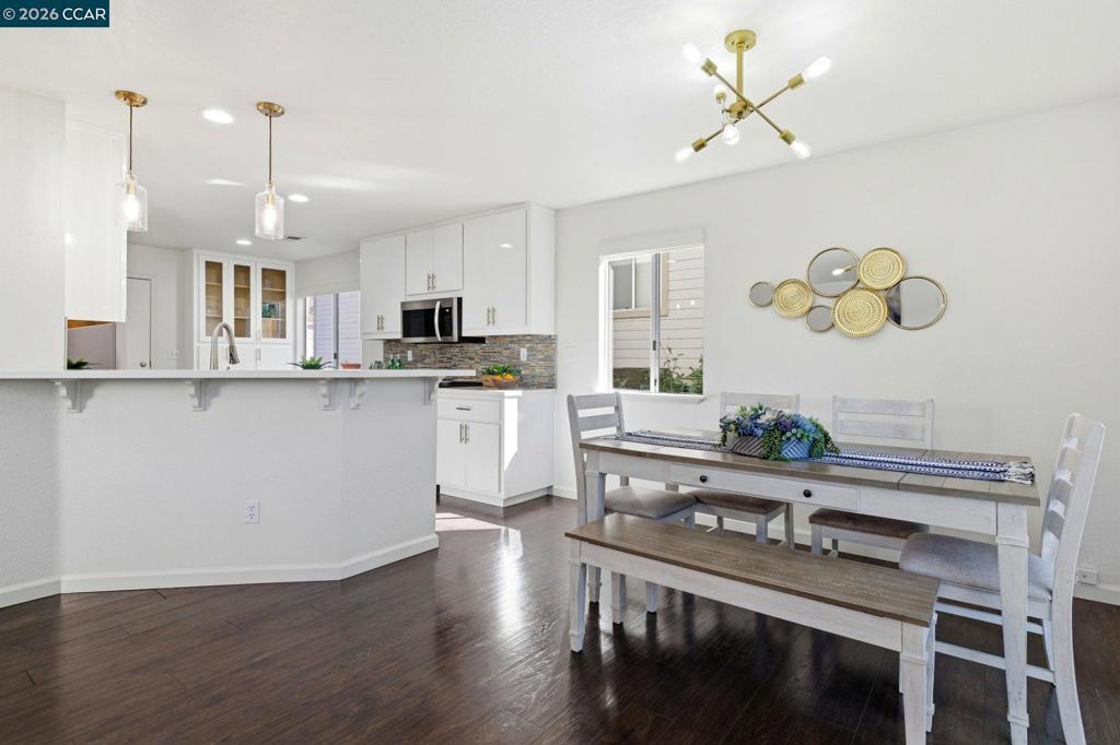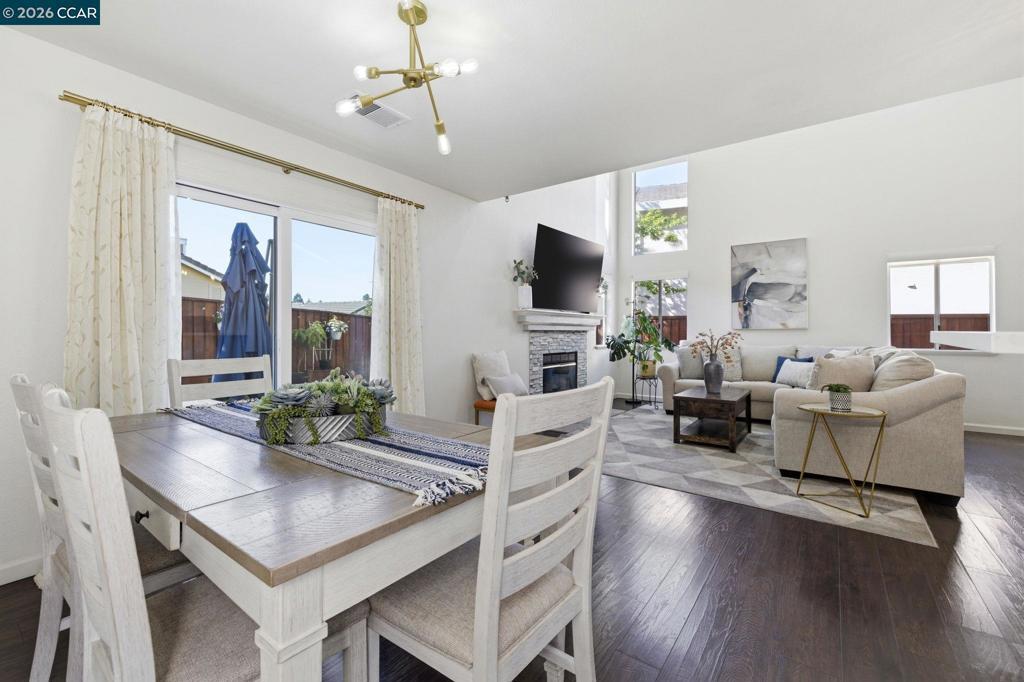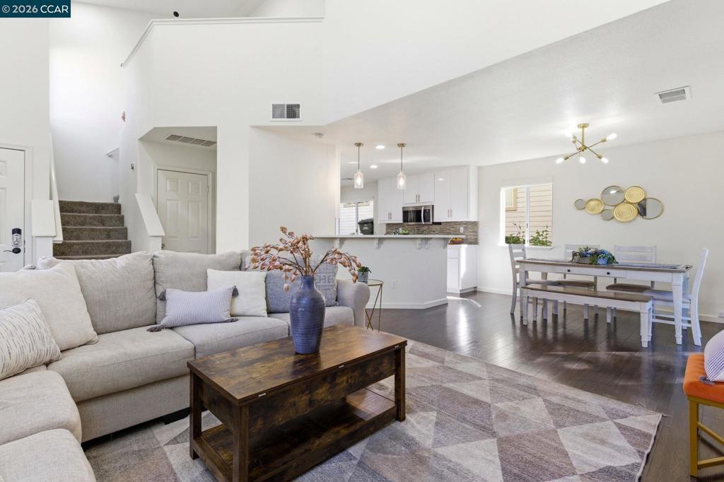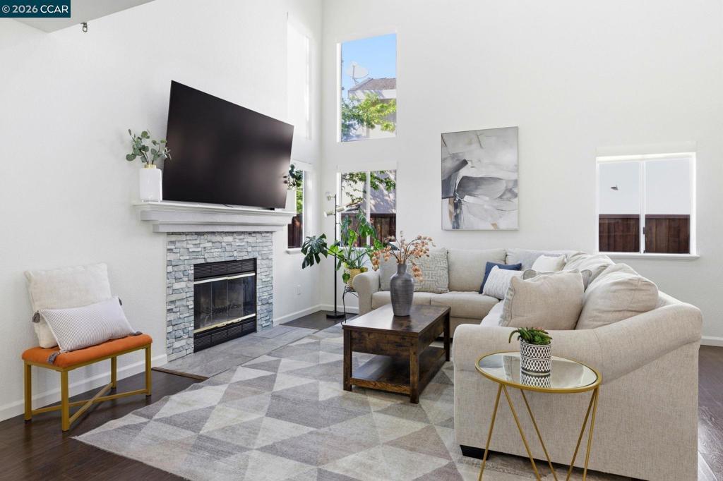 Remodeled kitchen, vaulted ceilings & bright open living spaces highlight this updated Parkside neighborhood home with access to a community pool, playground & basketball courts. Oversized windows fill the living spaces with natural light while the open layout supports everyday living. Wide-plank flooring runs through the main living areas while a stacked-stone fireplace anchors the living room. Updated lighting with smart switches adds modern convenience throughout. The kitchen serves as the central hub with white cabinetry, quartz countertops, stainless appliances & glass tile backsplash, plus a breakfast bar with pendant lighting, opening to the dining & living areas. The primary suite offers a retreat with a large window overlooking mature trees & ensuite bath with dual sinks. Two bedrooms feature vaulted ceilings & large windows for natural light & flexible guest or office space, served by a hall bath with modern fixtures, while a powder room adds convenience on the main level.Outdoor living extends to the backyard with a patio finished with Italian pavers for dining, relaxing or entertaining. The yard includes a B-hyve smart sprinkler system. Served by highly rated Morello Park Elementary and located near parks, shopping & major commuter routes.