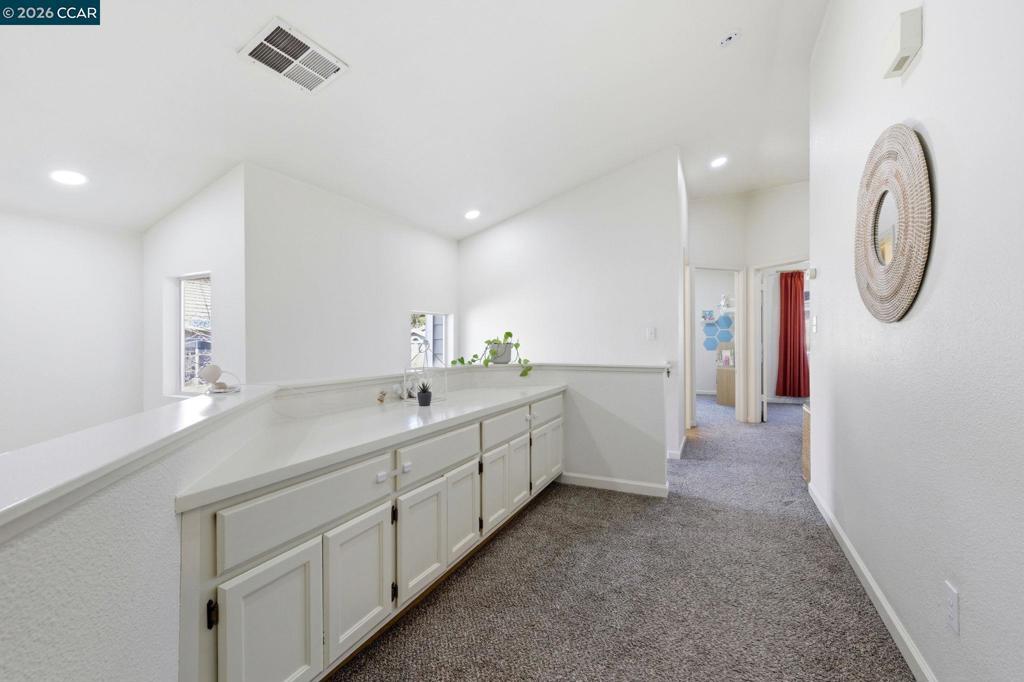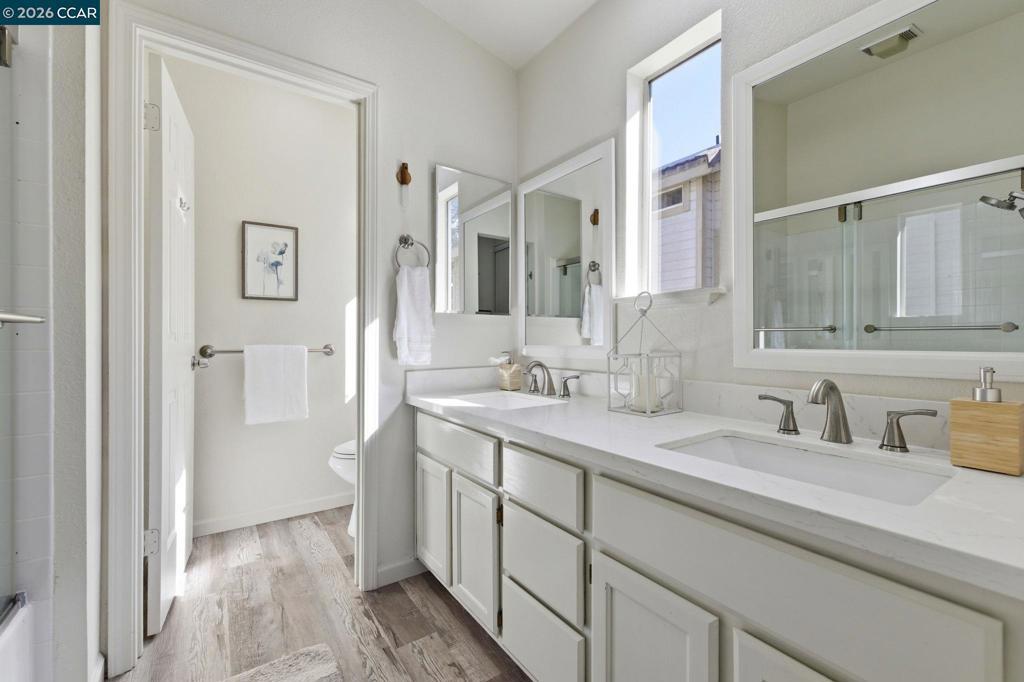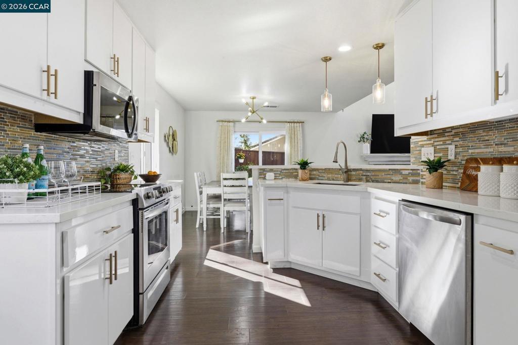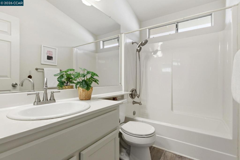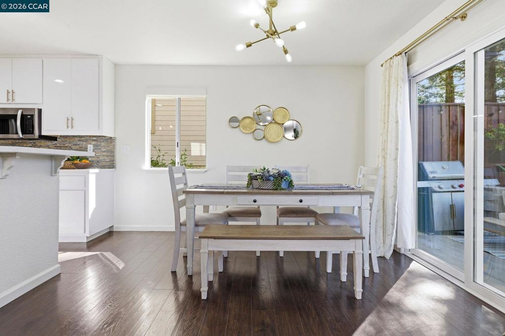 Remodeled kitchen, vaulted ceilings & bright open living spaces highlight this updated Parkside neighborhood home with access to a community pool, playground & basketball courts. Oversized windows fill the living spaces with natural light while the open layout supports everyday living. Wide-plank flooring runs through the main living areas while a stacked-stone fireplace anchors the living room. Updated lighting with smart switches adds modern convenience throughout. The kitchen serves as the central hub with white cabinetry, quartz countertops, stainless appliances & glass tile backsplash, plus a breakfast bar with pendant lighting, opening to the dining & living areas. The primary suite offers a retreat with a large window overlooking mature trees & ensuite bath with dual sinks. Two bedrooms feature vaulted ceilings & large windows for natural light & flexible guest or office space, served by a hall bath with modern fixtures, while a powder room adds convenience on the main level.Outdoor living extends to the backyard with a patio finished with Italian pavers for dining, relaxing or entertaining. The yard includes a B-hyve smart sprinkler system. Served by highly rated Morello Park Elementary and located near parks, shopping & major commuter routes.