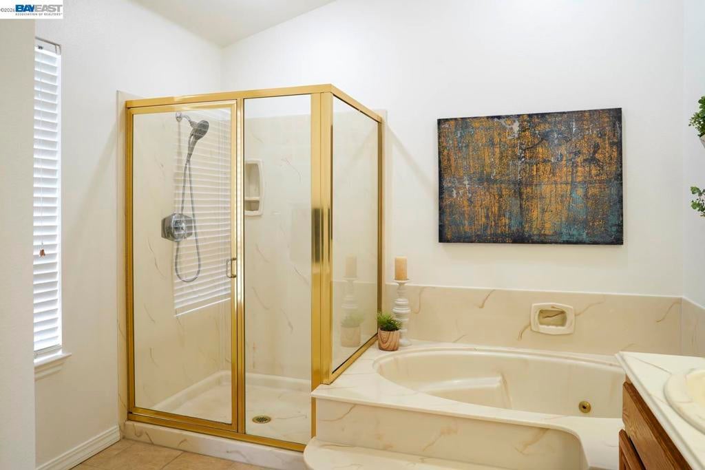 Schools: John Sinnott-9, Rancho Milpitas Middle-9, Milpitas High-9. Shapell Hillcrest Estate single family home on 6,565sf lot at base of foothills 3-car garage. No HOA. Vaulted & high ceilings combined w/many large windows throughout the home produces a bright & airy feel. Breakfast nook w/bay window & vaulted ceiling. Kitchen quartz slab countertop & tall backsplash ample cabinets, under cabinet lighting, large deep stainless sink, garden window, w/view of backyard, natural gas range, double oven, marble tile floor. Family room w/gas fireplace & slider to large aggregate patio. Ground floor bedroom or home office w/own side entrance & full bathroom nearby. Large primary suite has double walk-in closet, cathedral ceiling. En-suite BA has double vanity, jetted soaking tub, plus shower stall, widows for ventilation & separate commode room. Interior laundry room has utility sink. Maple wood floors. Central A/C w/Nest thermostat. Owned 2024 Tesla 6.8Kw solar system, w/2-wall batteries & EV charger. New roll up garage doors, app-controlled belt driven openers, & 4-car wide driveway. Landscaping & patio are designed for easy low maintenance. Separate fan switches in 2 BAs & laundry. LED lights. Short stroll (5 houses) to Ben Rodgers Park. Underground utilities