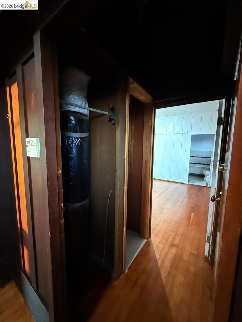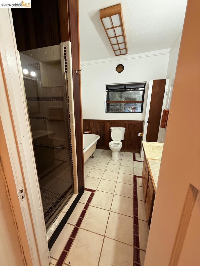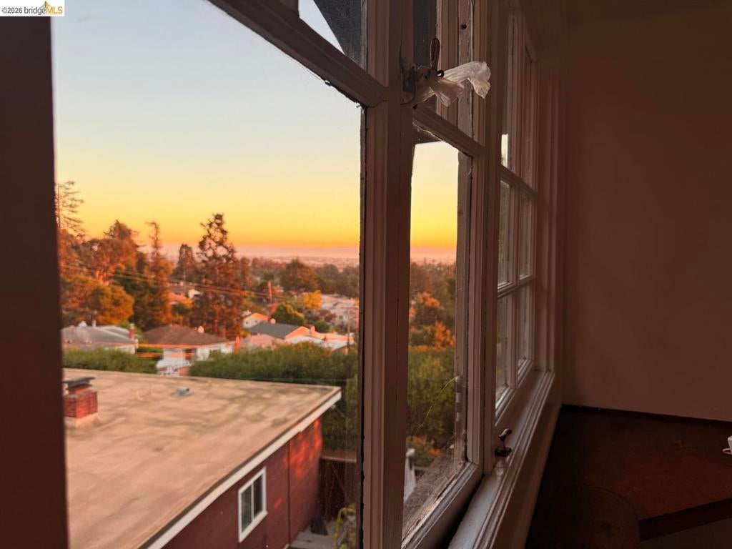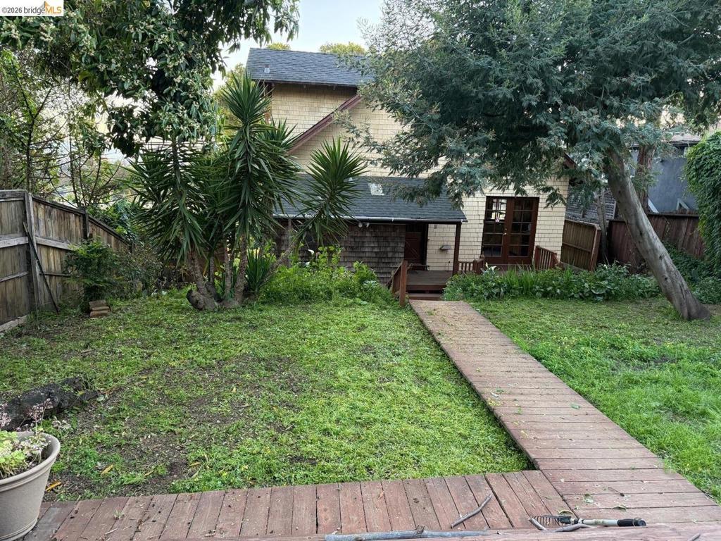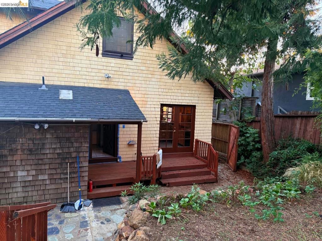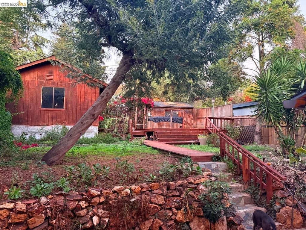 This is an opportunity to restore and customize a property, located in the Redwood Heights area in the Oakland Hills. Property includes a private yard with a Meyer Lemon, Orange, Fig and Avocado tree. Fully fenced and gated through lot, with dual street frontage, creating a property with access from two parallel streets. Additional features include a detached garage that opens from the street area, and has access to the interior of the property. Room for 3 parking spaces on property, plus the garage. There are two wood sheds. Deck with a hot tub. Hardwood floors throughout and tile in kitchen & bathrooms. Working wood fireplace in the living room. Bathroom has a 11' x 7' redwood sauna, a clawfoot bathtub, and shower stall. Decks off the living room & upstairs bdrm have views of the bay, bridges, & sunsets. Unfinished basement area of approx. 600 sf with over 8' high ceilings.